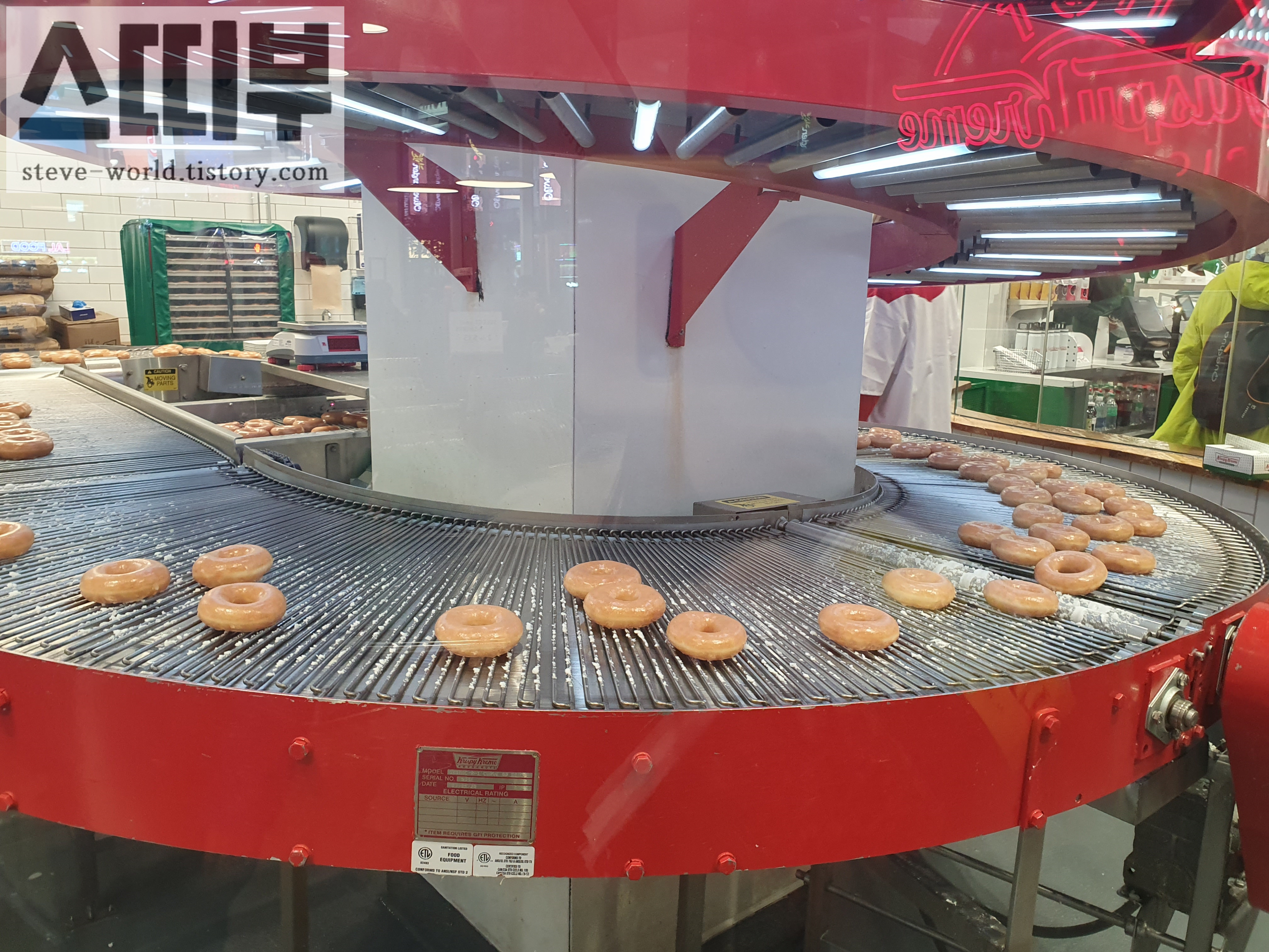 시럽이 묻혀 나오는 글레이즈드 도넛의 최종 공정을 거쳐갑니다.
