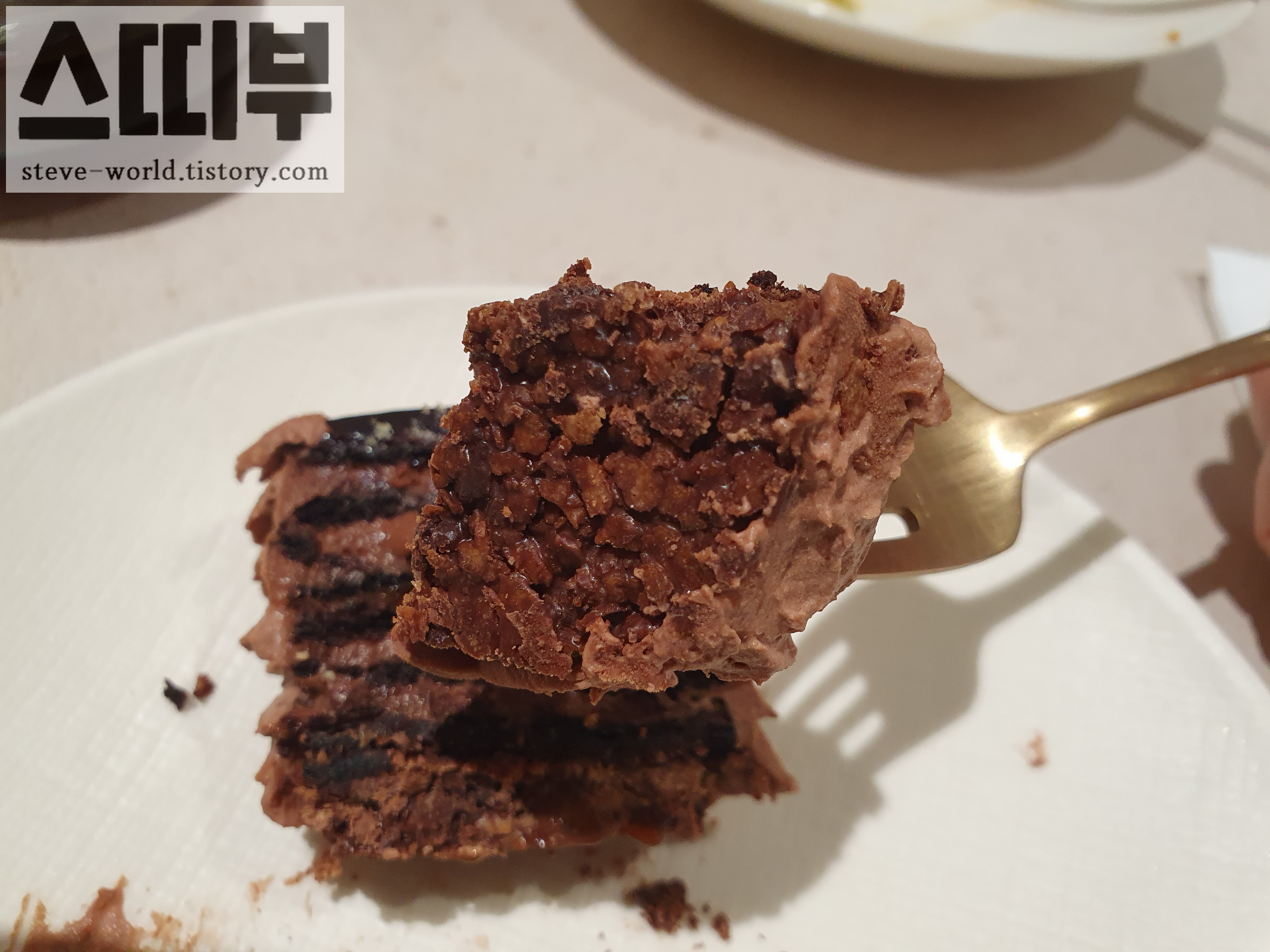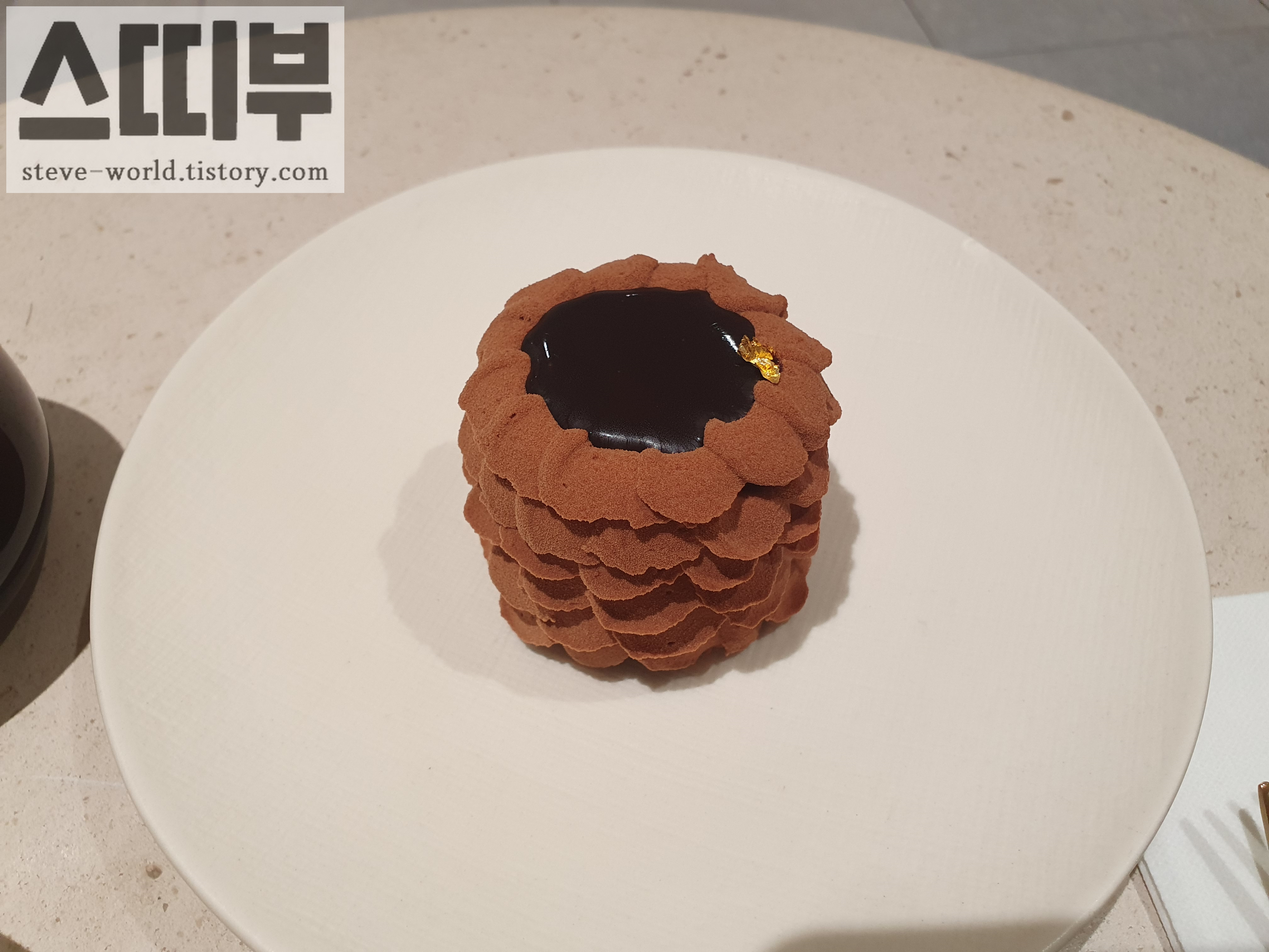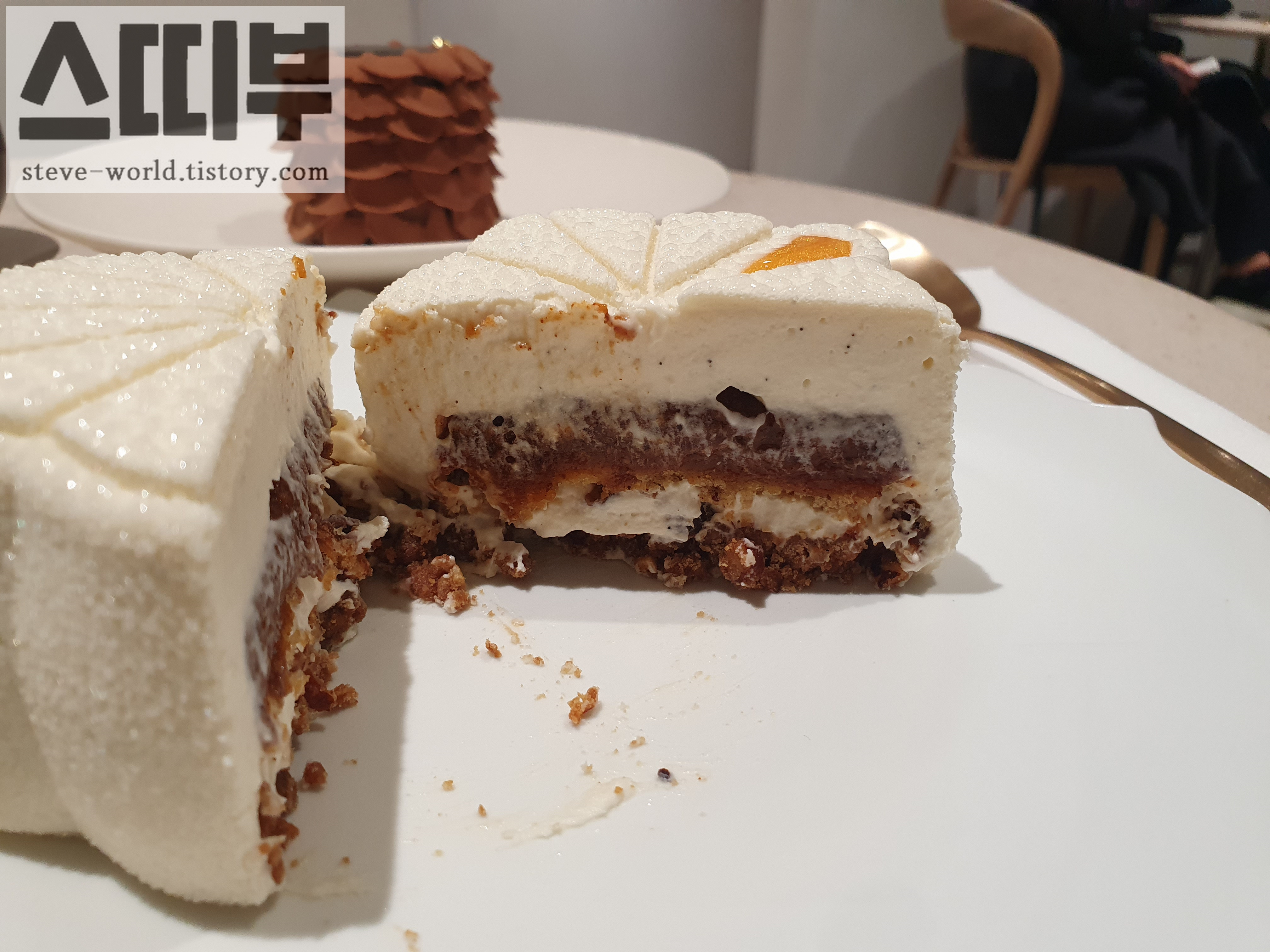 가장 마지막에 먹은 디저트인데, 진한 초코맛 덕분에 마지막 순서로 먹은 것이 탁월한 선택이었습니다. 쌉쌀한 카카오 함량 높은 초콜릿부터 부드럽고 달콤한 초콜릿 크림까지 온갖 맛있는 초콜릿이 층층이 쌓았습니다. 가장 밑바닥은 자갈을 모아 만든 것처럼 단단한 알갱이들을 모아 붙여 만든 것처럼 보였습니다. 부드럽고 진득한 초콜릿 파티가 입 속에서 끝날쯤 짭짤 달콤한 맛을 내면서 오도독한 식감이 마무리해 줍니다. 앞서 먹은 두 케이크와는 다른 전개가 좋았습니다. 얇은 층 사이사이 초콜릿 시트가 있어서 크림의 부드러운 식감과는 좀 다르게 느껴졌습니다.