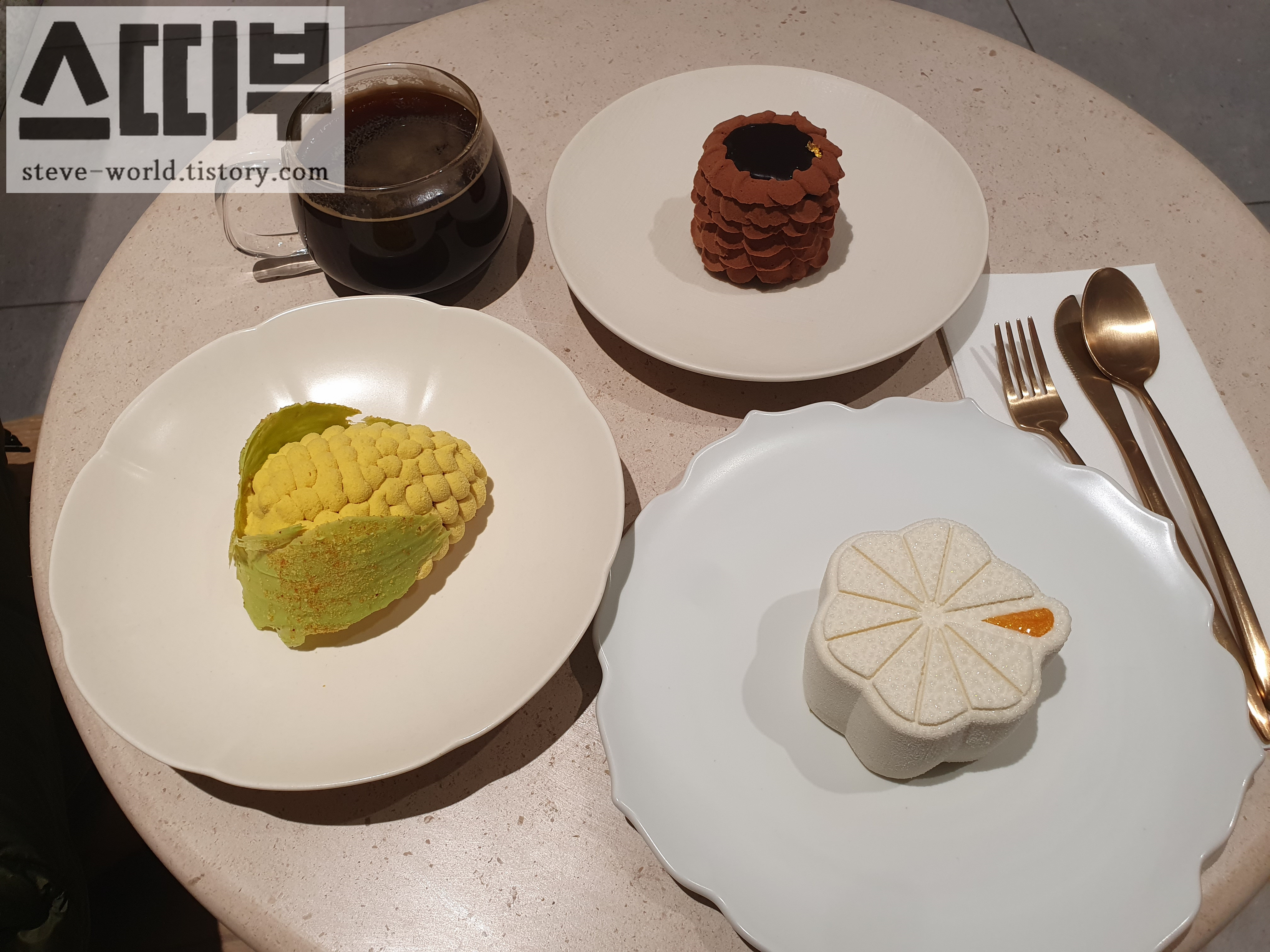 옥수수 모양의 디저트 Corn을 기준, 시계방향으로 V.I.C와 Lysée입니다. 사진으로 보던 것보다 실제로 보니 정말 예뻤습니다. 22년 11월 가격 기준, tax와 tip 포함 총 70.24달러 결제했습니다.