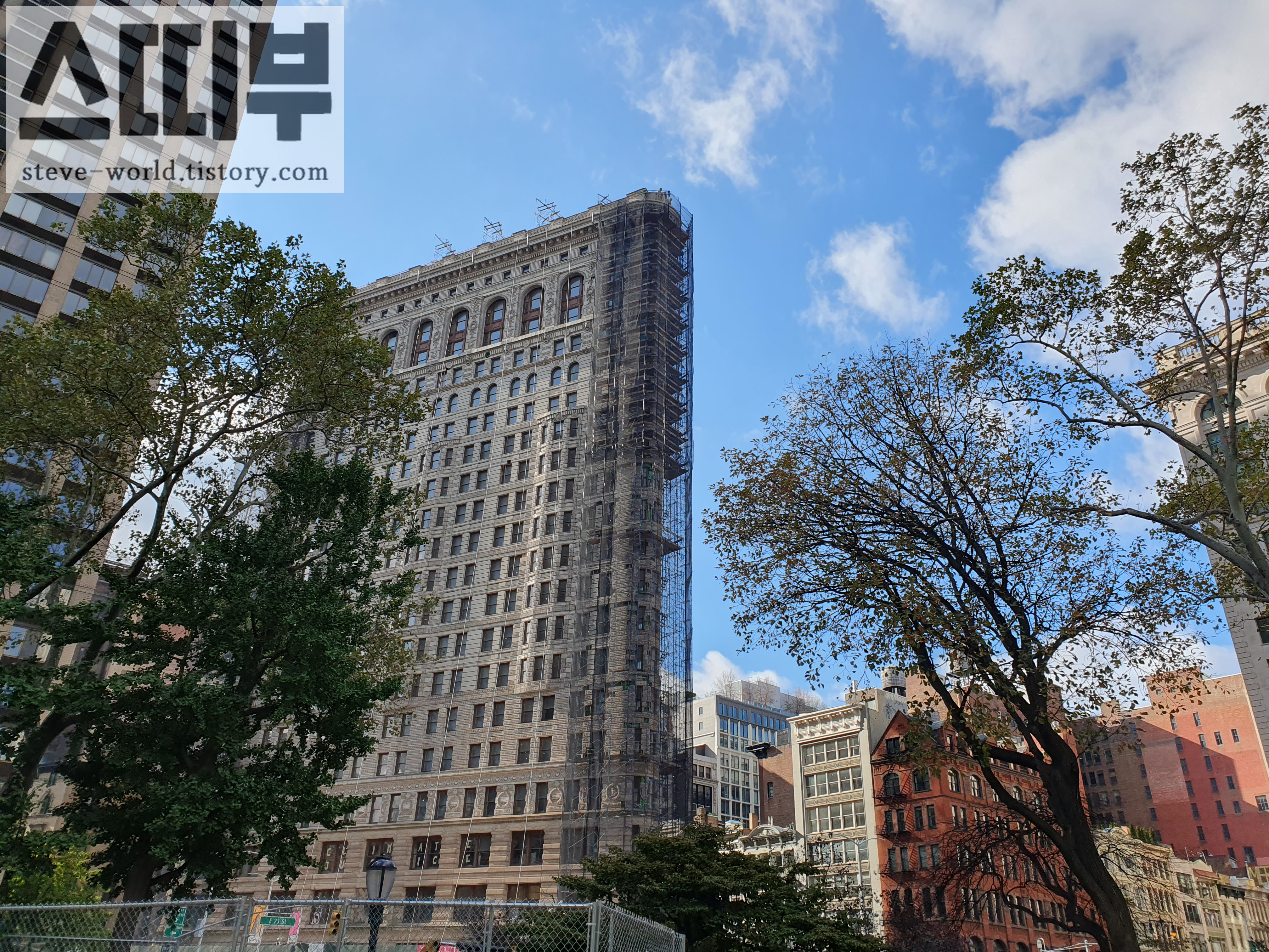 플랫 아이언 빌딩은 그 시대의 다리미(Flat iron)을 닮았다 하여 붙여진 이름의 빌딩입니다. 5번가와 브로드웨이가 교차하면서 생기는 좁은 삼각형의 공간에 설계된 특별한 외관의 빌딩입니다. 뉴욕에 오면 꼭 봐야 할 건축물 중 하나가 바로 이 플랫 아이언 빌딩입니다. 예전에 플랫 아이언 빌딩을 중심으로 일몰을 찍은 사진을 본 적이 있는데 무척 아름다웠습니다. 제가 방문할 당시 공사 중이어서 조금 아쉬웠습니다.