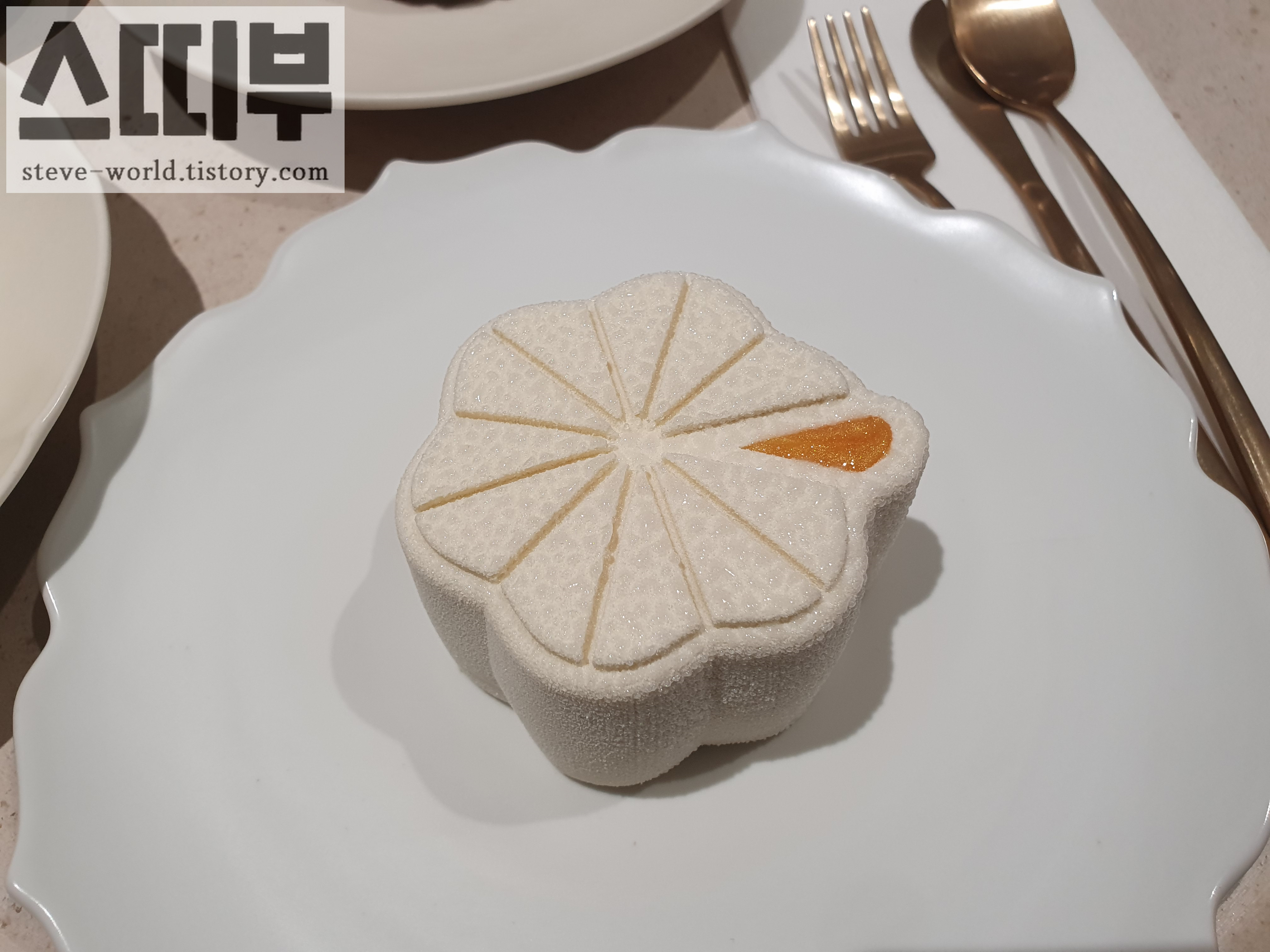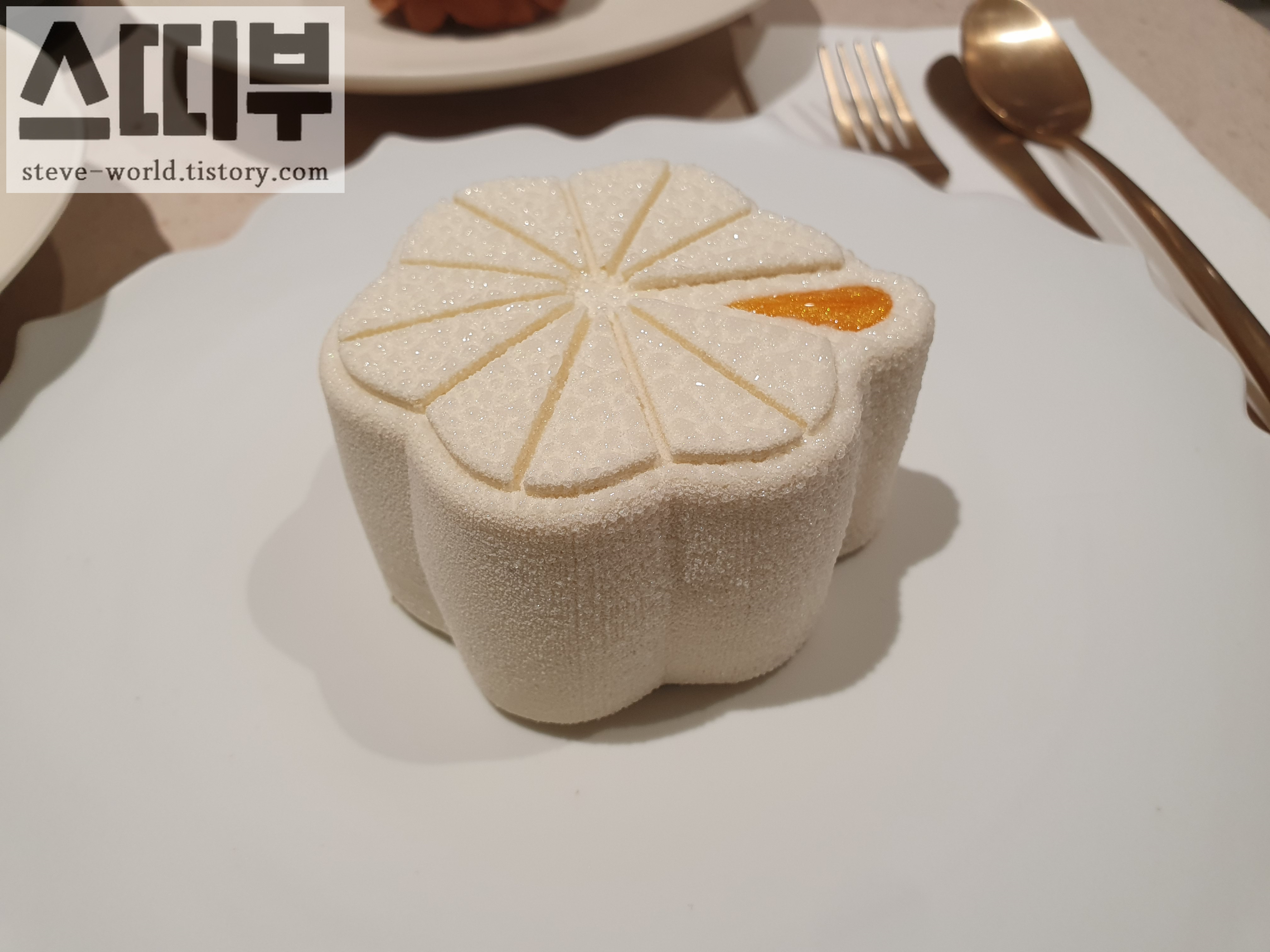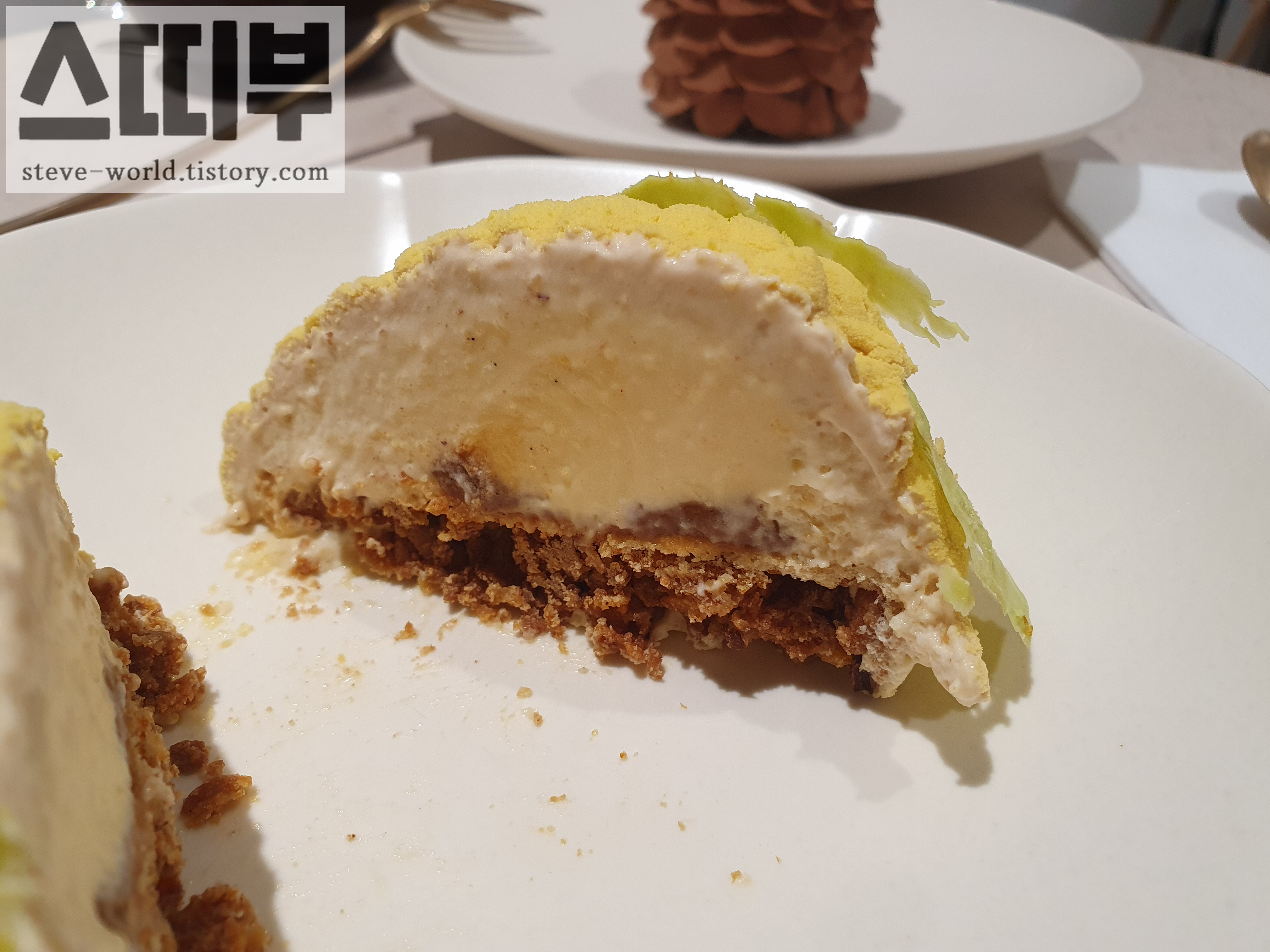한국에도 옥수수 맛의 디저트가 꽤 있는데, 그런 옥수수의 '단맛'을 강조하기보다는, '옥수수 자체의 맛'과 가까웠습니다. 옥수수 크림이 상당히 가볍게 느껴지는데, 디저트 자체도 약간 차가워서 아이스크림처럼 느껴지기도 했습니다. 아무래도 가볍고 부드러운 크림층이 입에서 먼저 녹아 구수한 옥수수 맛이 나고, 마지막에는 딱딱한 바닥의 크러스트 층이 씹히는데, 그 크러스트 층의 짭짤한 부분이 옥수수의 맛과 잘 어울렸습니다.