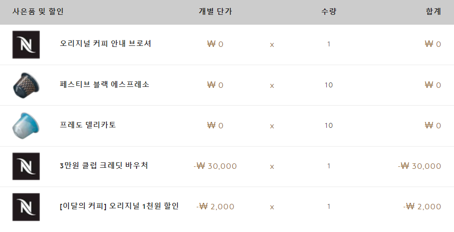 5가지 캡슐(총 50개)을 구입하려고 보니, 클럽 크레딧(네스프레소 기기 배송시 함께 온 3만원 바우처)를 쓰려면 오리지널 커피 100캡슐 이상 구매시 사용가능하다는 조건이 있어서 뭘 더 사야하나 고민했습니다.