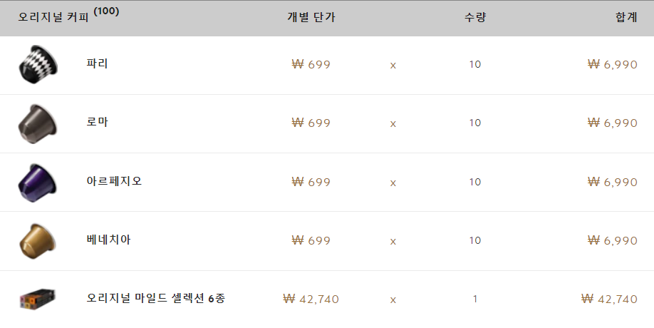 그 중에 오리지널 마일드 셀렉션 6종이 가장 마음에 들었습니다. 오리지널 마일드 셀렉션 6종은 리반토, 볼루토, 코지, 부에노스아이레스 룽고, 비엔나 룽고, 콜롬비아 총 6종의 조합으로 이루어진 세트입니다. 제가 이전에 마셔봤던 맛 중 맛있다고 생각한 맛 4종(리반토, 볼루토, 코지, 비엔나 룽고)이 포함되어 있어서 마일드 셀렉션 6종을 추가로 장바구니에 넣었습니다. 그리고 장바구니에 단품으로 들어있던 볼루토는 삭제했습니다.(오리지널 마일드 셀렉션 6종에 중복)