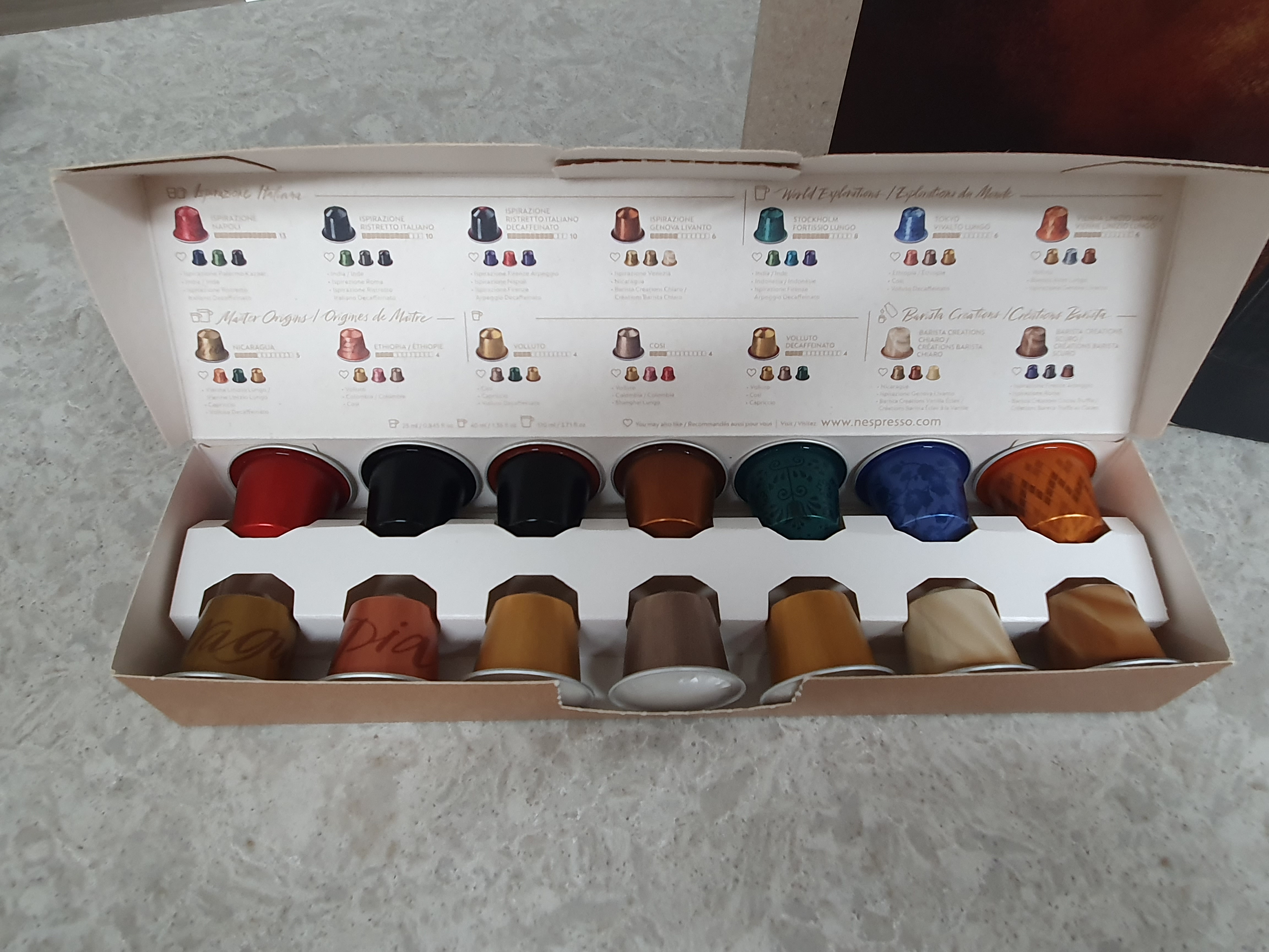 네스프레소 캡슐 패키지도 캡슐마다 다양해서 정말 예쁜 것 같습니다. 찬장에 넣어만 놔도 마음이 풍족해지네요. 그리고, 캡슐마다 유통기한이 조금씩 달라서 인지하고 마셔야 할 것 같습니다.