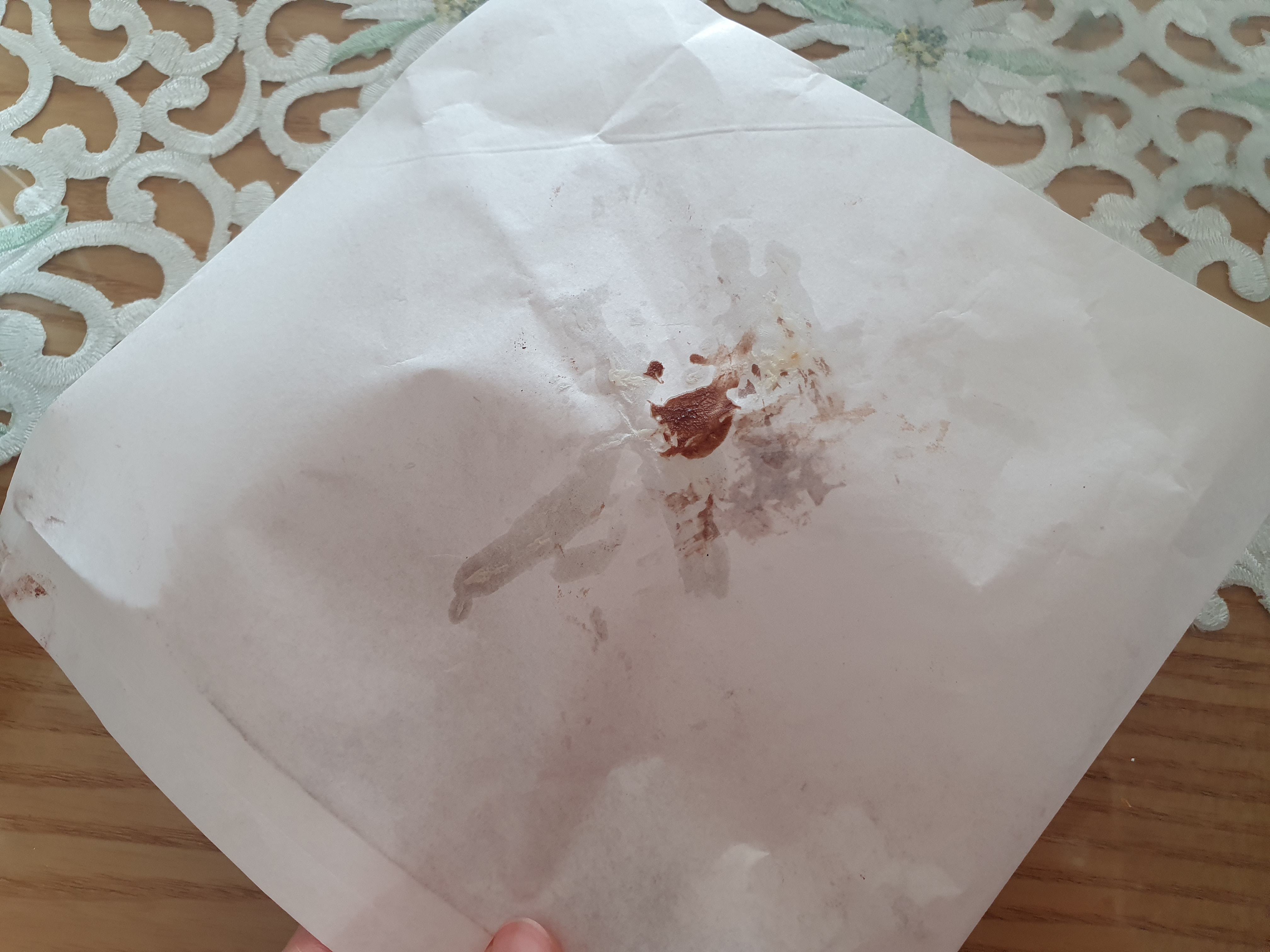 초코크림 크루아상을 포장했던 종이 바닥면에 초코크크림이 묻어있습니다. 포장지만 봐도 초코크림이 얼마나 풍부하게 들어있을지 설렙니다.