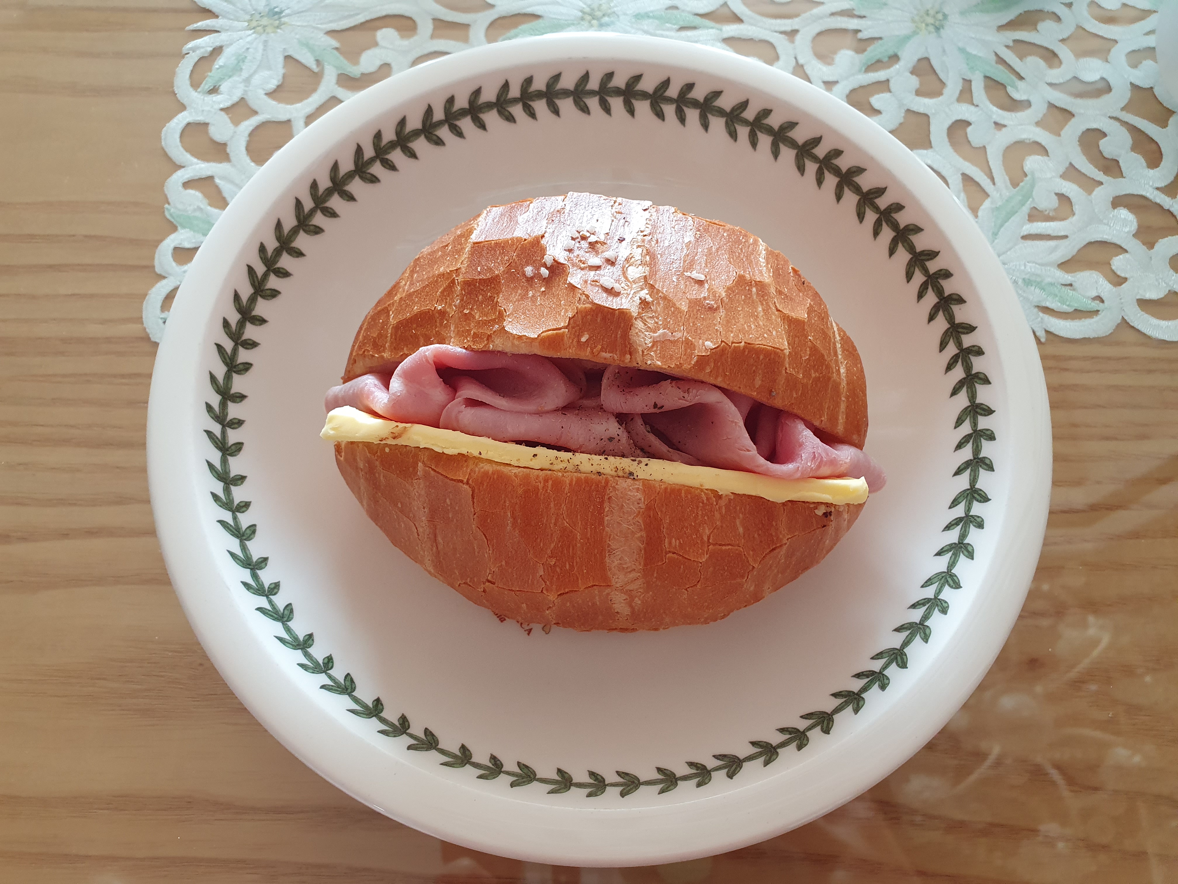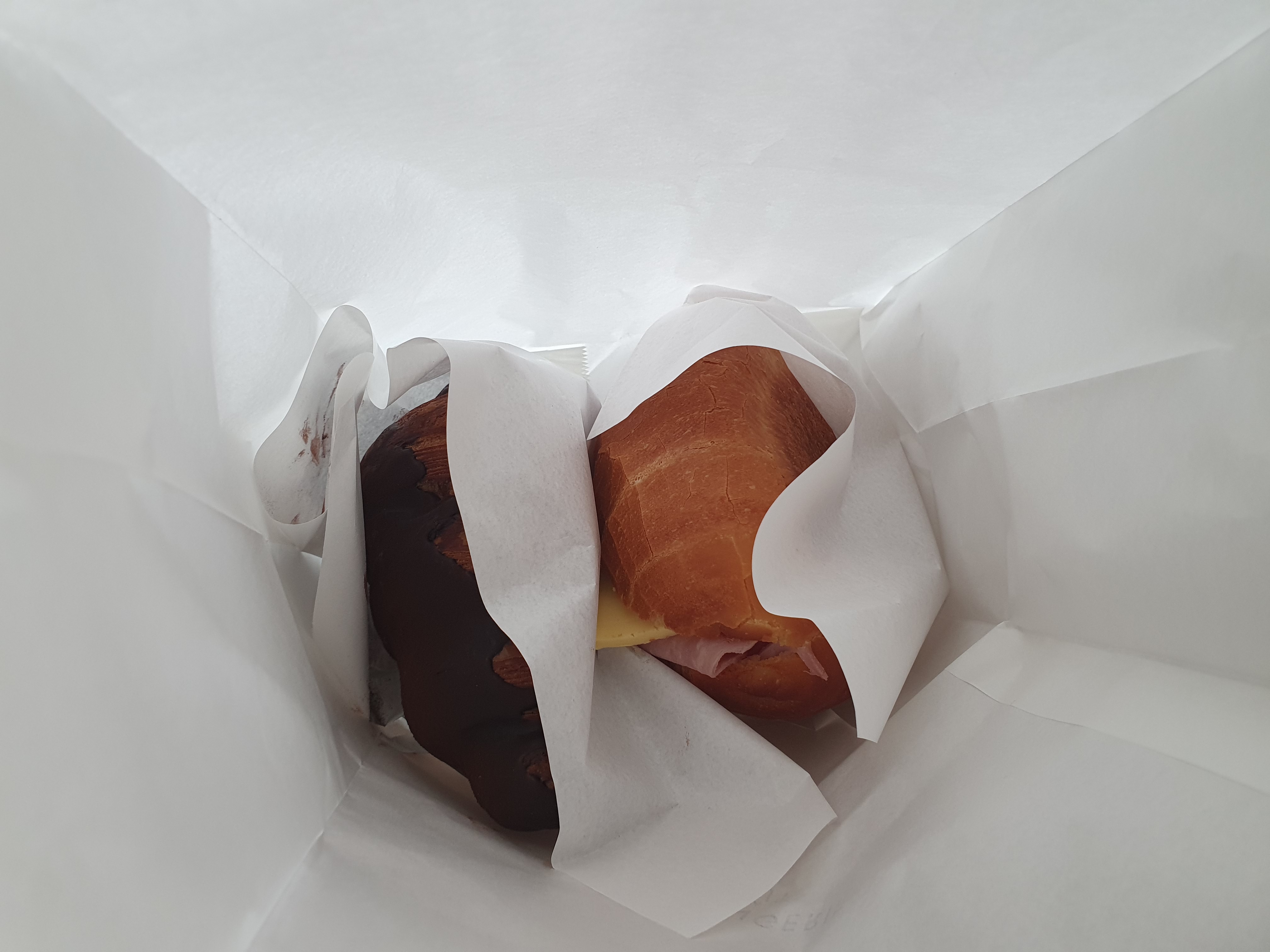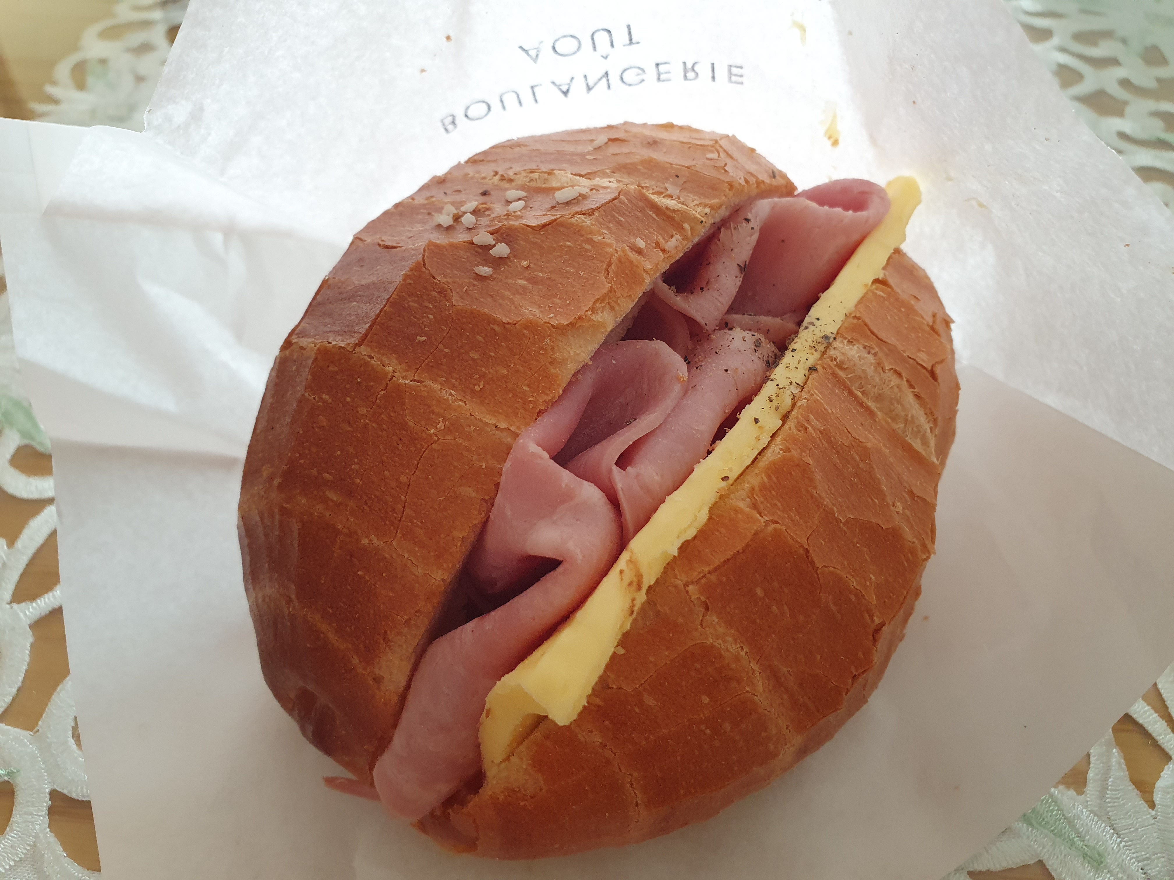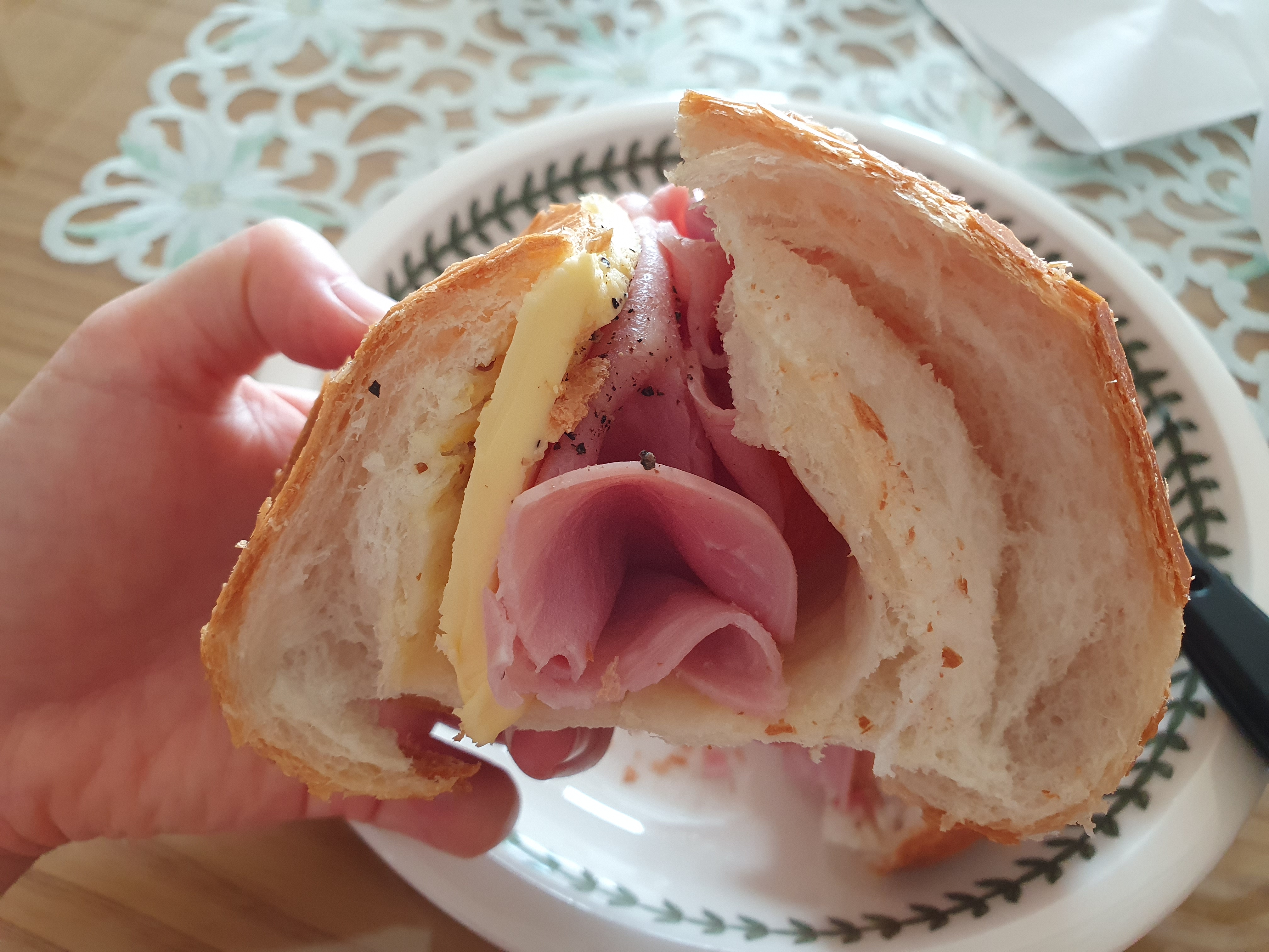 잠봉뵈르 소금빵입니다. 소금빵을 사려고 했는데, 식사빵으로는 조금 빈약한가 싶어서 잠봉이 들어간 잠봉뵈르 소금빵을 선택했습니다.