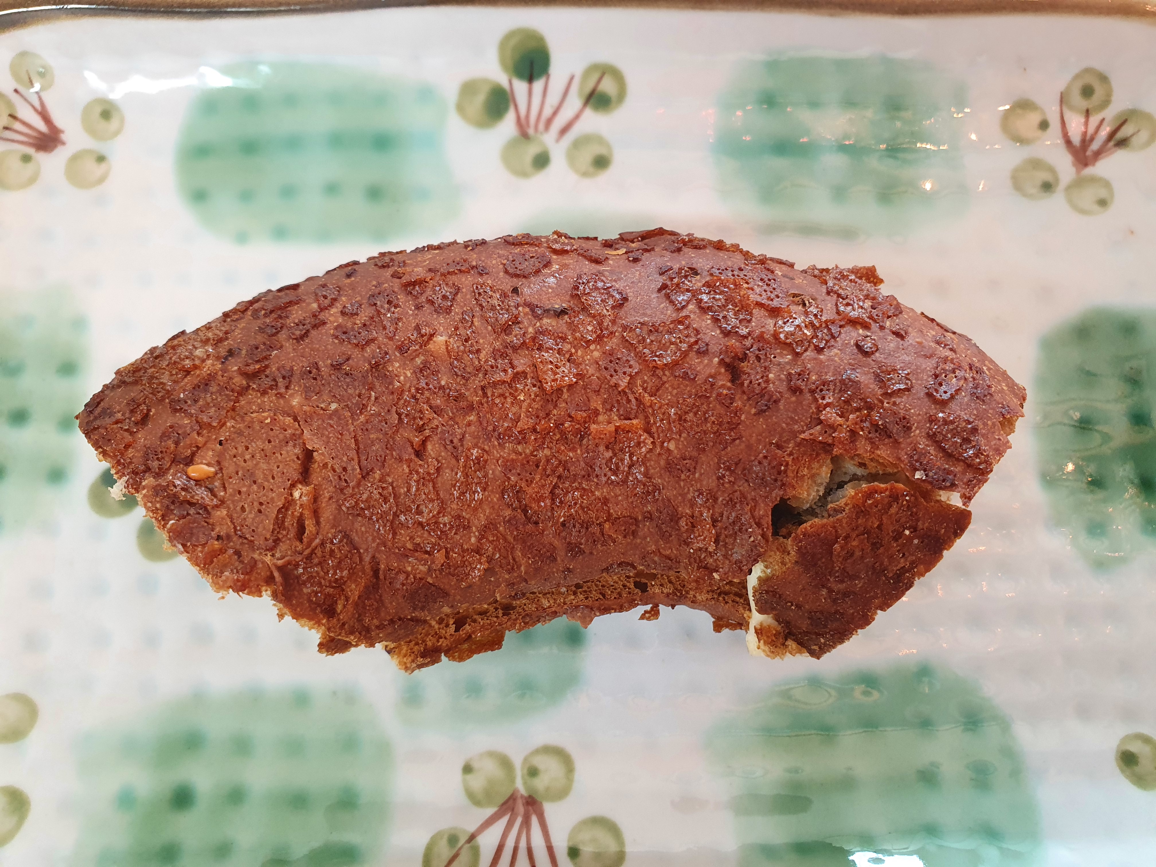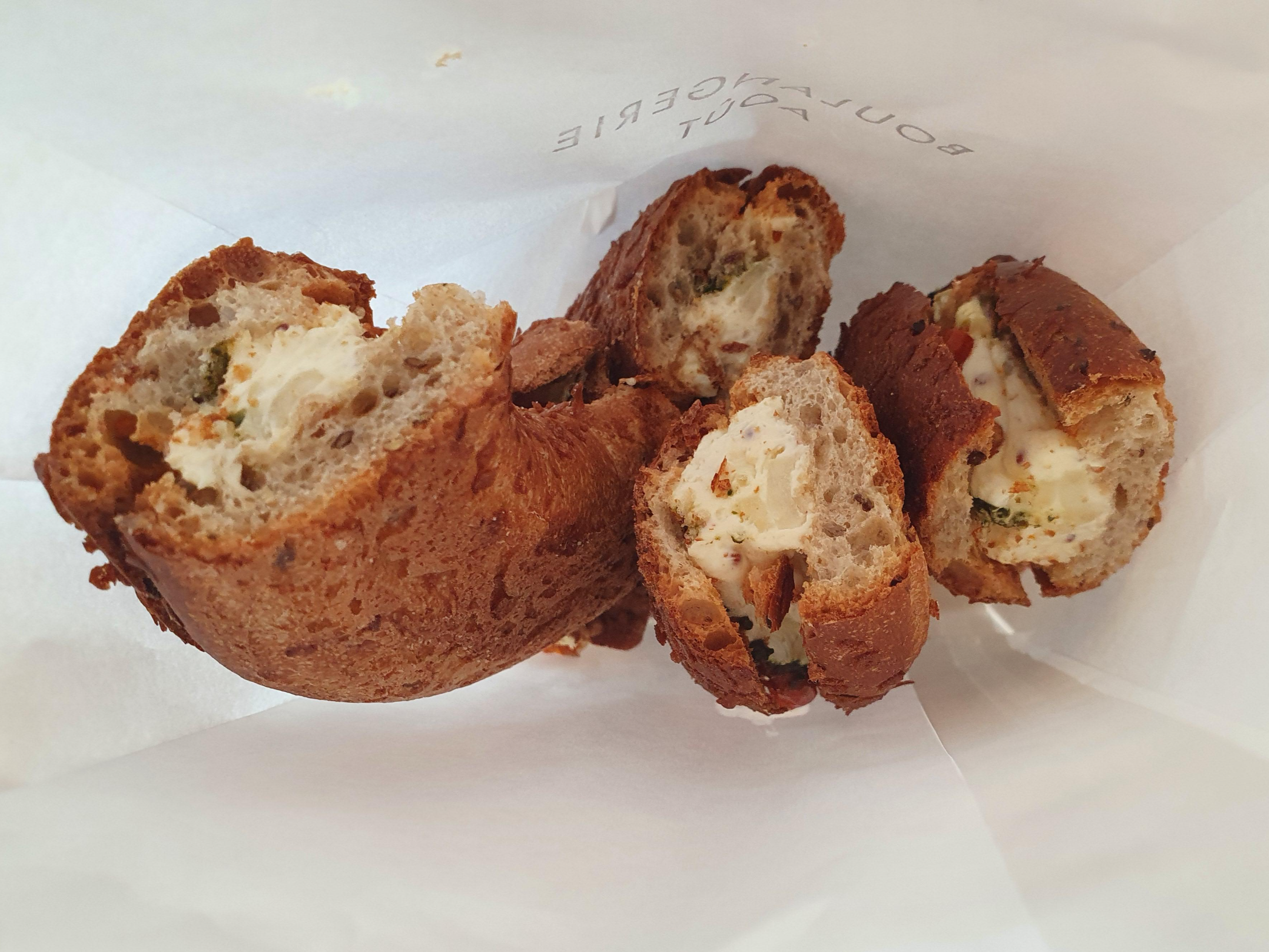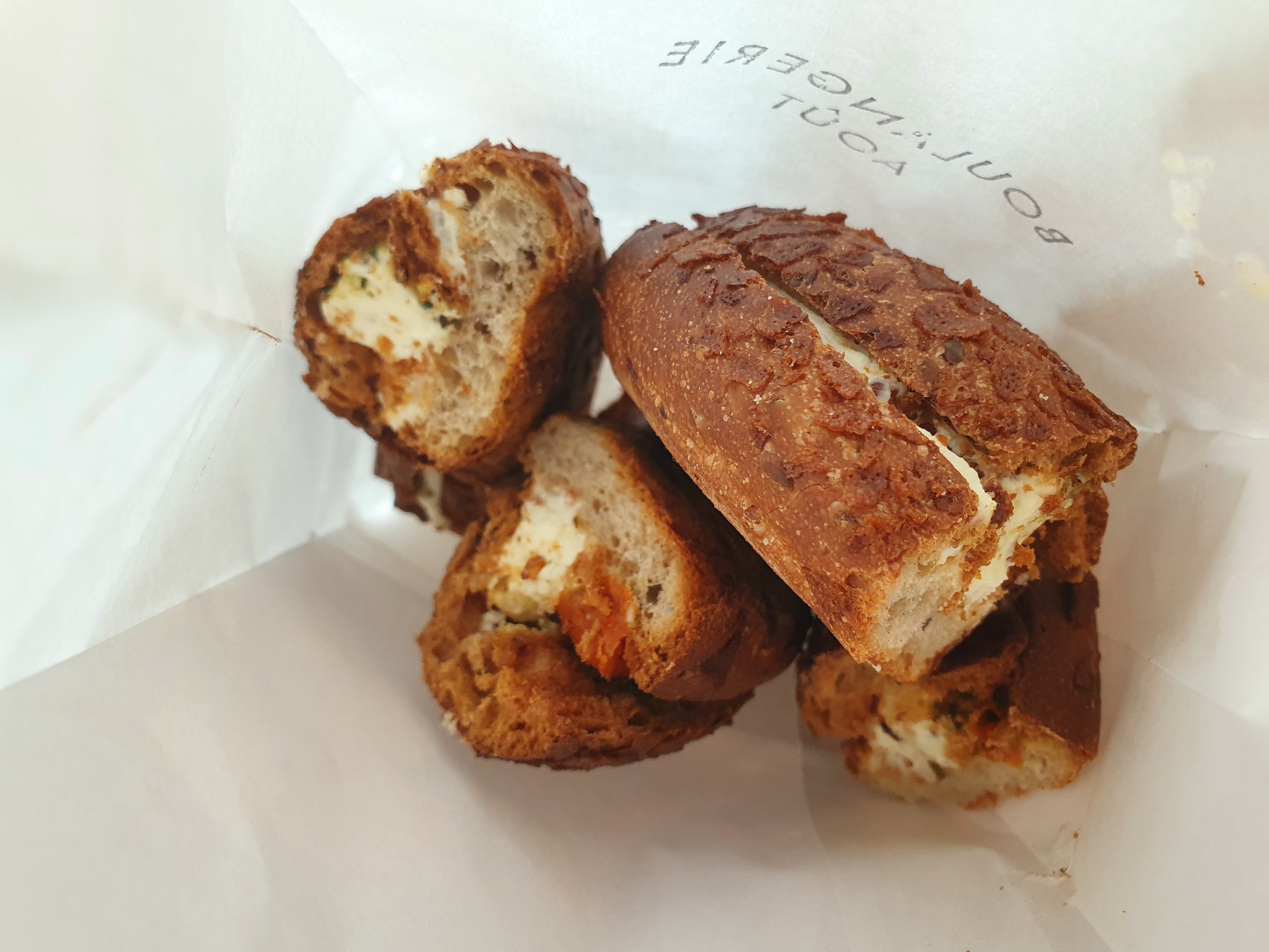 블랑제리 우트의 인기 품목 바질 크런치입니다. 저는 썰어달라고 부탁드렸어요. 조금 딱딱할 수 있는 바삭바삭한 빵에 말린 토마토와 바질이 들어간 크림치즈가 샌드 되어있는 메뉴입니다. 입천장 다 까지면서도 너무 맛있게 먹었습니다. 하루 지나면 살짝 녹녹해지는데, 그것도 맛있습니다. 그래도 저는 입천장 까질 정도로 바삭바삭할 때 먹는 게 가장 맛있었습니다.