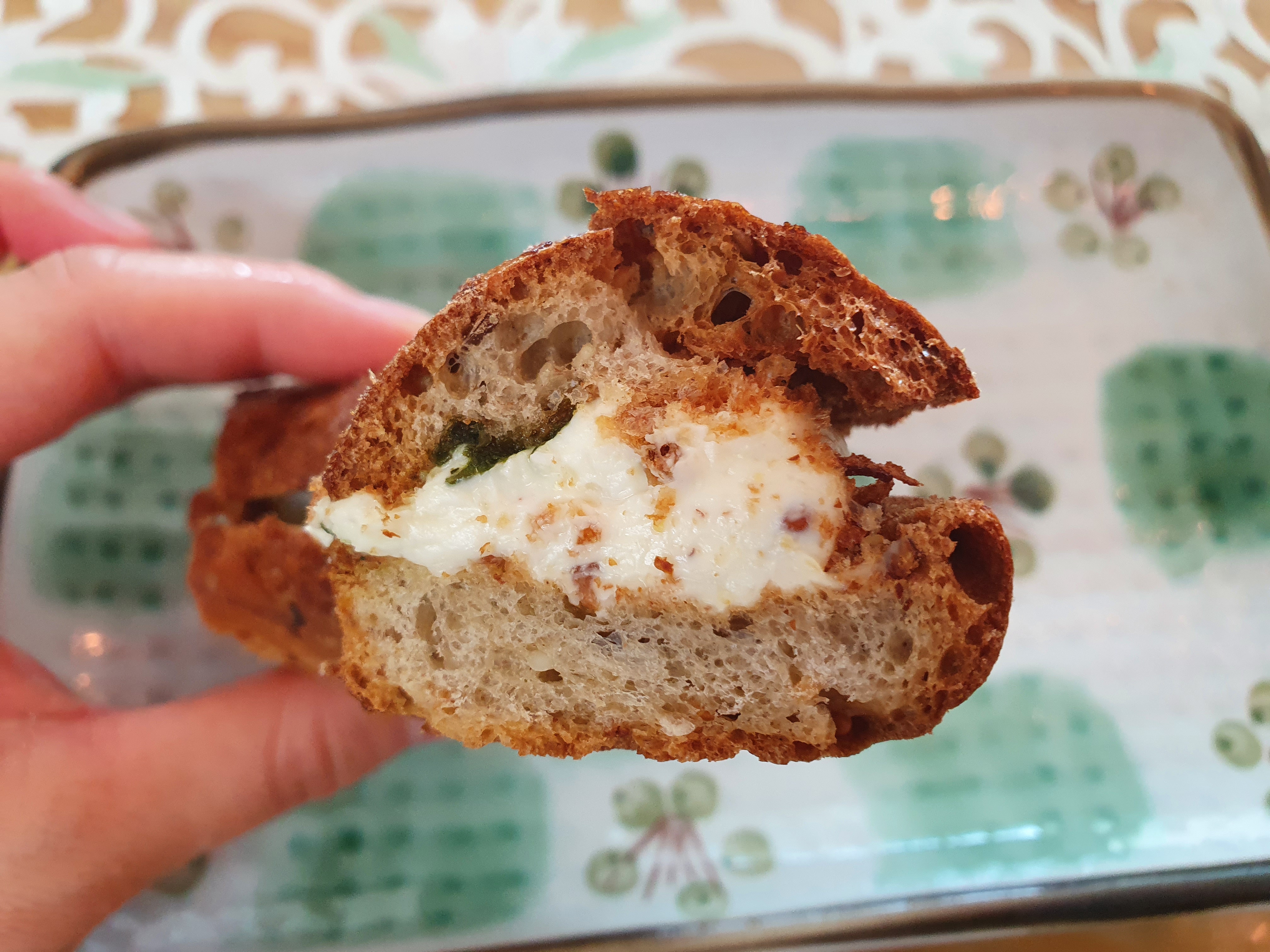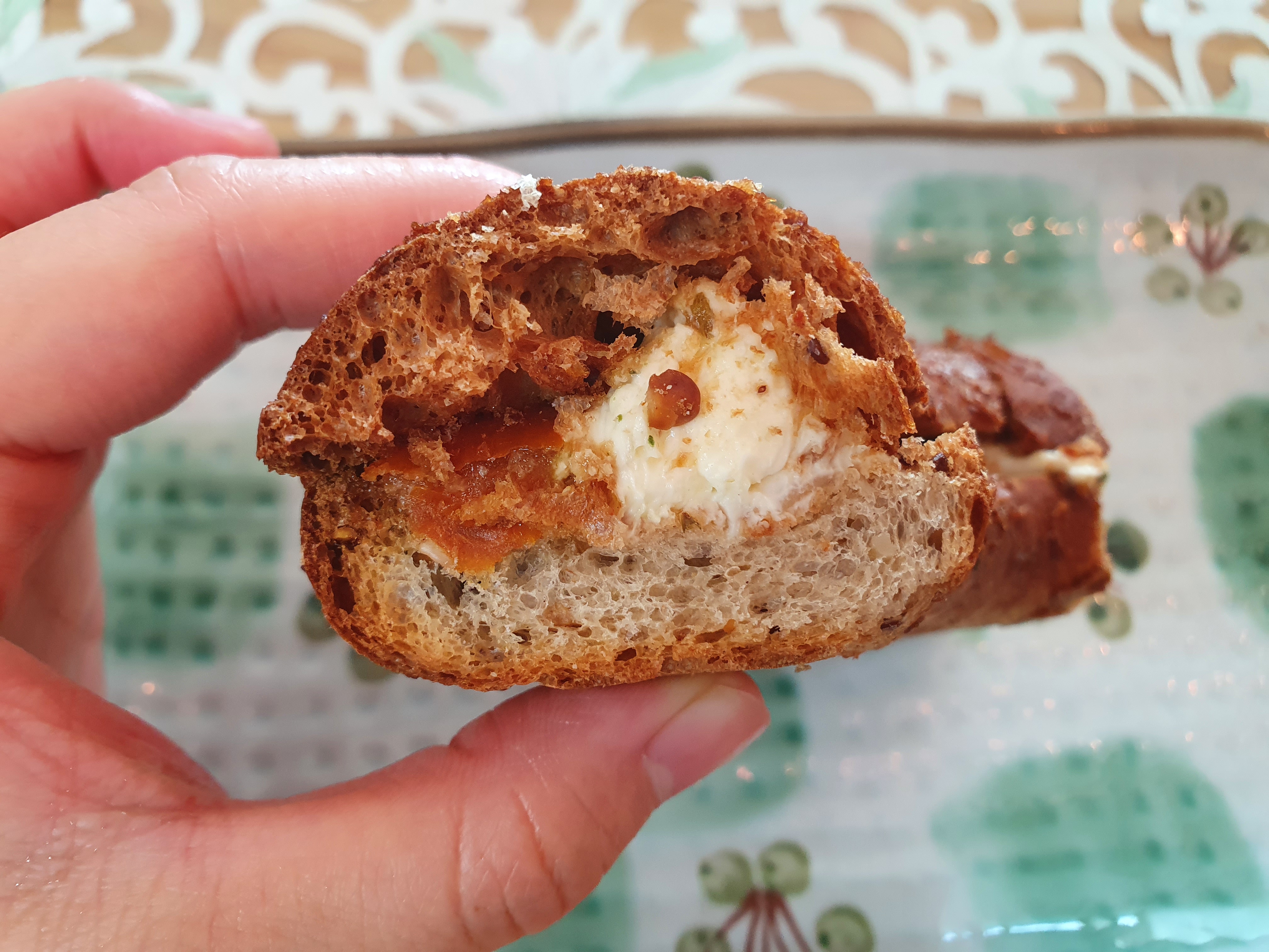 바질크런치의 단면입니다. 바질과 썬드라이드 토마토가 들어있는 크림치즈가 보입니다.