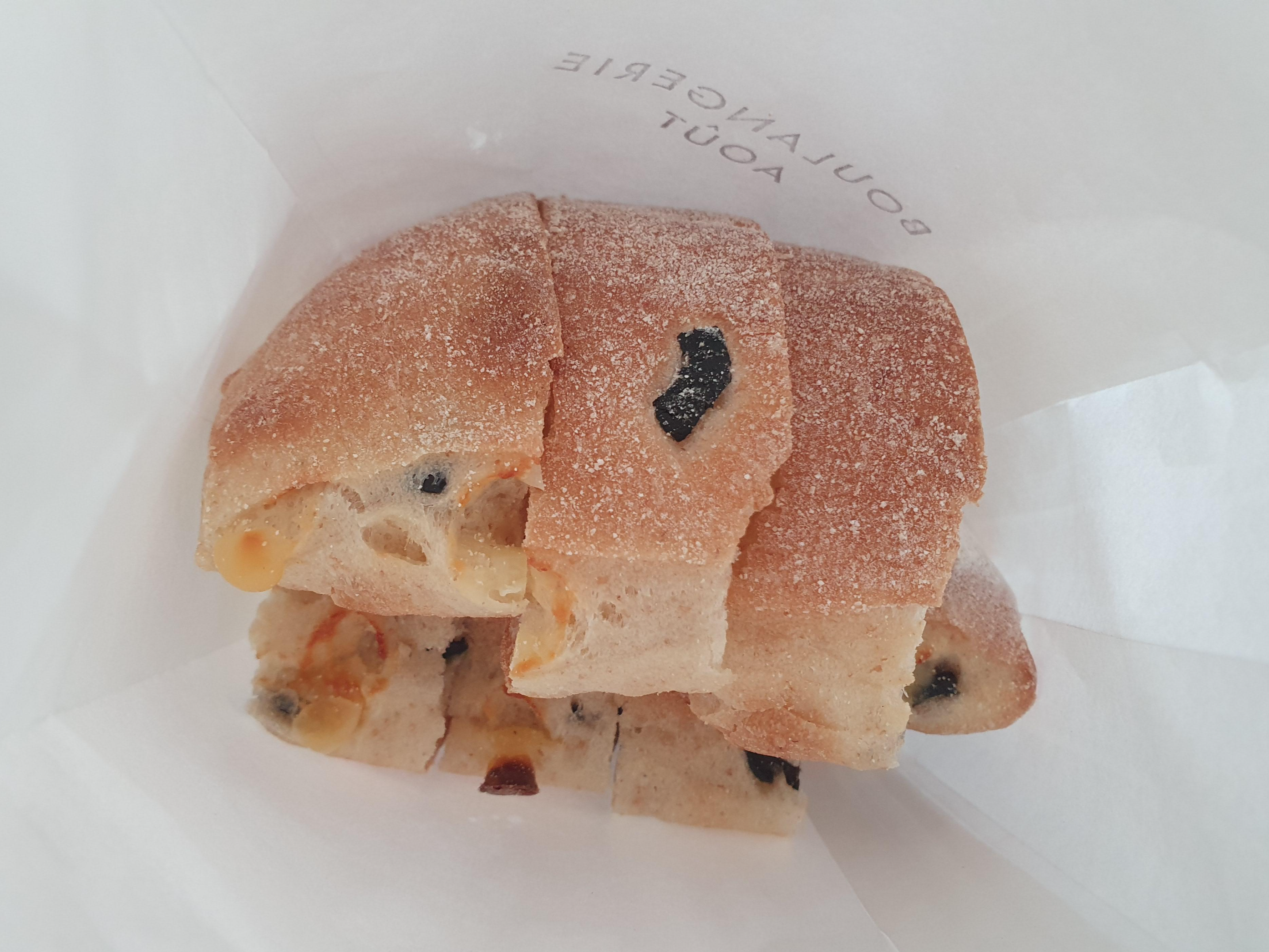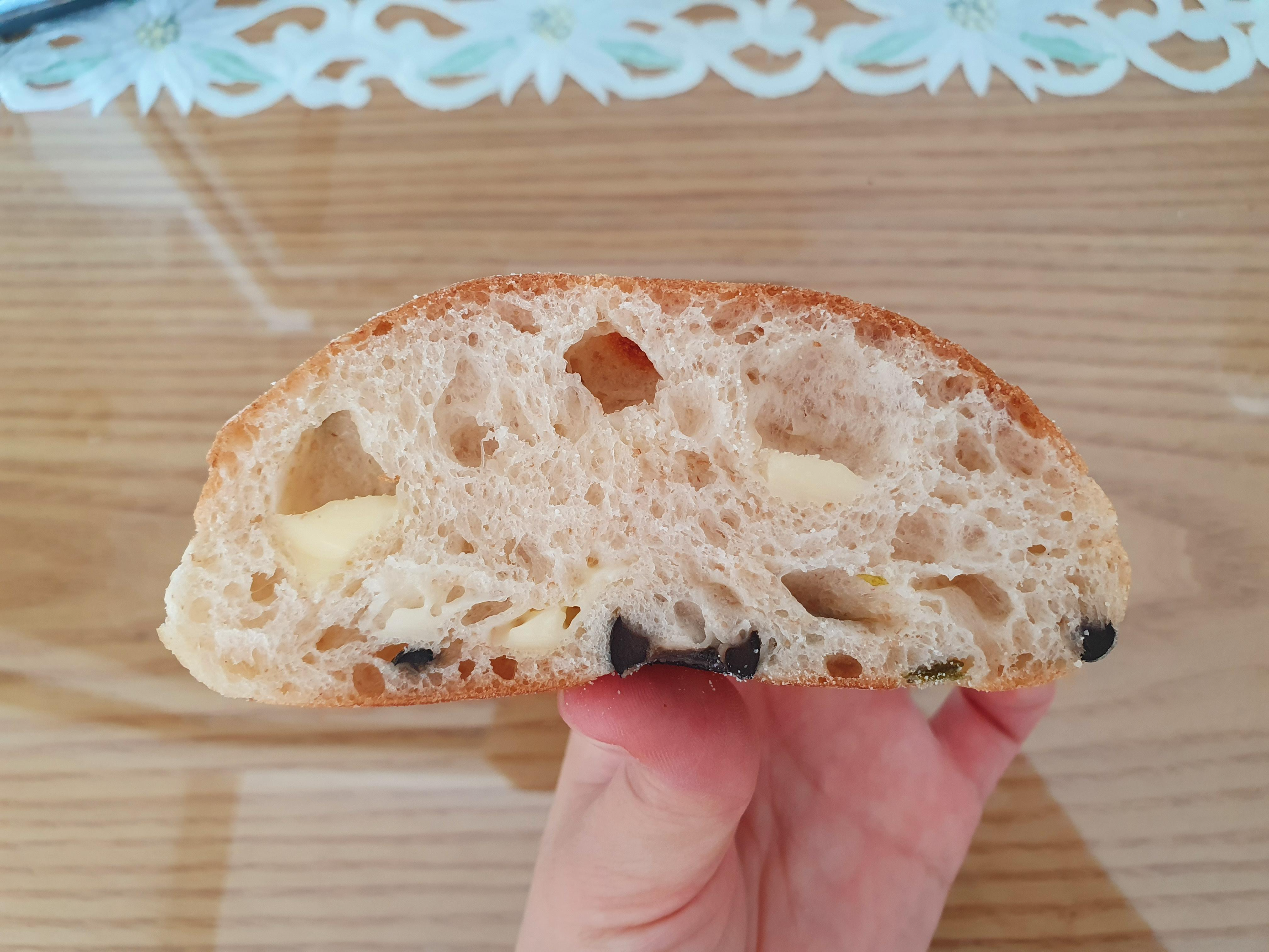 재료에 충실한 치아바타입니다. 치아바타 단면에 올리브와 치즈가 많습니다.