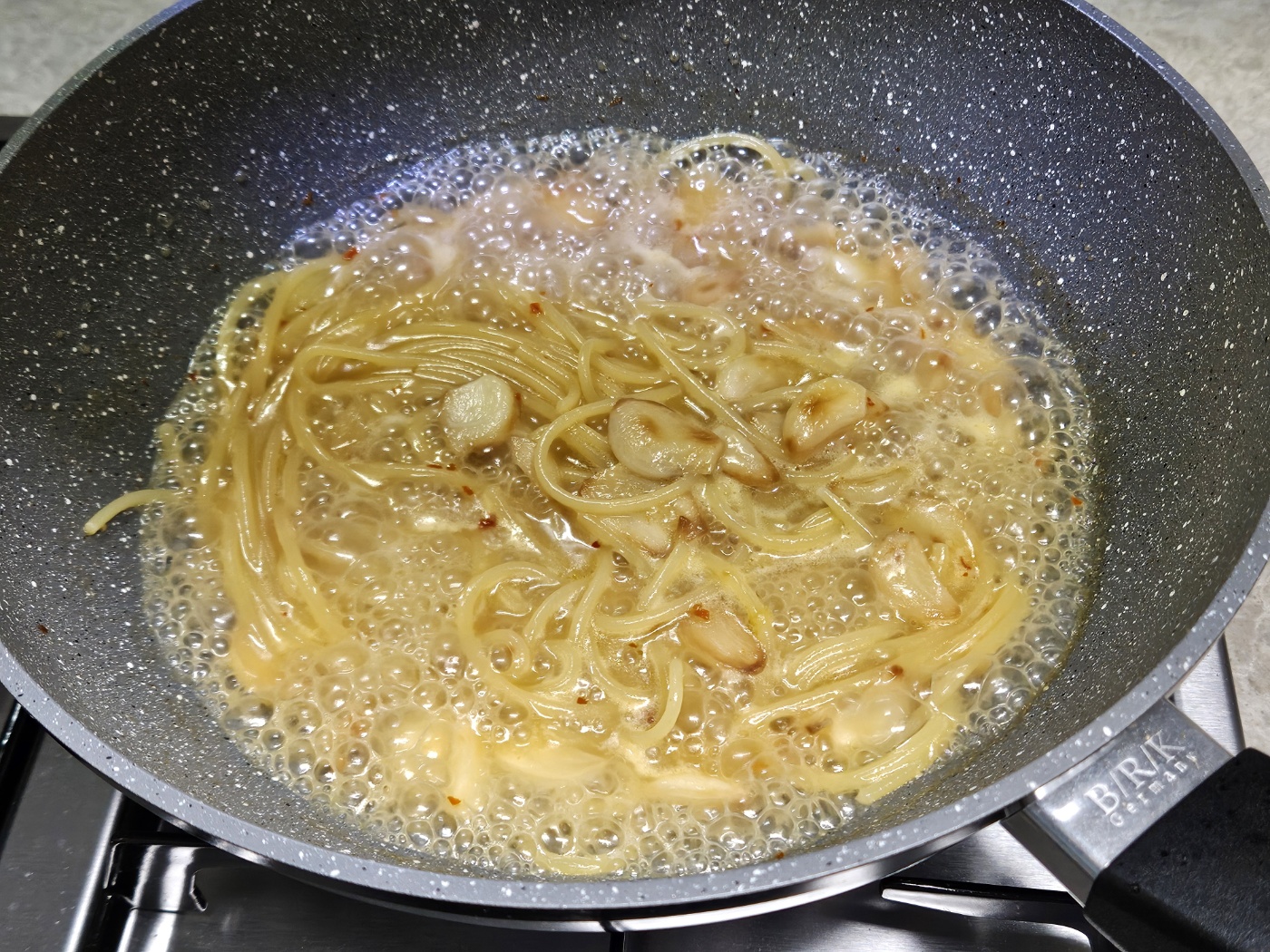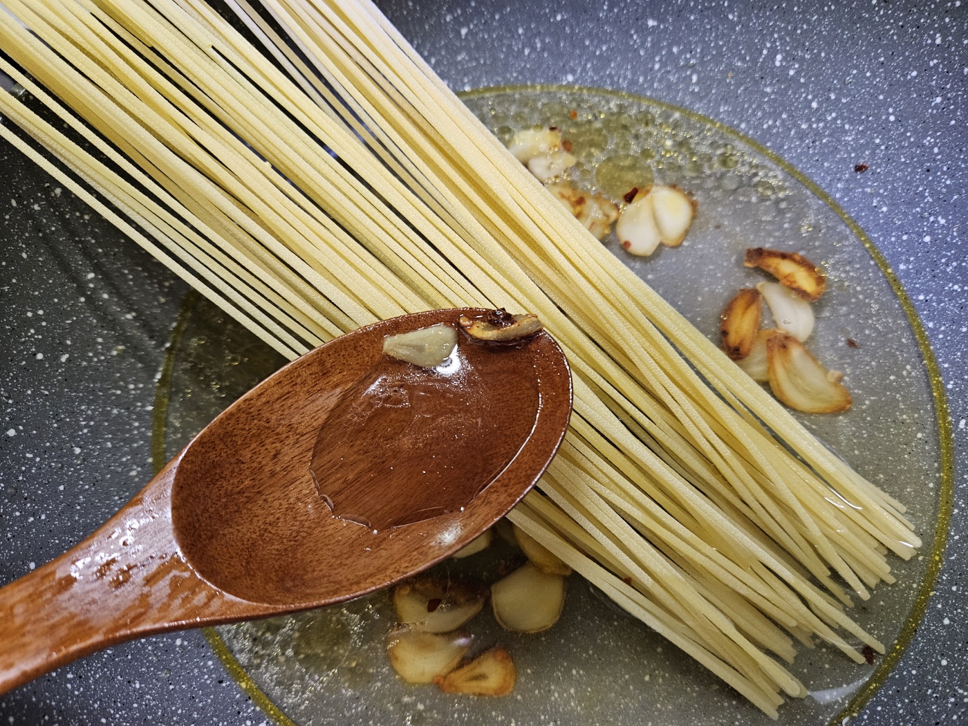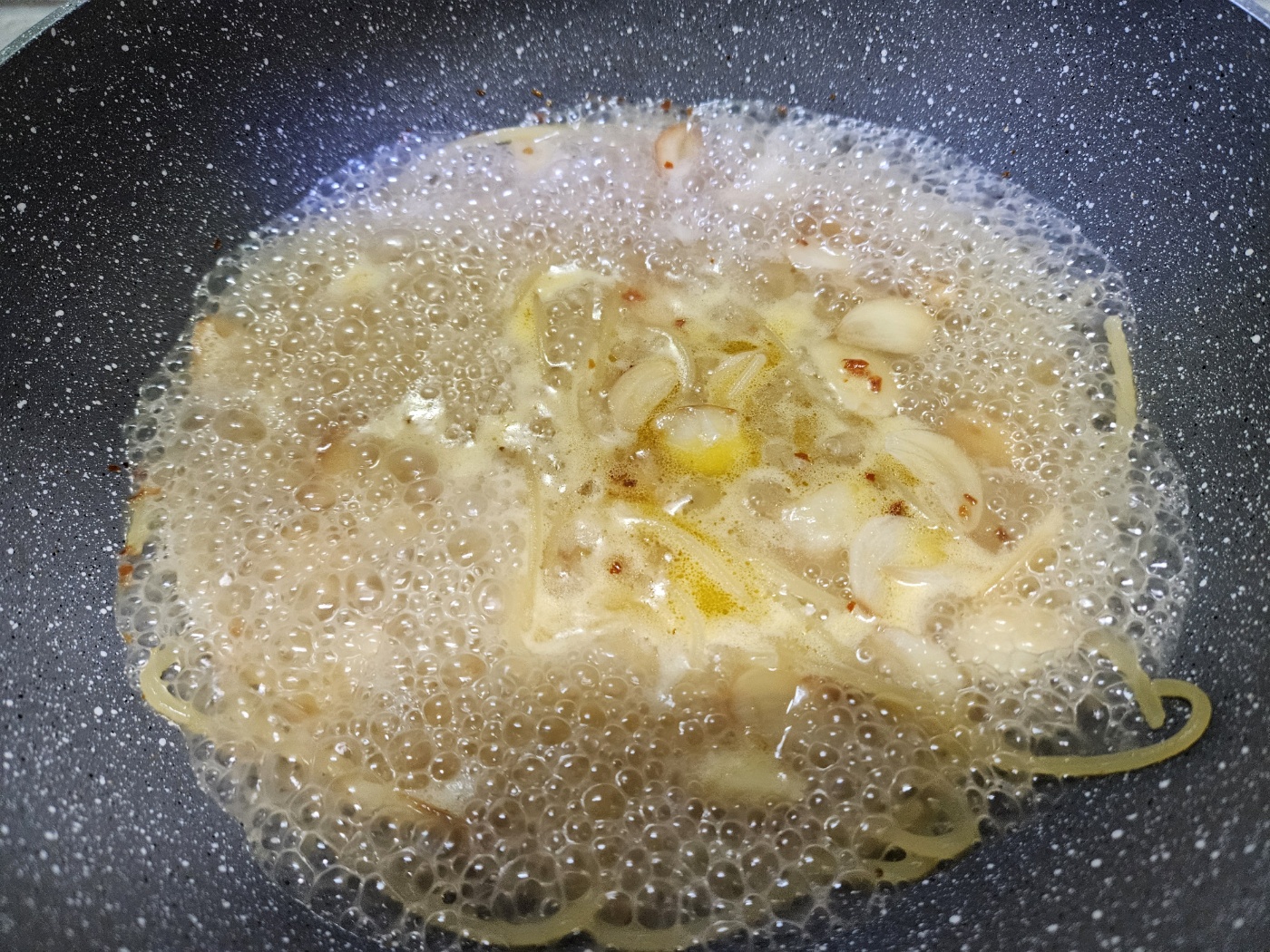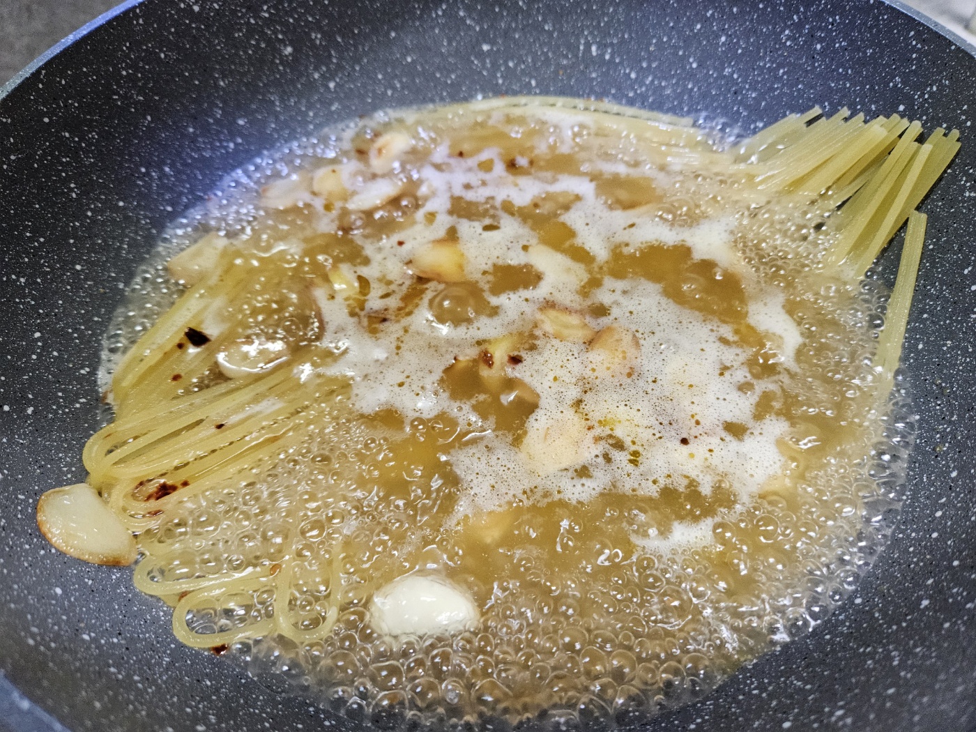 3) 마늘이 갈색으로 변하면 불을 끄고 물 550ml + 파스타 + 참치액젓 1스푼 넣기