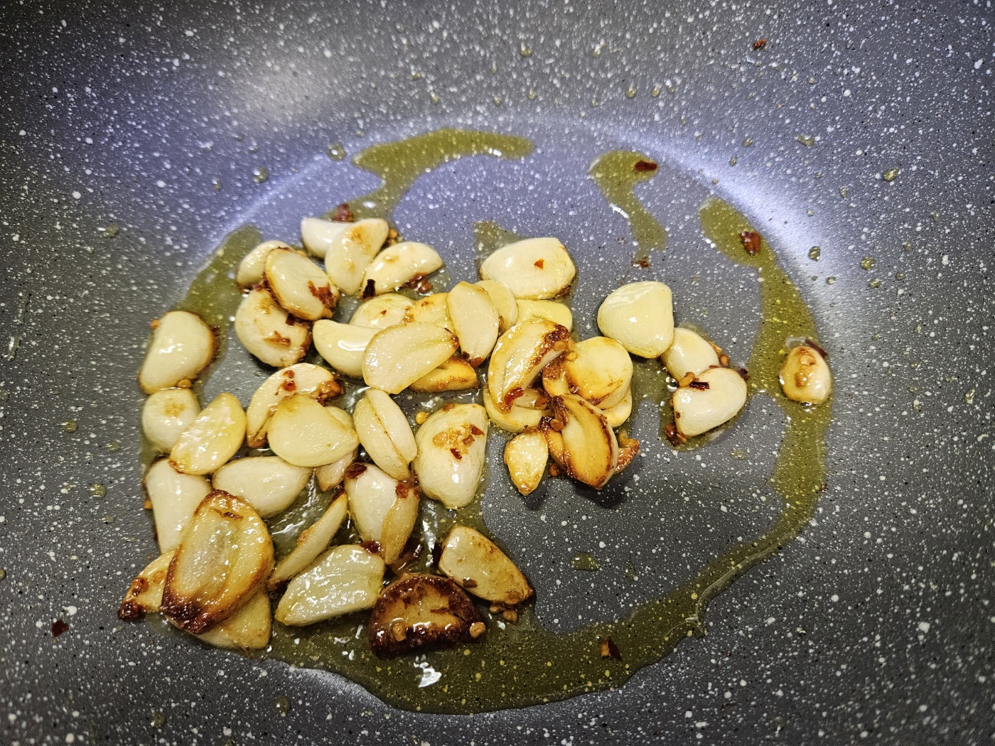 마늘과 페퍼론치노를 함께 볶습니다. 마늘이 맛있는 갈색이 될 때 불을 끕니다.