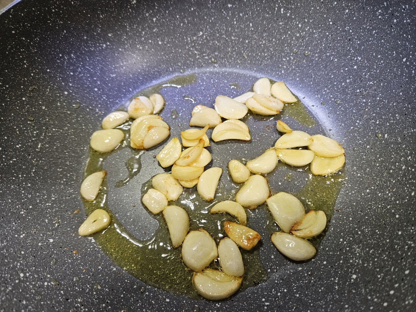 1) 약불에서 올리브유 4스푼 + 마늘 + 소금 한 꼬집 넣고 볶기