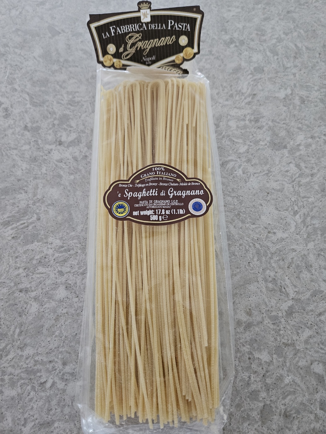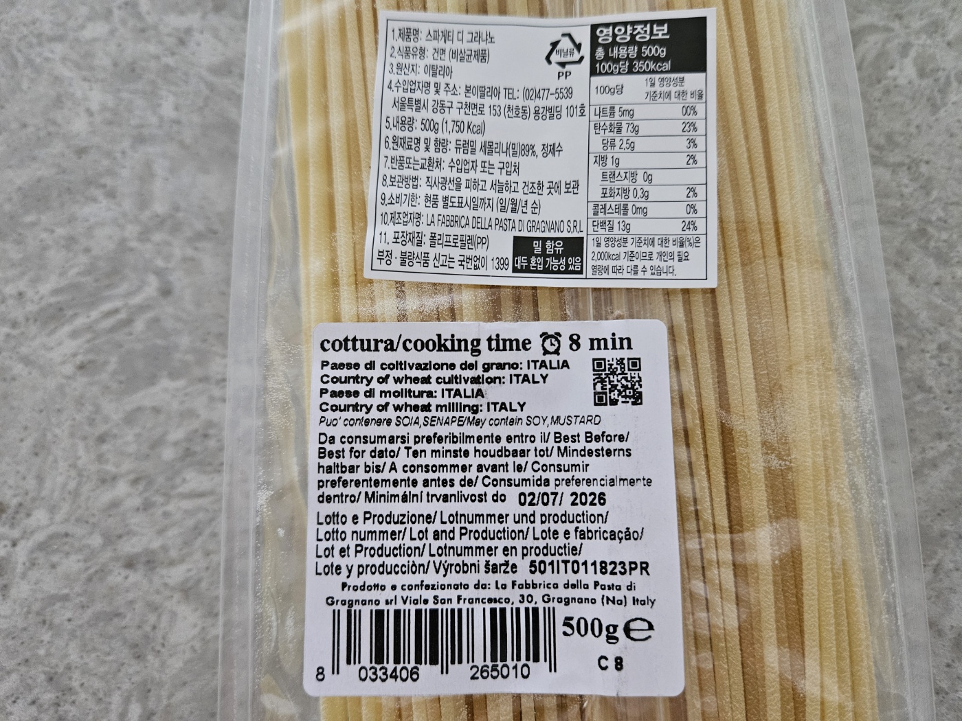 라 파브리카 스파게티 디 그라나노입니다. 면의 익힘 시간은 8분, 유통기한은 26년으로 넉넉합니다.