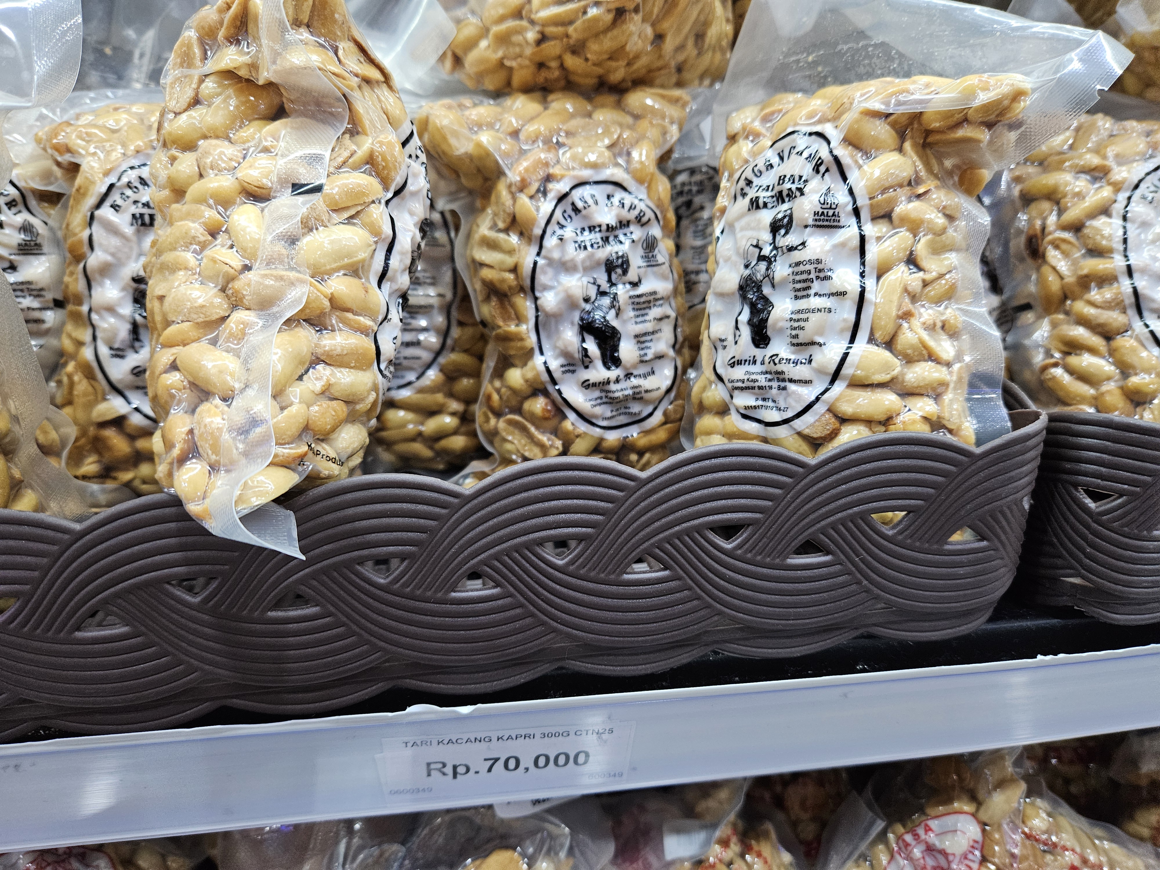 오른쪽에 있는 땅콩은 Kacang Kapri 마늘땅콩입니다. 여행 직전에 발리 여행 카페에서 마타하리 땅콩보다 더 맛있다는 후기를 보고, 저는 Kacang Kapri 땅콩을 구입했습니다. 공항 면세점에서 70,000 루피아에 구입했는데, 이 제품 또한 발리 시내 마트에서 훨씬 저렴하게 구입할 수 있다고 합니다.