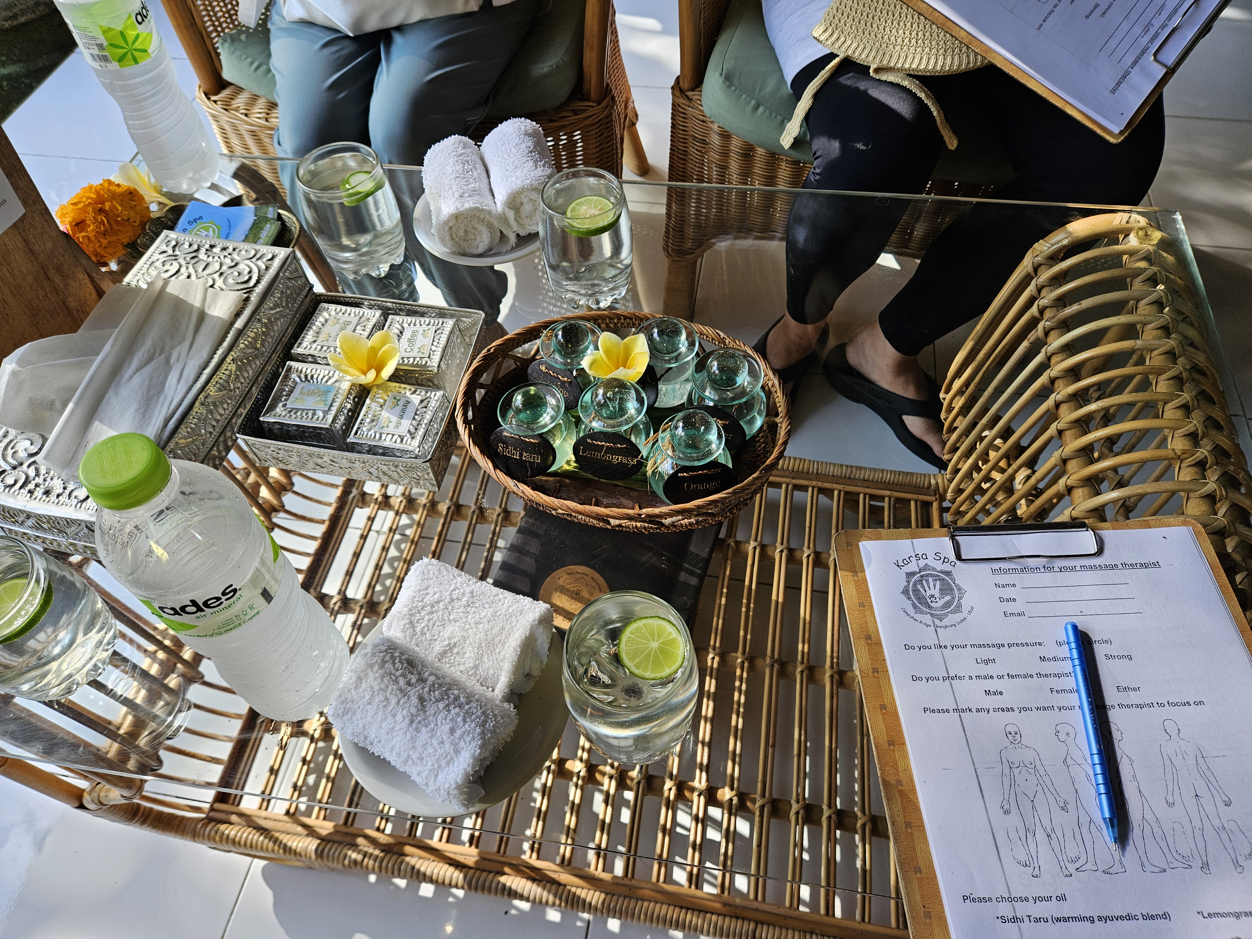 15분 일찍 도착해서, 라임이 들어간 시원한 물을 마시며 마사지 관련된 양식을 작성했습니다. 마사지 세기, 몸의 불편한 곳(집중 케어받고 싶은 곳), 마사지사의 성별, 오일의 종류를 체크했습니다.