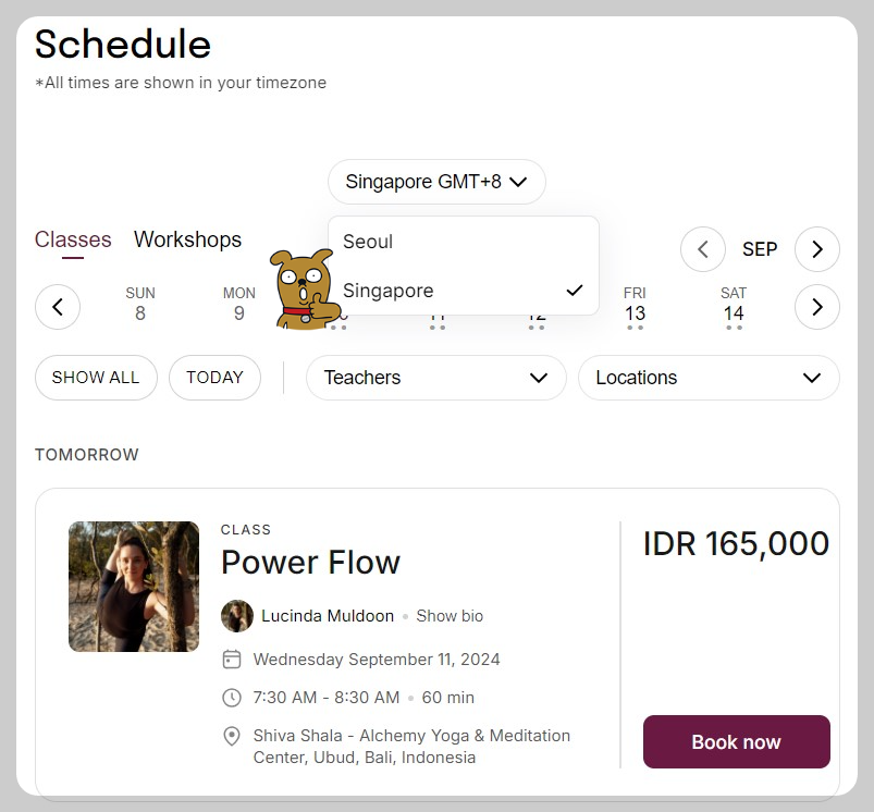 알케미 요가 센터가 우붓말고 다른 지역에도 있는 것 같은데, 스케줄 확인하시거나 예약하실때 꼭 우붓Ubud 지점으로 보셔야 합니다. 그리고, 스케줄에서 날짜 윗부분에 Seoul 기준 시간인지, Singapore 기준 시간(Bali 시간)인지를 선택할 수 있는데, 이 부분도 잘 확인해야, 수업 시간 제때 들어갈 수 있습니다. 발리 시간 기준으로 봐야지, 여행 계획 및 수업 참여에 차질이 없습니다. (불편하게 기준 시간에 왜 옵션을 넣어놨는지 모르겠어요. 발리 시간 기준을 기본설정 및 고정 해야 여행 계획에 차질이 없을텐데요.) 발리 시간 기준으로 시간 확인해서 수업 놓치는 슬픈 일이 일어나지 않도록 주의바랍니다.