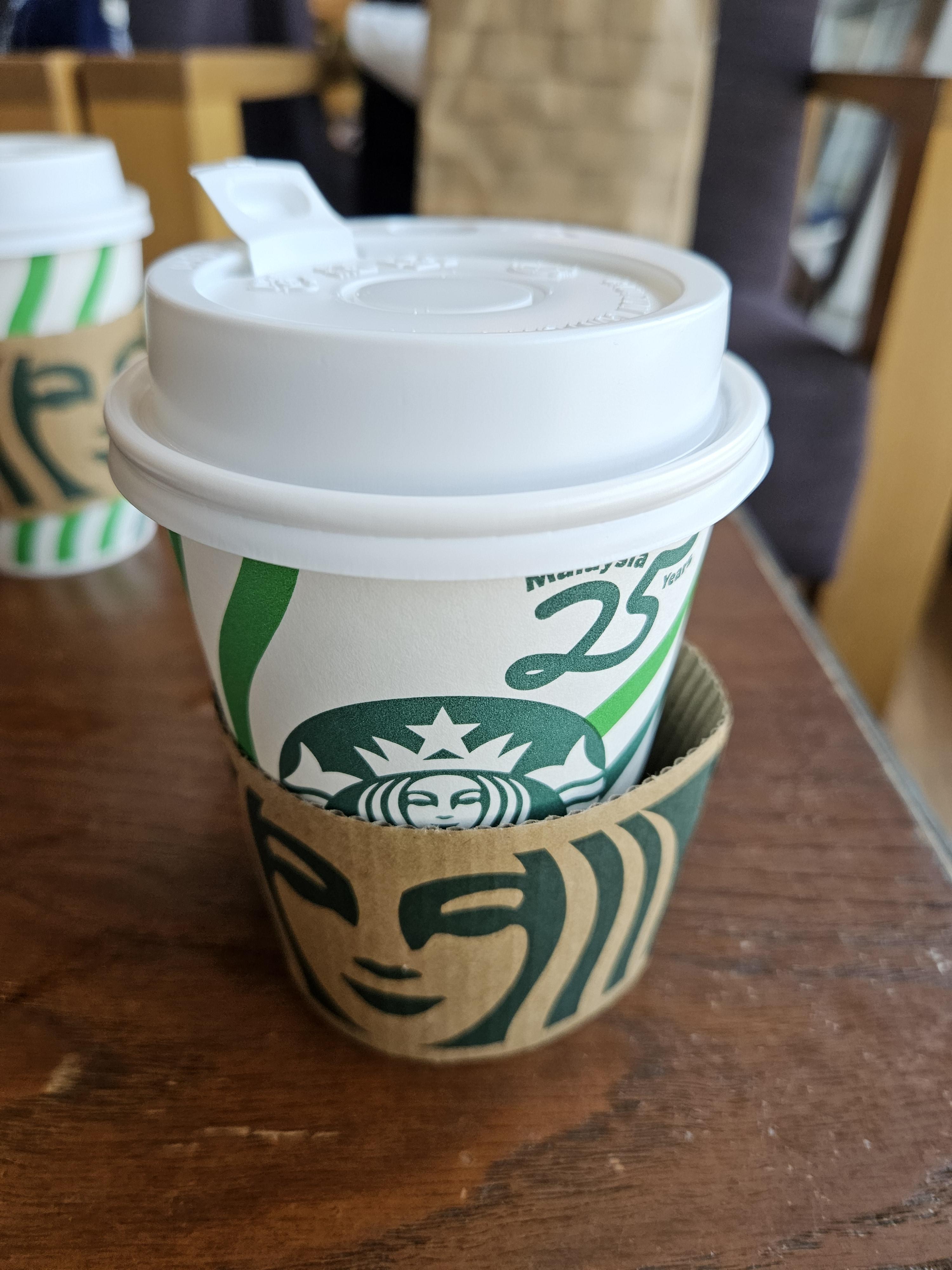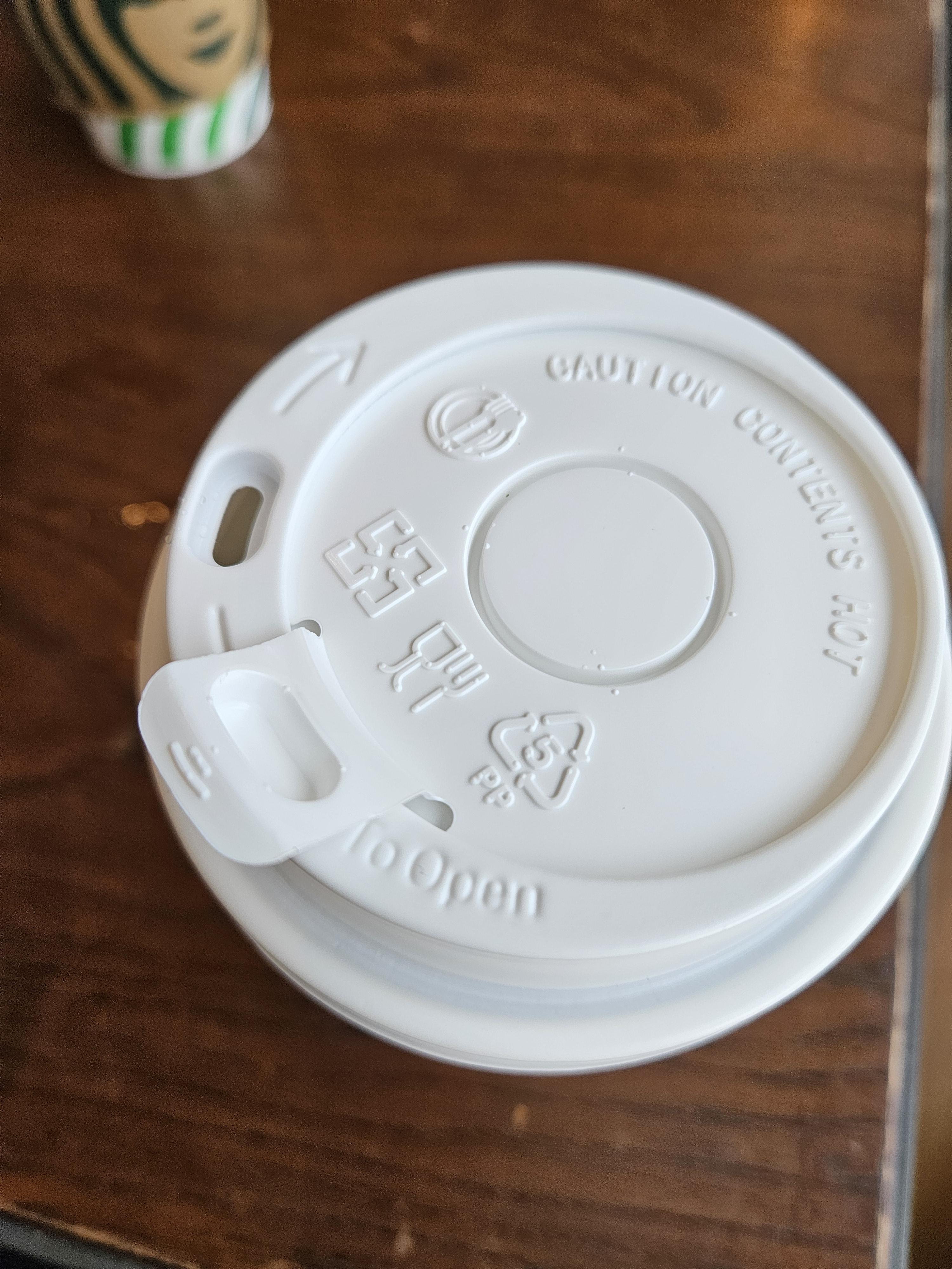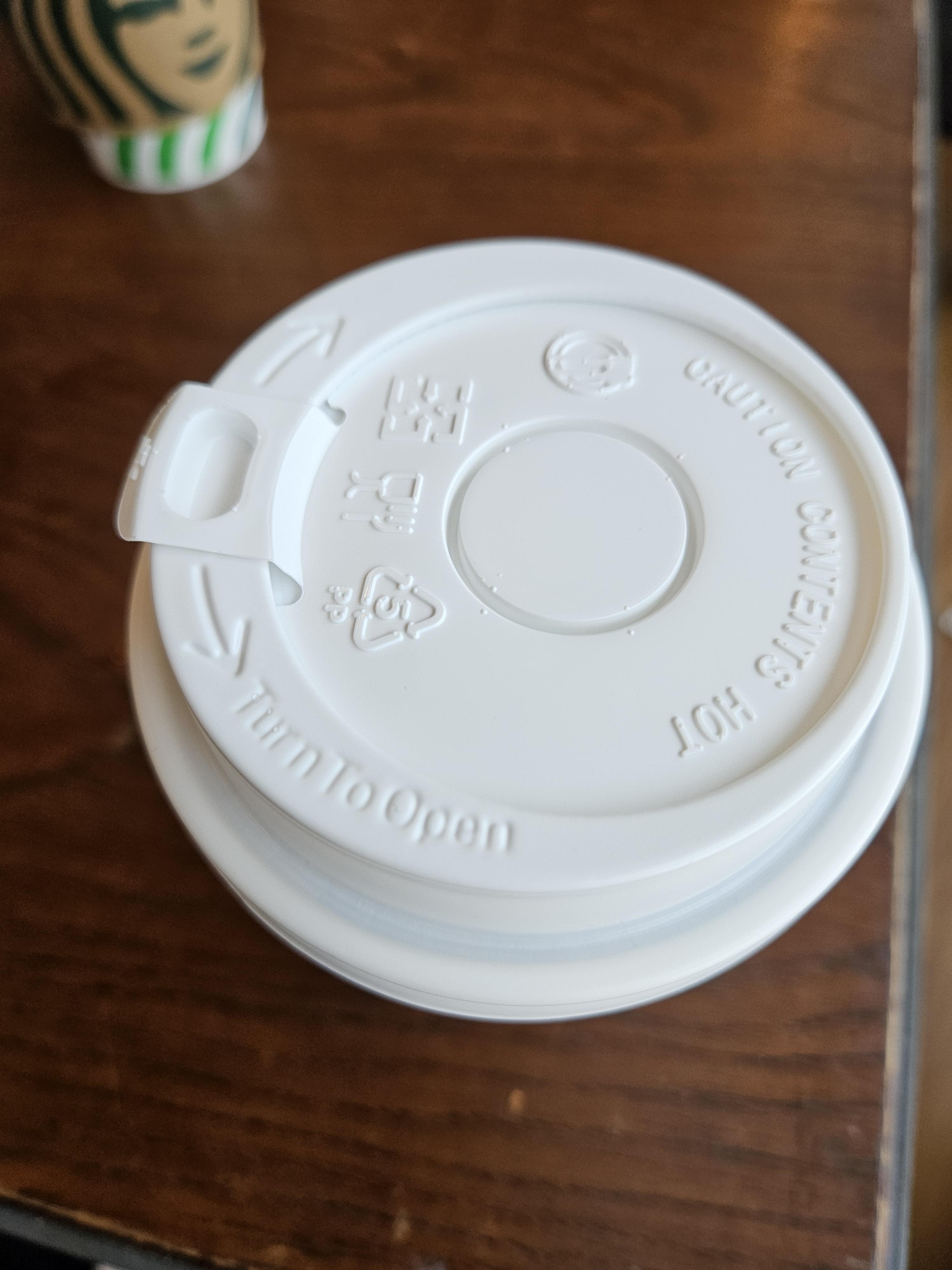 스타벅스에 도착해서 커피 한잔씩 주문하고, 휴식을 취했어요. 경유시간이 넉넉하니 이게 좋더라고요. 스타벅스 종이컵 리드가 튼튼하고 실용성 있었는데 신기해서 찍어두었습니다.