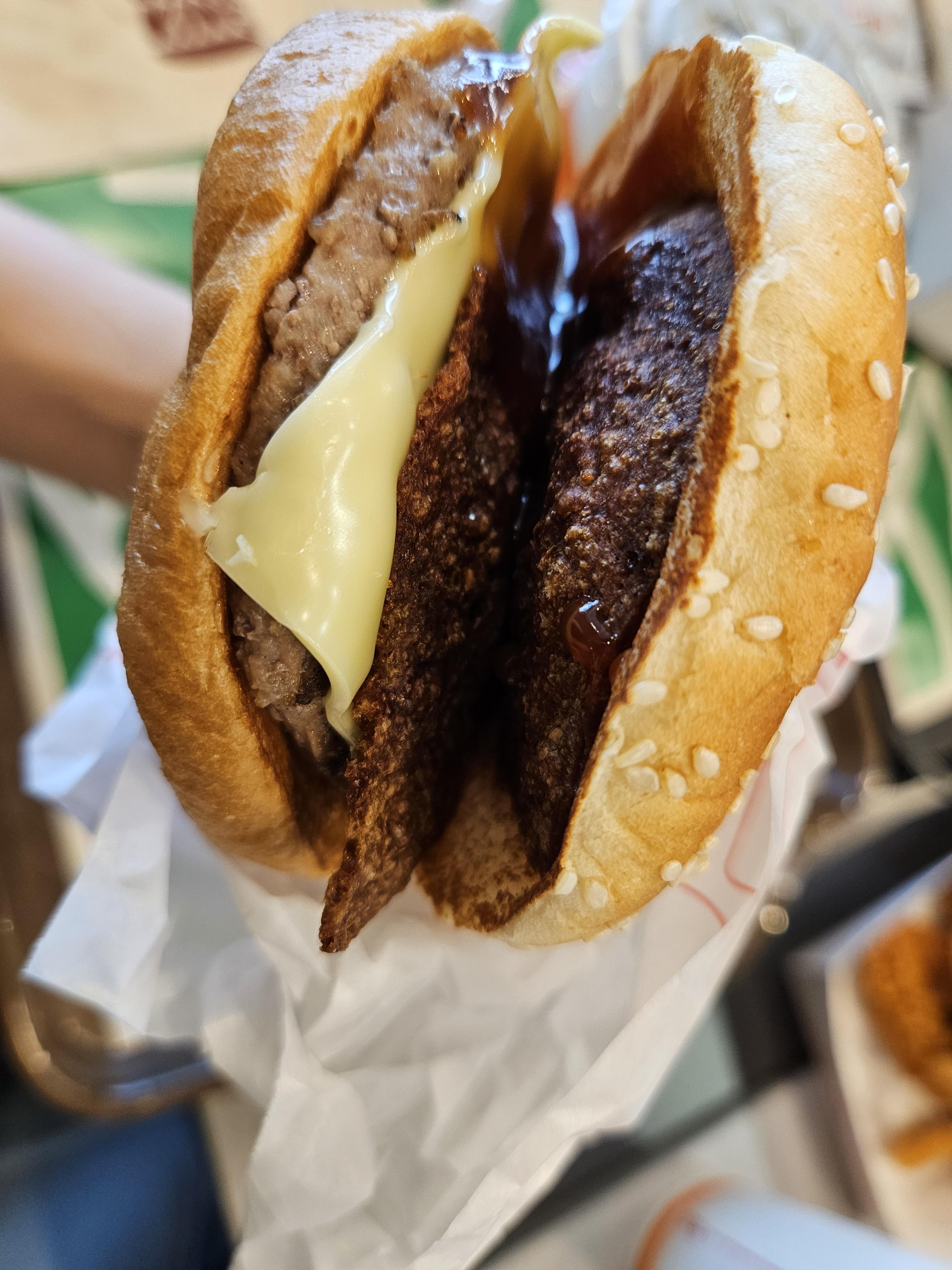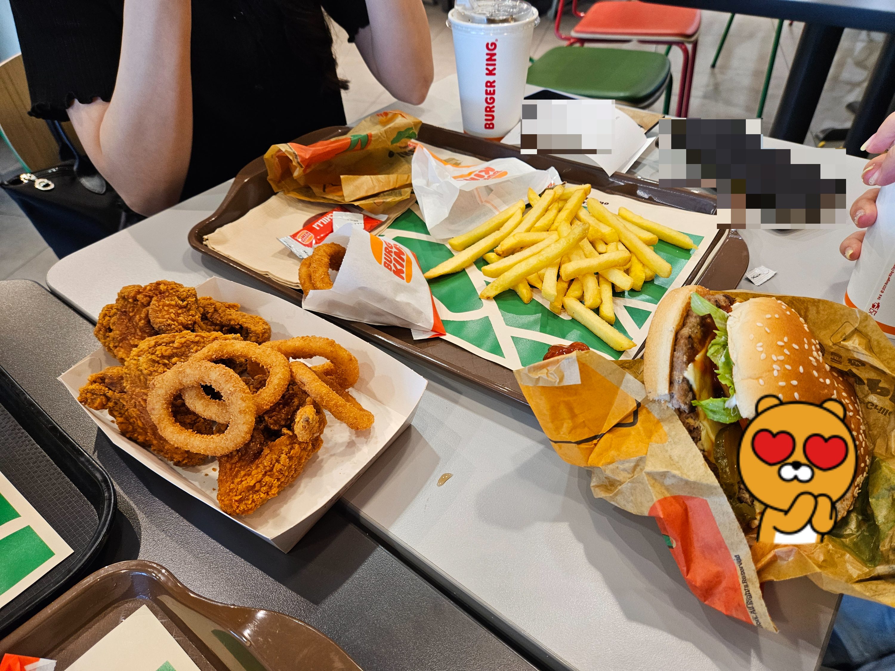 버거킹 버거킹 햄버거 햄버거 노래를 부르며 버거킹에 도착했고, 친구들은 와퍼와 치킨, 저는 좀 독특한 걸 주문하고 싶어서 와퍼 말고 다른 버거를 주문했습니다. 이 조합이면 맛없을 수 없겠다 생각해서 주문한 버거인데, 뜯고 나서 깜짝 놀랐어요. 돼지껍질 버거인가??? 돼지 껍데기 버거를 시킨 건가? 내가 돼지 껍데기를 좋아하긴 하는데 이런 메뉴가 있었나? 잠을 제대로 못 자서 그런 건지 햄버거를 보고 충격받아서 그런 건지 어떤 버거를 시켰는지 당최 생각이 안 나더라고요.