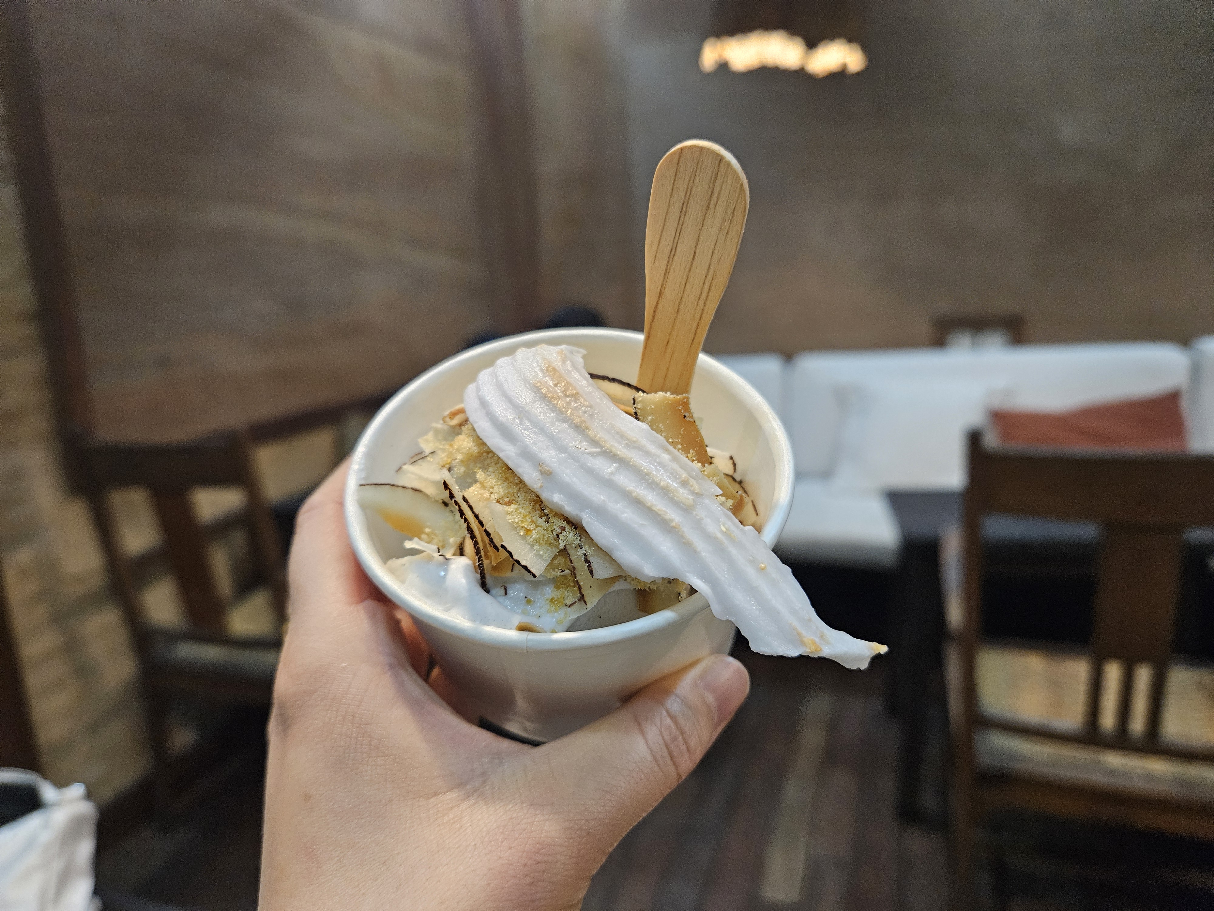 그리고 다시 그랩 바이크를 타고 투키스 코코넛으로 향했습니다. 크레트야를 다녀온 친구들과 만나서 코코넛 아이스크림을 먹었어요.
