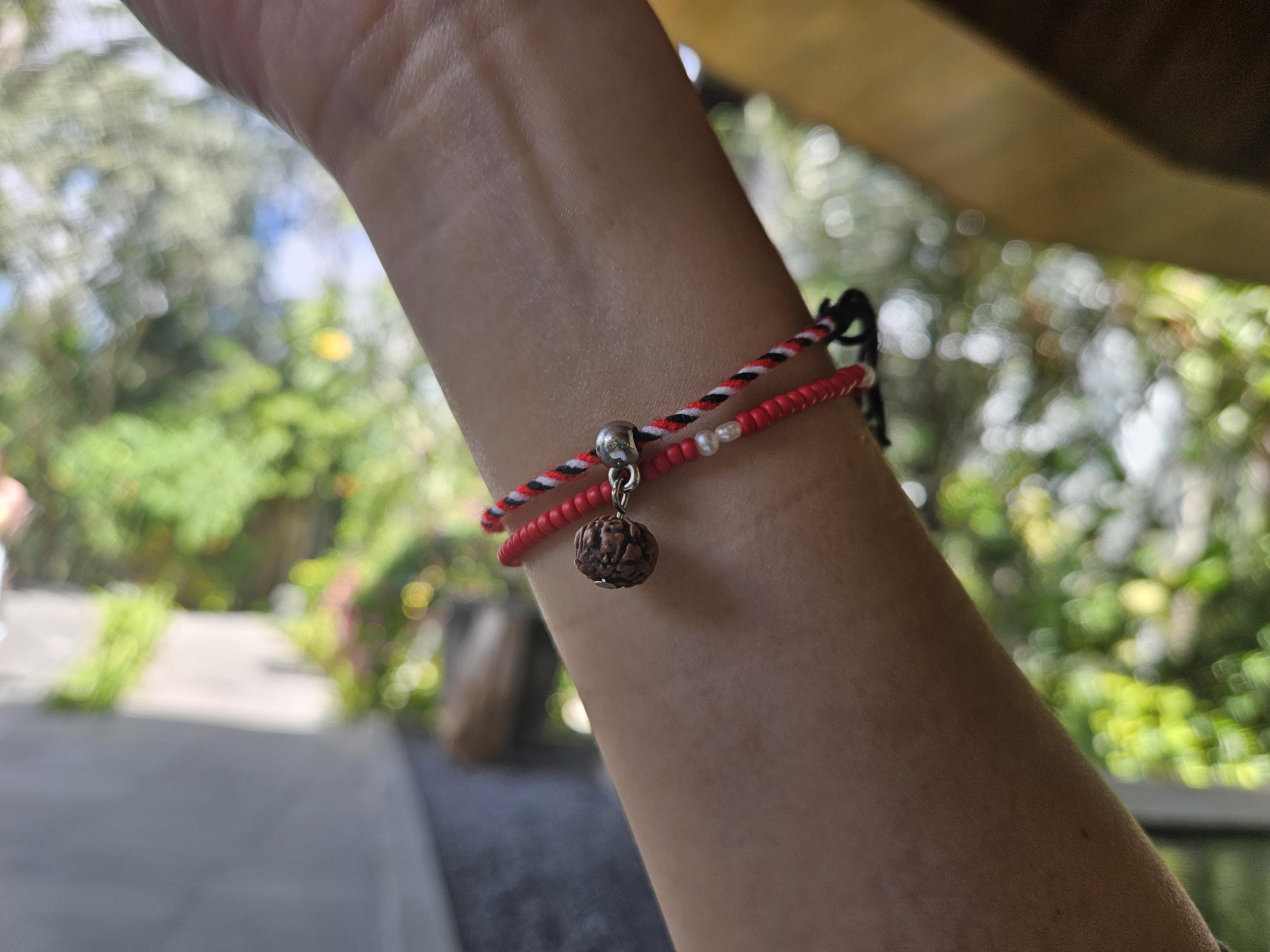 이 팔찌는 ‘트리다투(Tridatu) 실 팔찌’로 알려져 있으며, 빨강, 검정, 하얀색의 세 가지 실로 구성되어 있습니다. 어원적으로 ‘트리다투’는 "세 가지"를 의미하는 'Tri'와 "왕"을 의미하는 'Datu'에서 나옵니다. 따라서 트리다투는 브라마 신, 비슈누 신, 시바 신을 뜻하는 세 가지 주요 신을 상징합니다. 트리다투는 주술적인 물건이 아니라 세 가지 요소를 상징합니다. 빨간색 요소는 창의력과 용기를, 검은색 요소는 힘과 악령으로부터의 보호를, 하얀색 요소는 영성과 선함을 상징합니다.