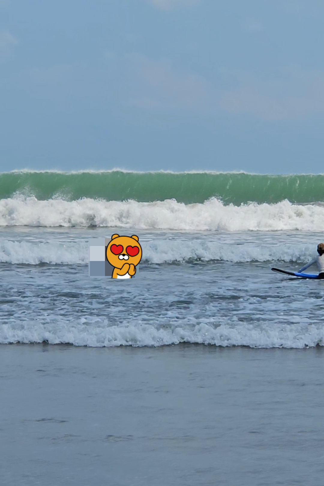 요건 꾸따비치 파도가 엄청나다는 걸 보여드리고 싶어서 올리는 사진입니다. 저는 저 파도 앞에서 서핑 시도해 보려고 파도를 잘 못 봤는데, 멀리서 보니 아주 어마무시하더라고요. 그래서 꾸따가 서핑 타기 최적의 해변이라고 하는 것 같습니다. 실제로 파도는 엄청 강하지만, 물 높이는 낮은 편입니다.