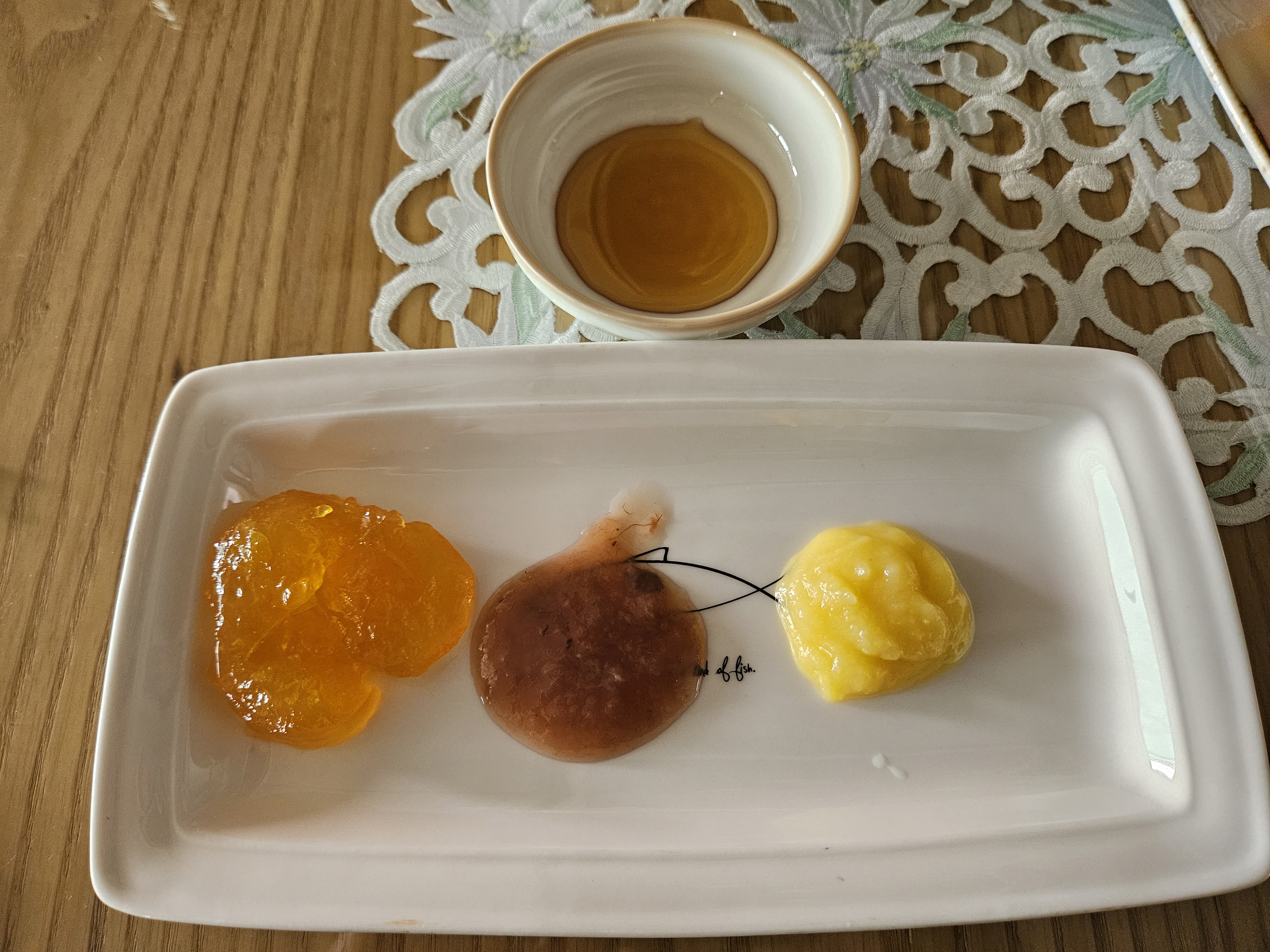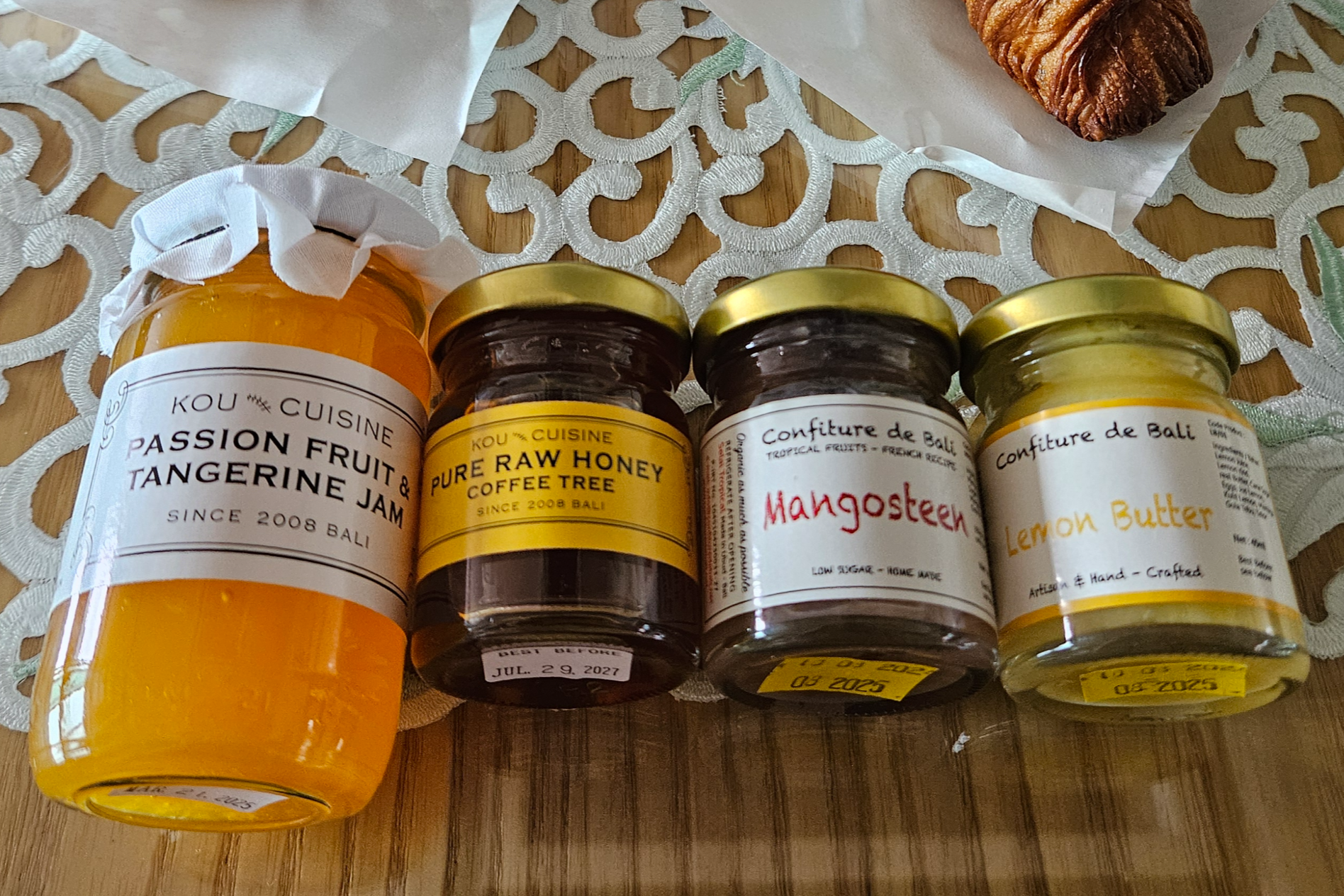 아래 긴 접시에 담겨있는 잼은 왼쪽부터 차례로 1) 코우퀴진의 패션후르츠 탠저린 잼, 2) 컨피츄어 드 발리의 망고스틴 잼, 3) 컨피츄어 드 발리의 레몬 버터 스프레드 입니다.