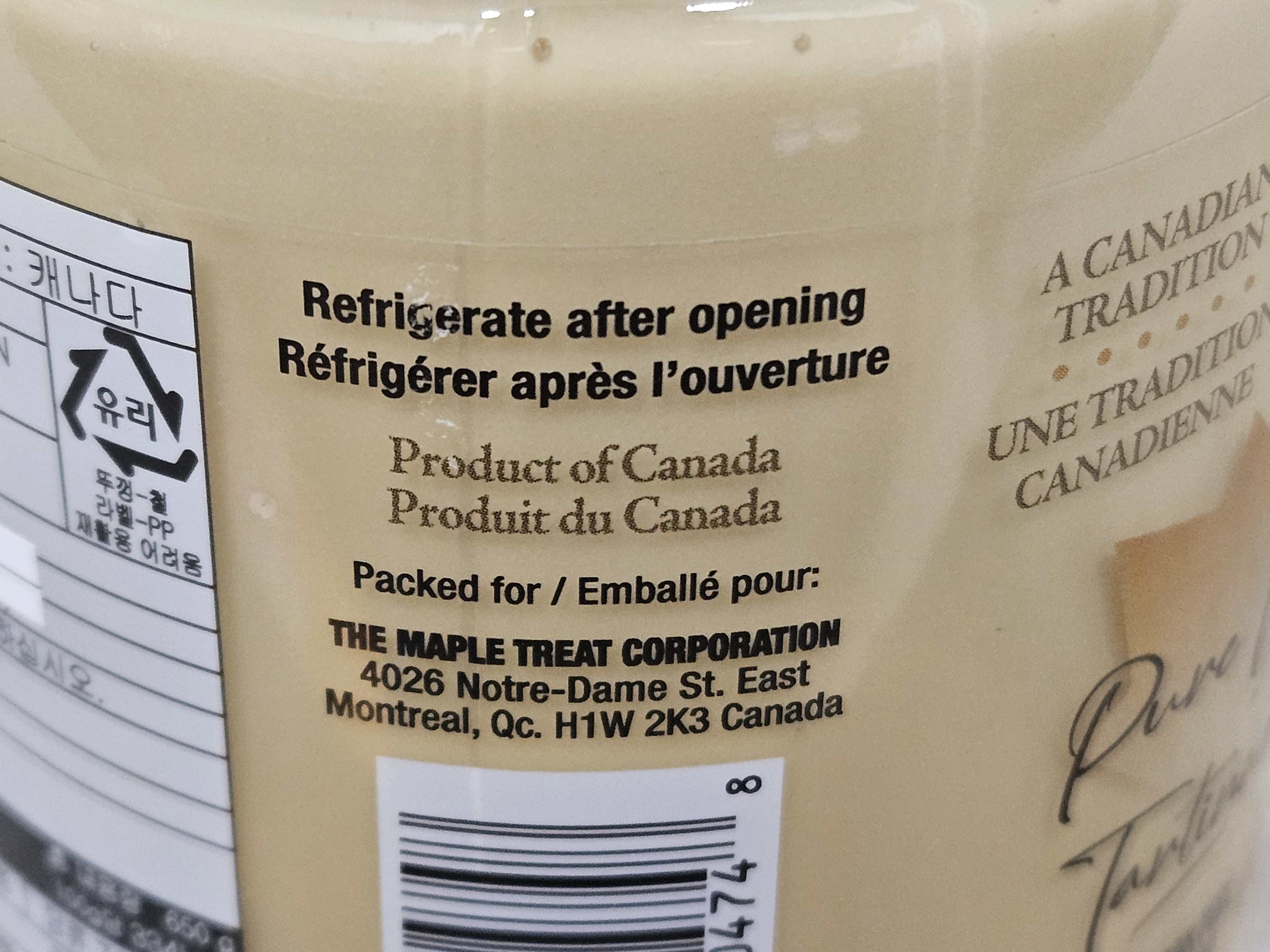 한글 표시사항과 동일하게 영어로도 단 한가지 재료, 메이플 시럽으로 만들어졌다고 합니다. 제품의 자연스러운 분리가 일어날 수 있고, 섭취하기 전에 단순하게 저어주면 된다고 합니다.