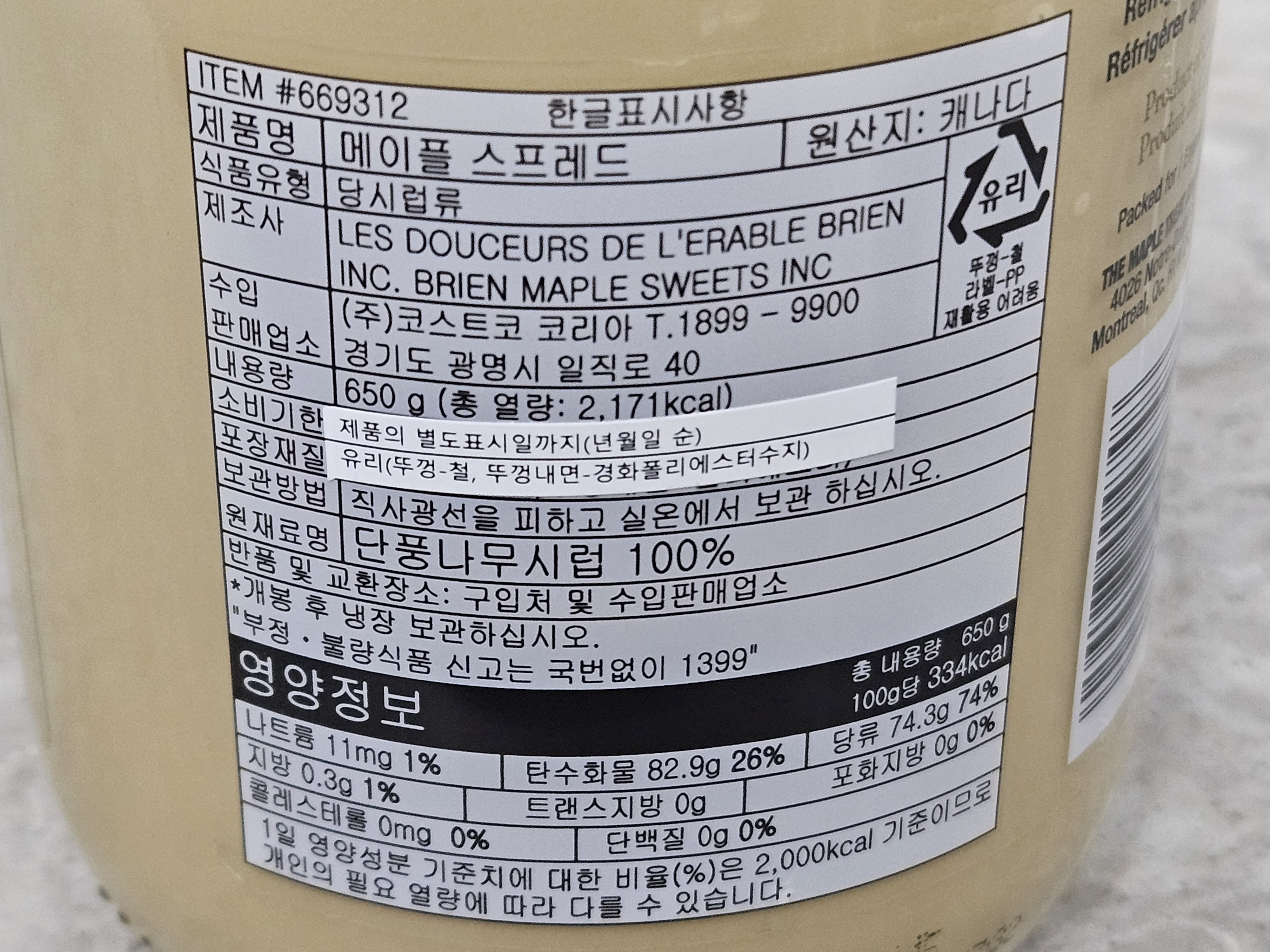 지인이 캐나다 여행 후기를 들려주면서, 메이플 시럽으로 만든 메이플 잼이 있는데 엄청 맛있다는 이야기를 한 적이 있습니다. 농축된 메이플 시럽의 맛인데, 식감이나 맛이 한국에서는 비슷한 것으로도 접해보지 못해서 더욱 새롭게 느껴졌다는 이야기를 들었었습니다. 그리고 한 달 전쯤 코스트코에 메이플 스프레드가 들어왔다는 소식을 듣고 구입해서 저에게도 한 병 선물해 줬습니다.