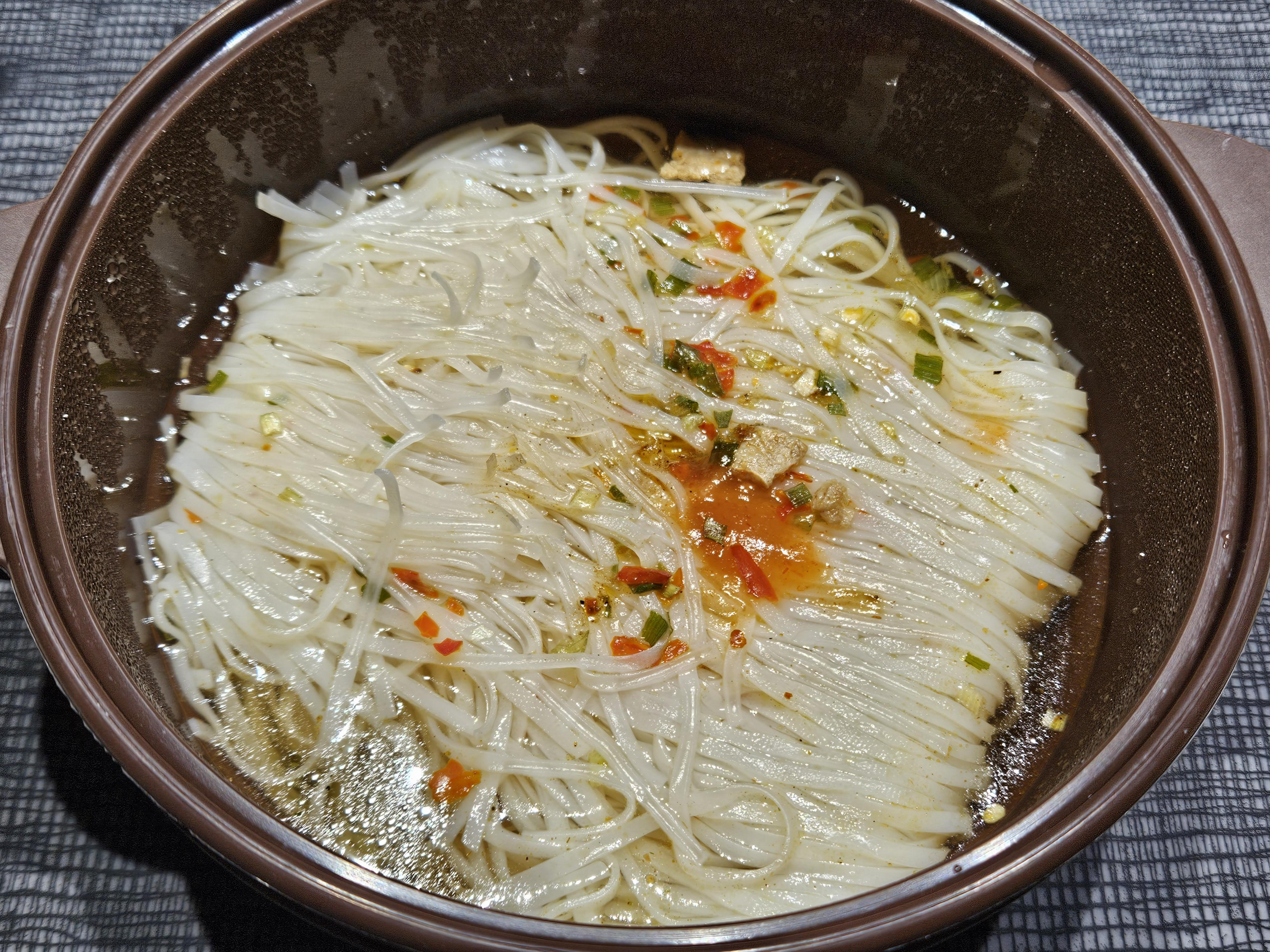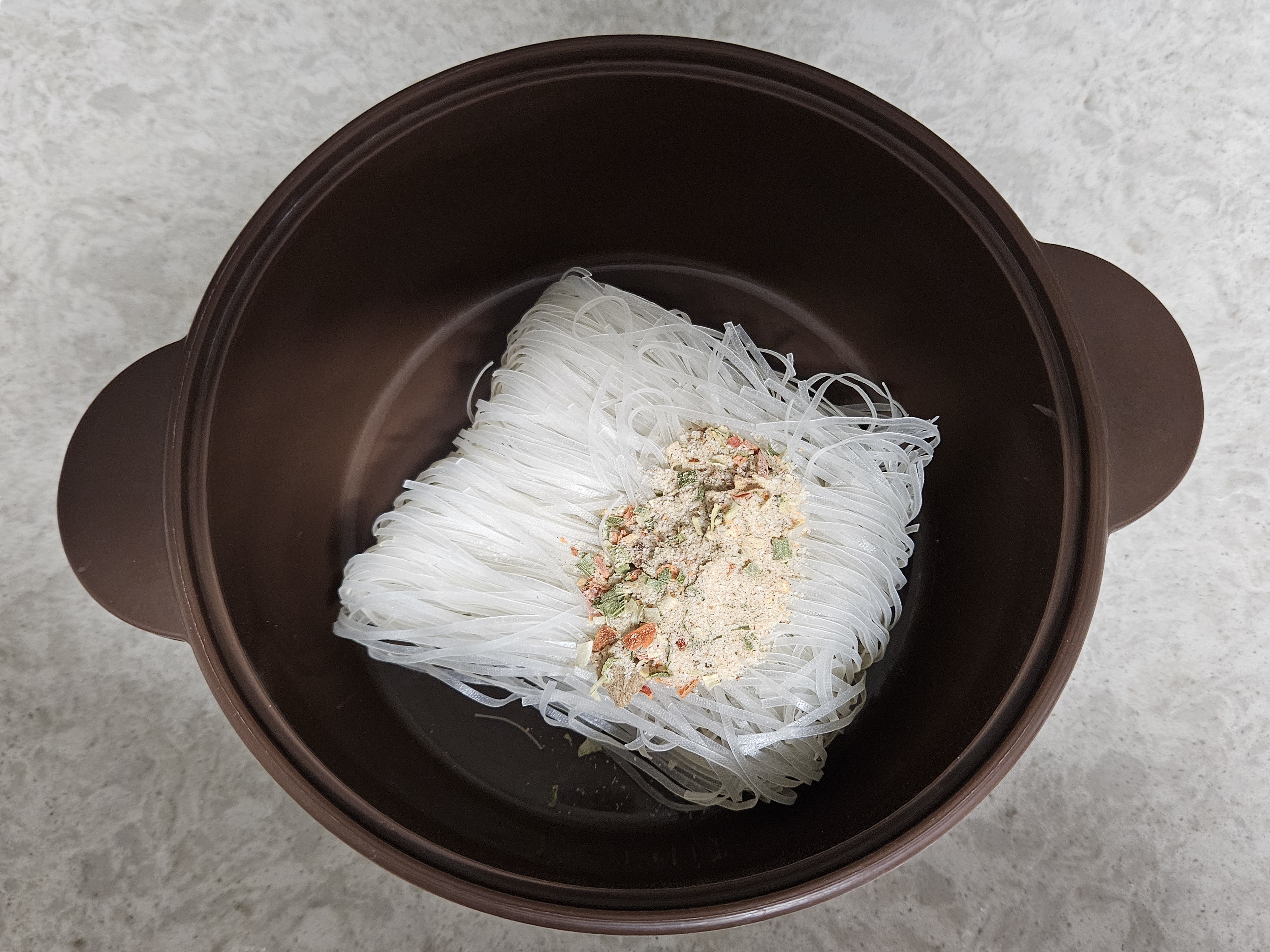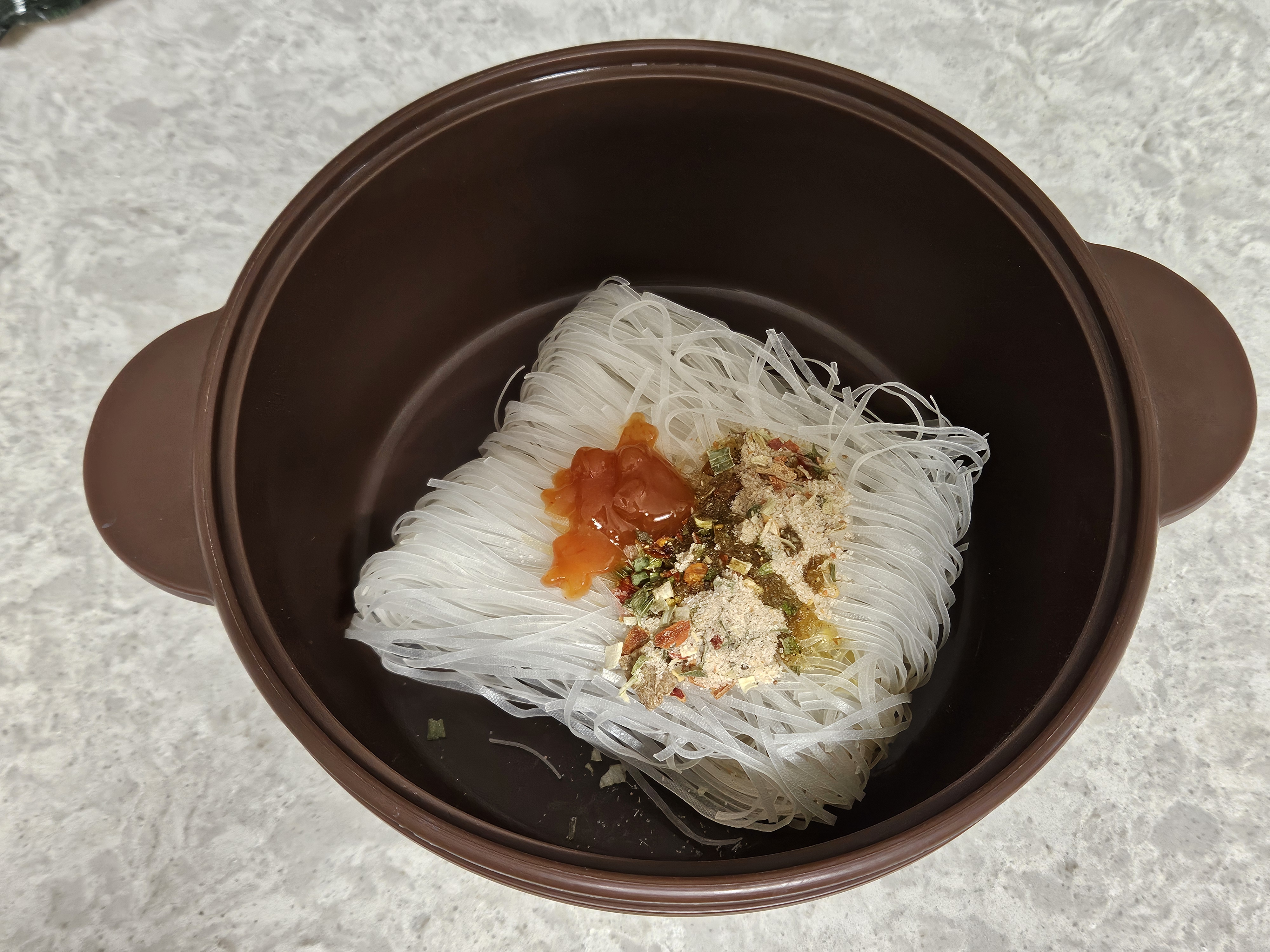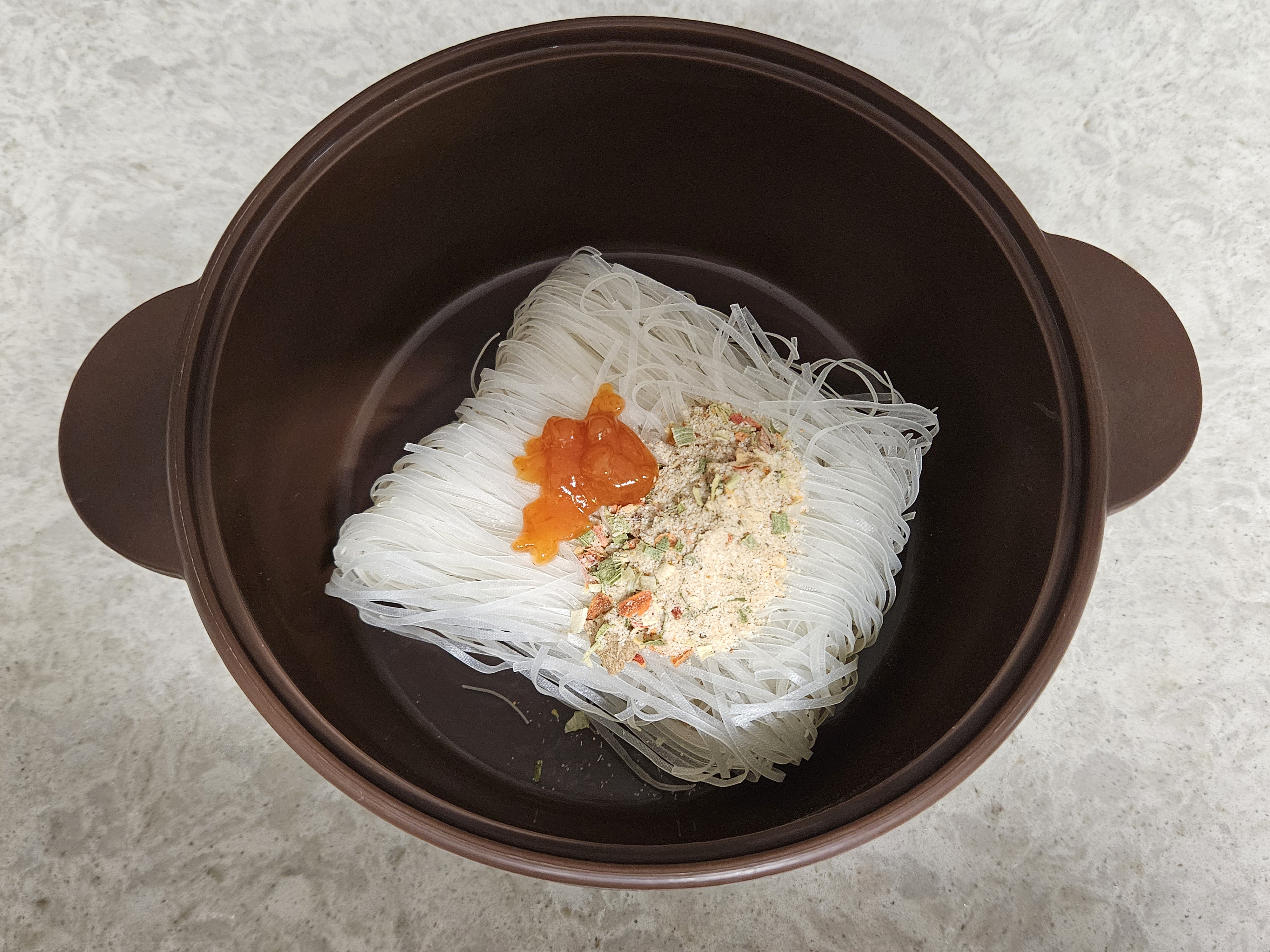 실리콘 냄비에 차례대로 쌀국수 면 - 분말스프 - 칠리소스 - 오일을 모두 넣었습니다. 분말스프가 좀 매운 냄새가 나는지, 분말 스프 넣을때 기침이 나왔습니다.