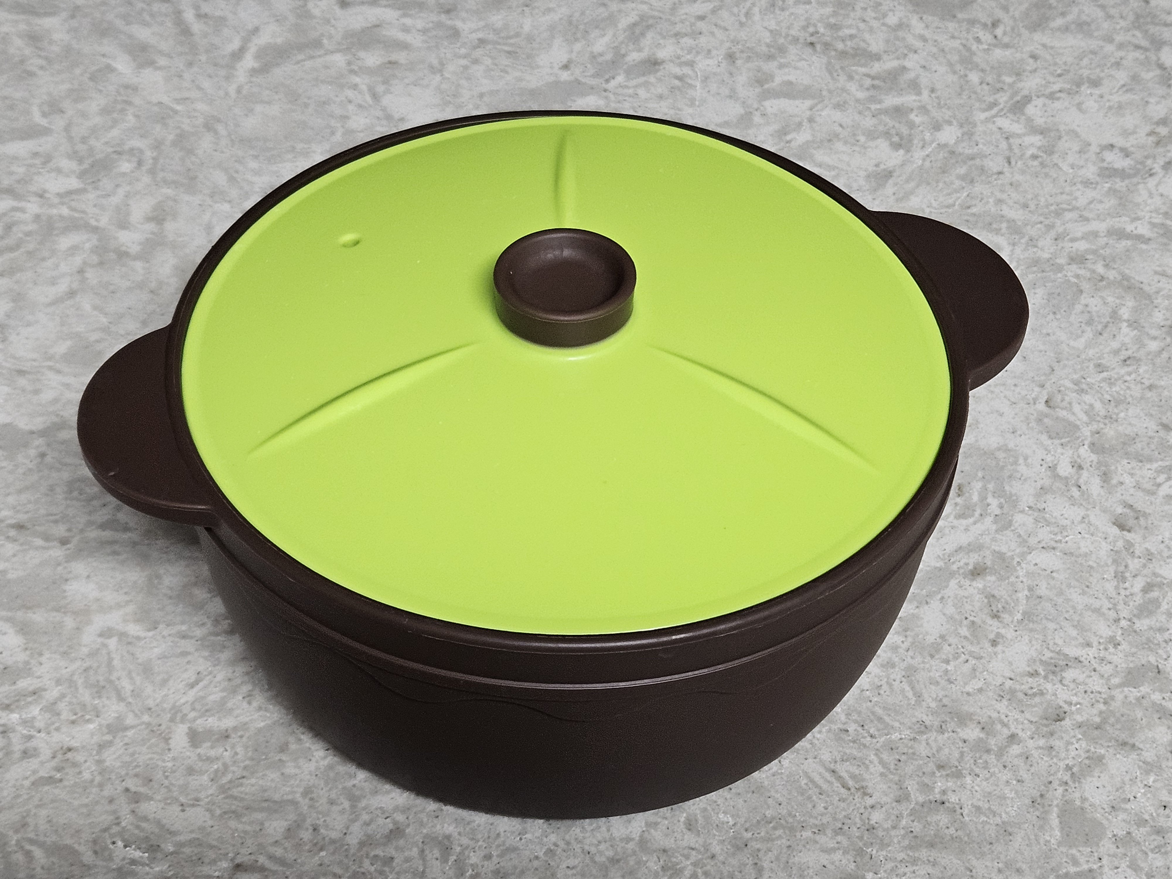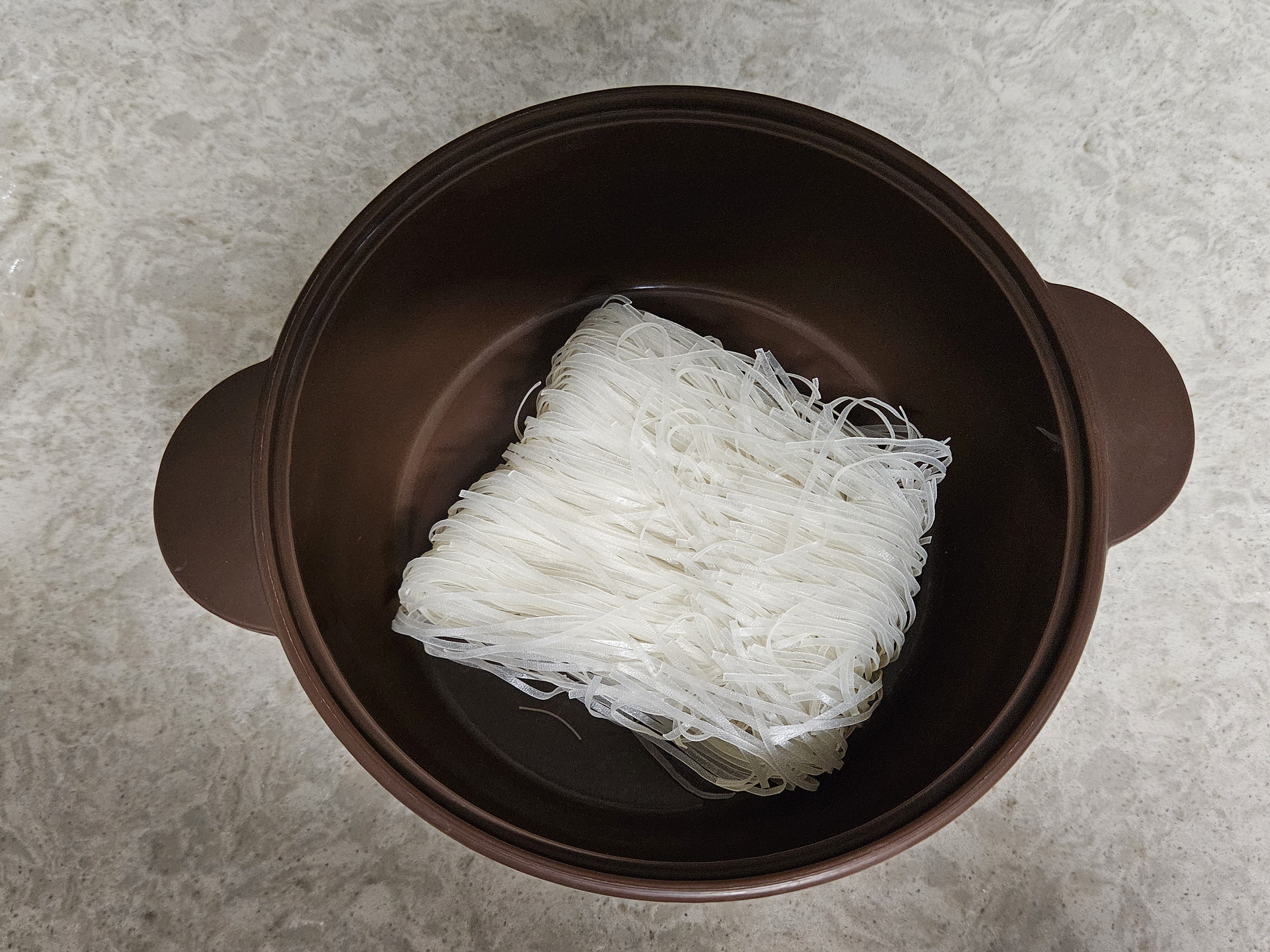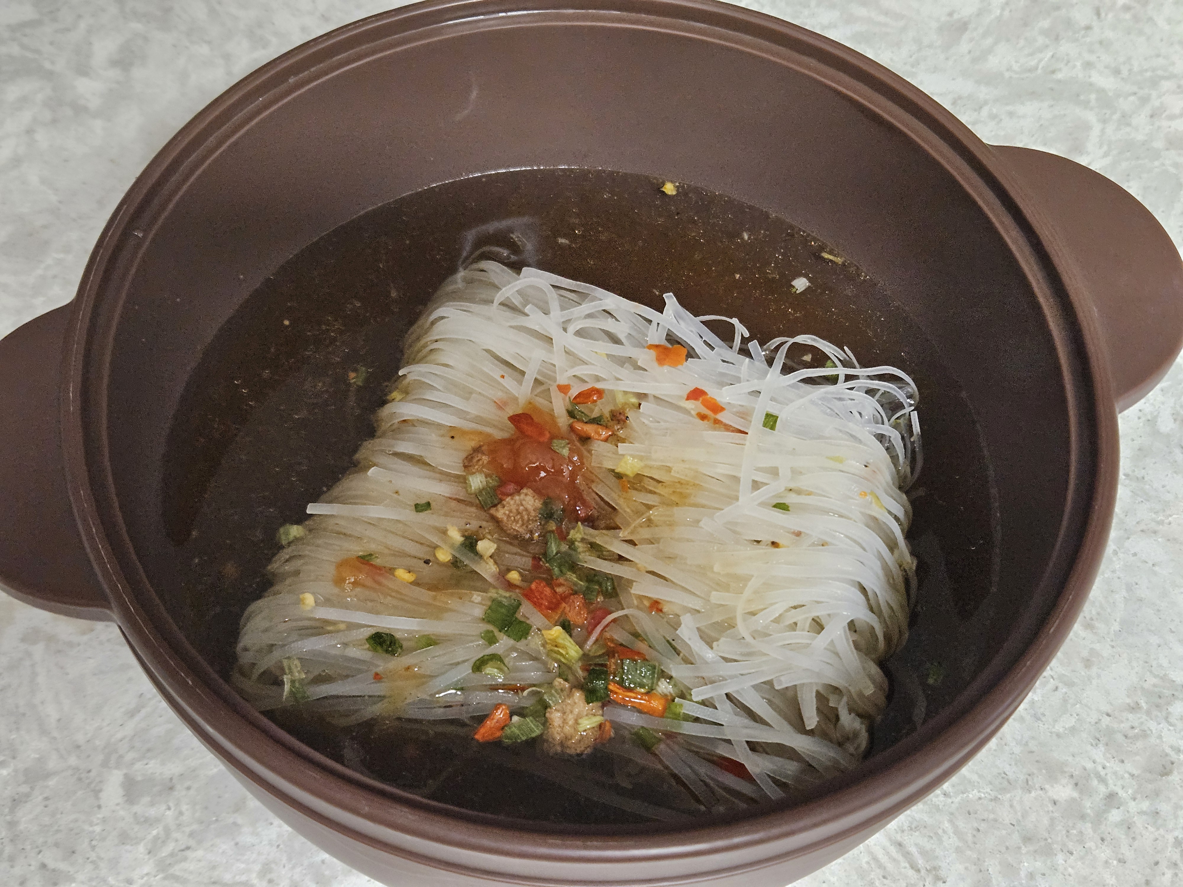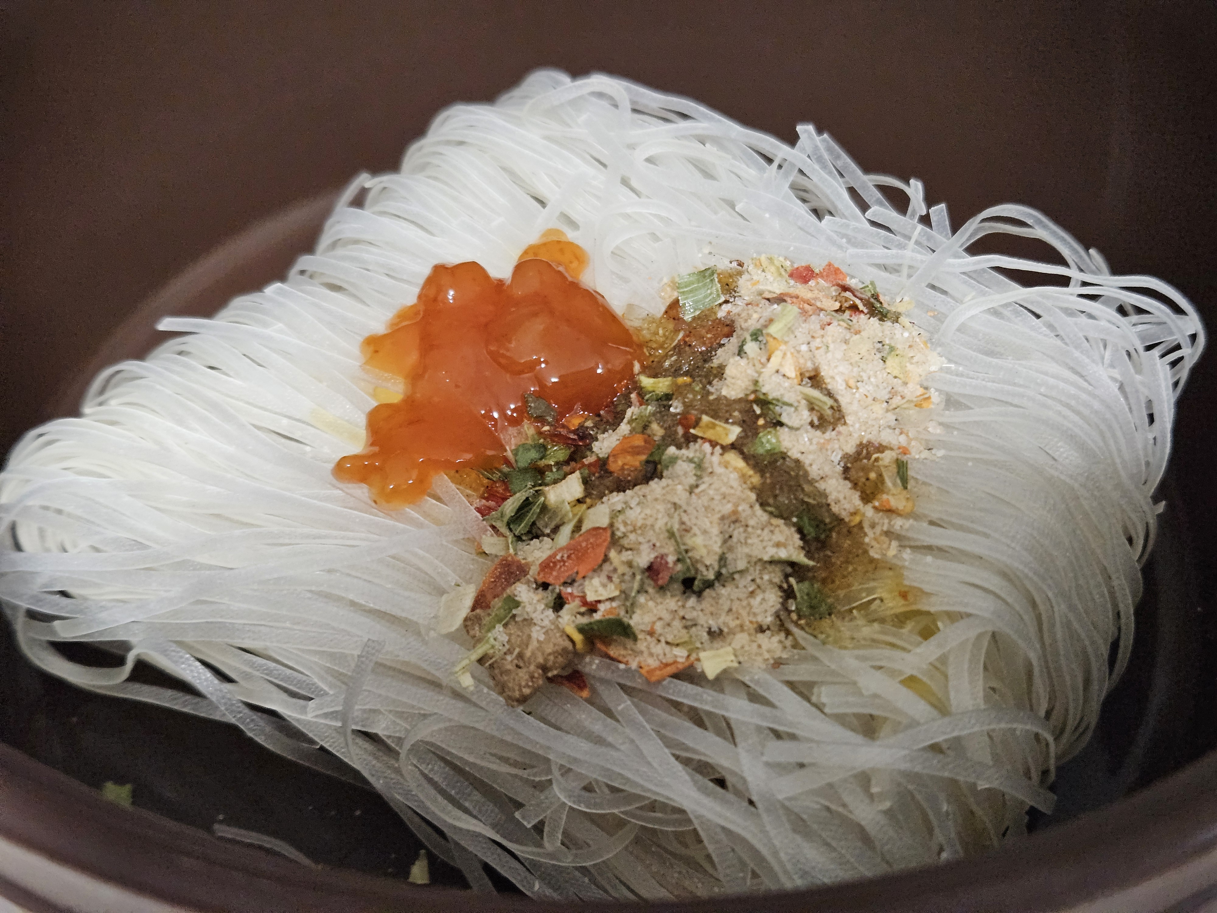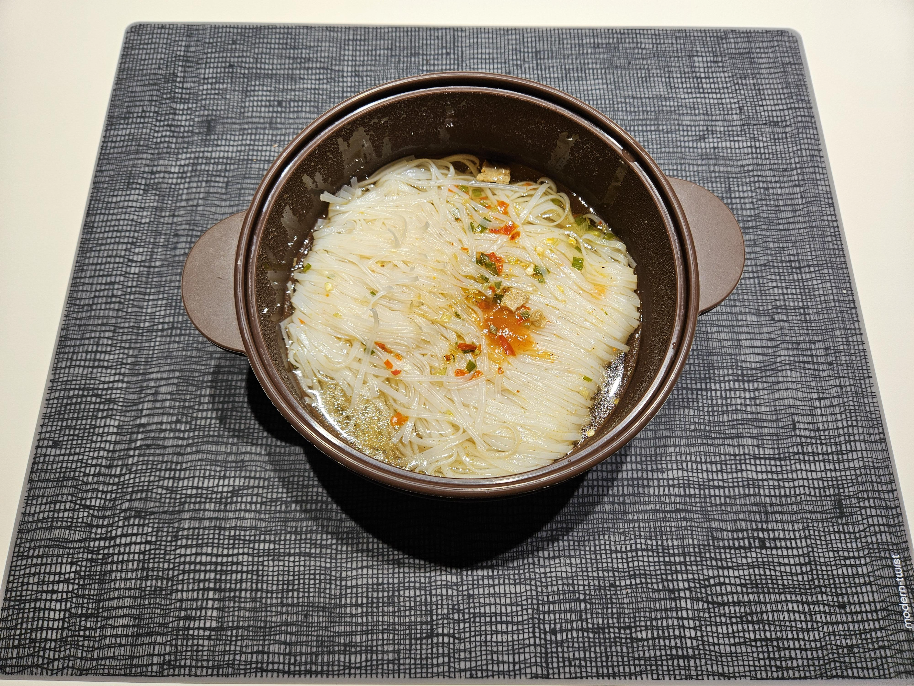 실리콘 냄비에 차례대로 쌀국수 면 - 분말스프 - 칠리소스 - 오일을 모두 넣었습니다. 분말스프가 좀 매운 냄새가 나는지, 분말 스프 넣을때 기침이 나왔습니다.