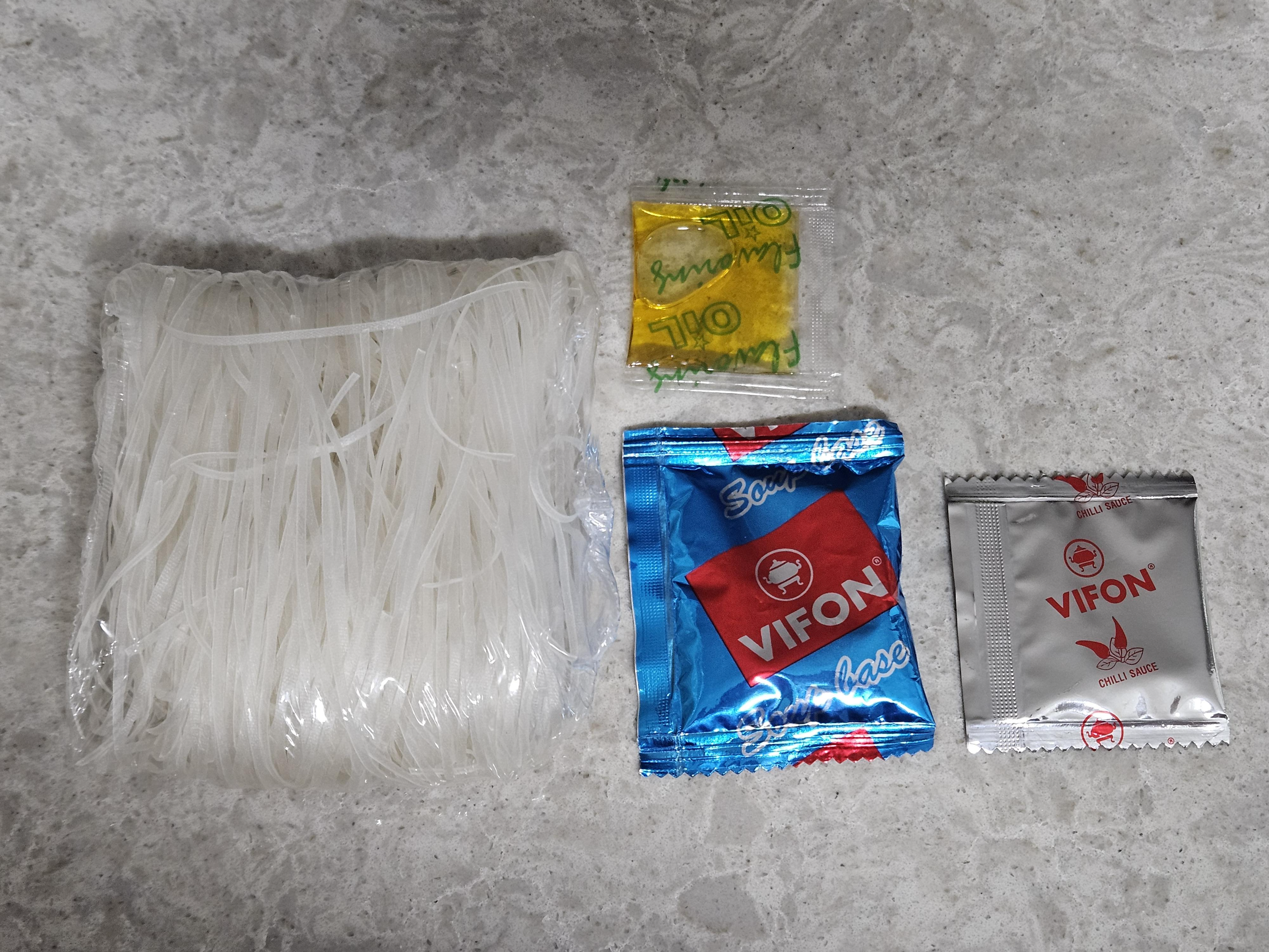 구성 품목입니다. 쌀국수 면과 분말스프, 칠리소스, 오일로 구성되어 있습니다.