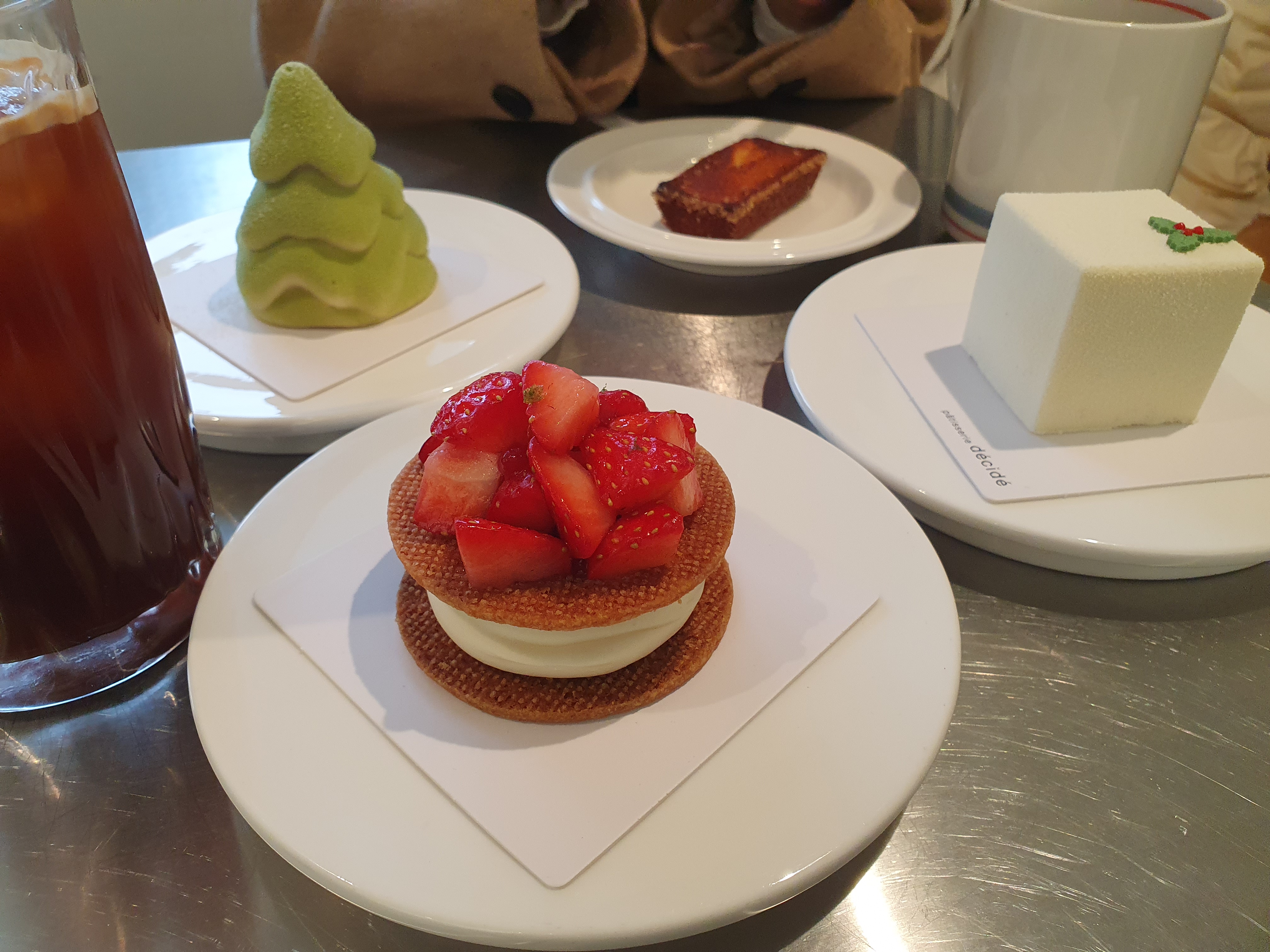 크리스마스가 막 지난 시점이어서 예쁜 트리도 있었습니다. 파티스리 데시데는 작은 골목길 사이로 난 아담한 디저트가게입니다. 테이블이 많지는 않아요. 저와 제 친구는 운이 좋게도 딱 한 테이블 자리가 나서 앉았는데, 이후로 오신 손님들은 자리가 없어서 포장해서 가셨어요.