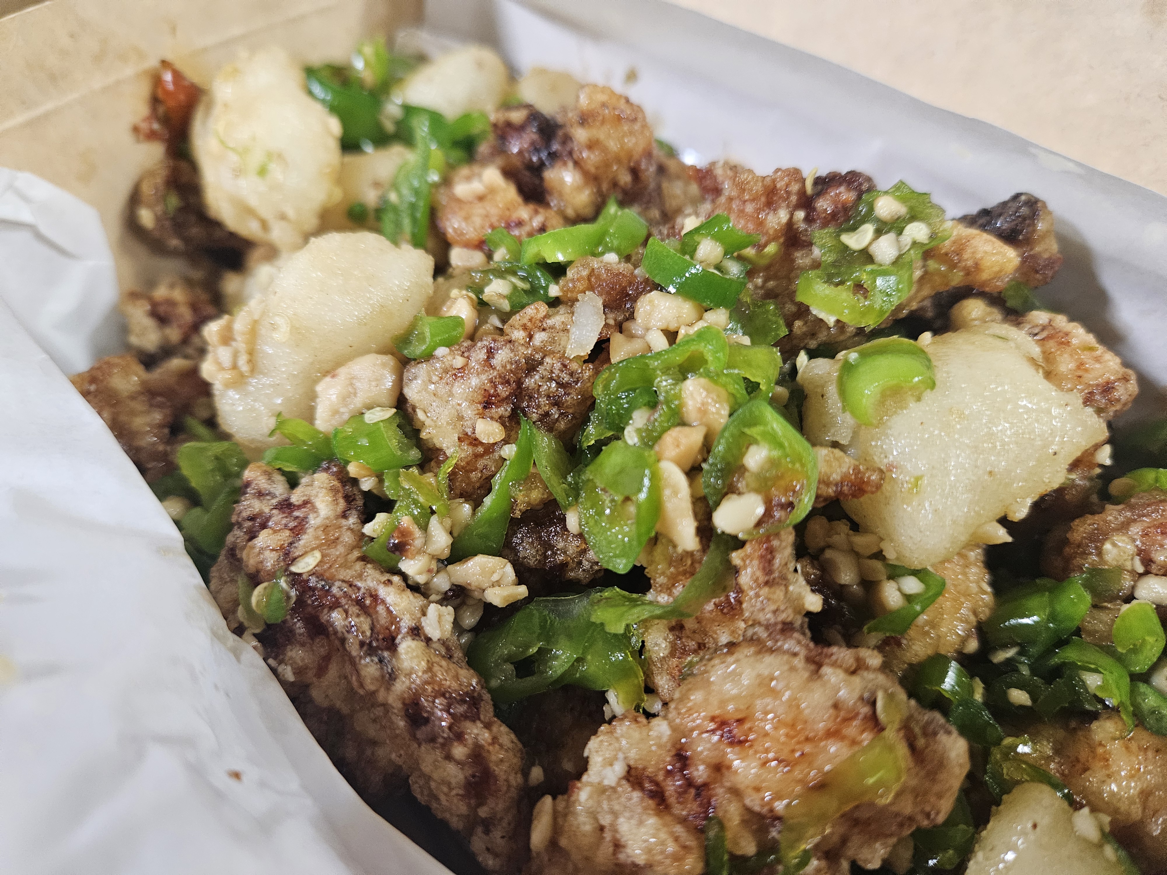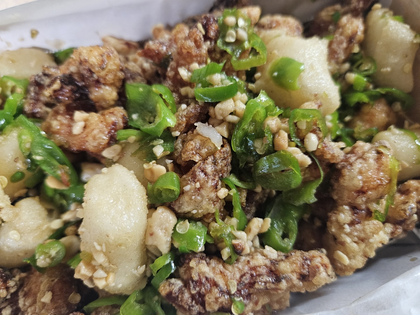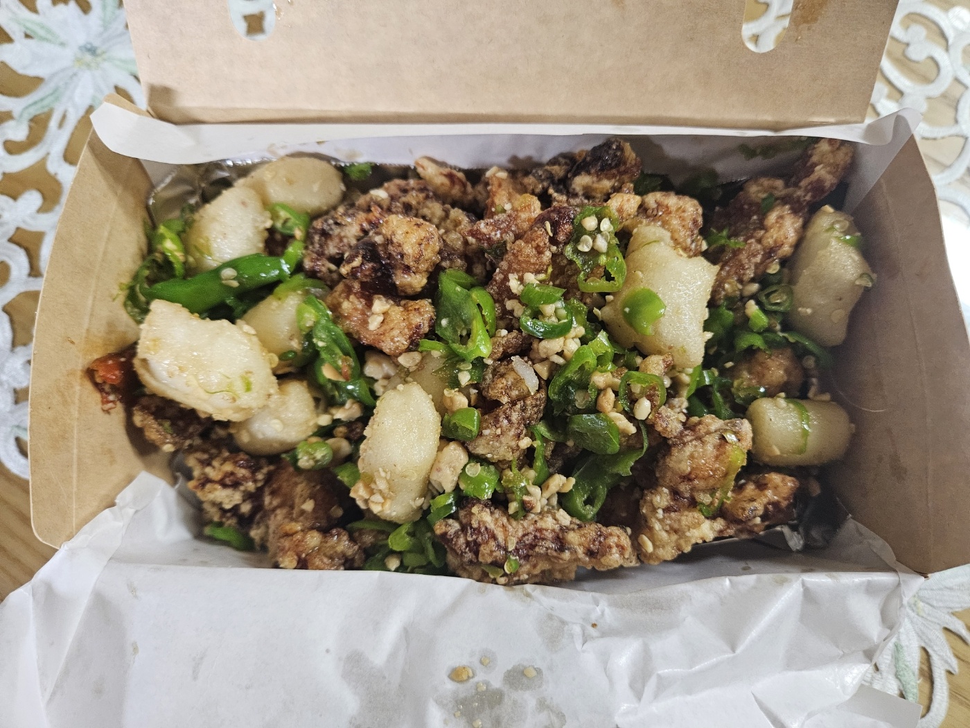 포장해서 들고 오는 내내 따끈한 닭강정의 온기와 고추의 매콤한 냄새 때문에 정신을 못 차렸습니다. 집에 오자마자 닭강정 상자를 오픈했어요. 찐덕찐덕 흐르는 붉은 양념되어있는 평범한 닭강정과 달리 야들야들한 순살로 된 닭강정 조각들은 말쑥하게 투명한 간장 양념에 버무려져있습니다. 청양고추가 꽤나 매운데, 닭강정 한 조각에 다진 청양고추를 많이 올려먹는게 맛있어요. 입이 맵다 싶으면 떡튀김을 먹으면 궁합이 최고입니다. 떡튀김은 잘 다져진 땅콩과 함께 먹으면 더 맛있고요.