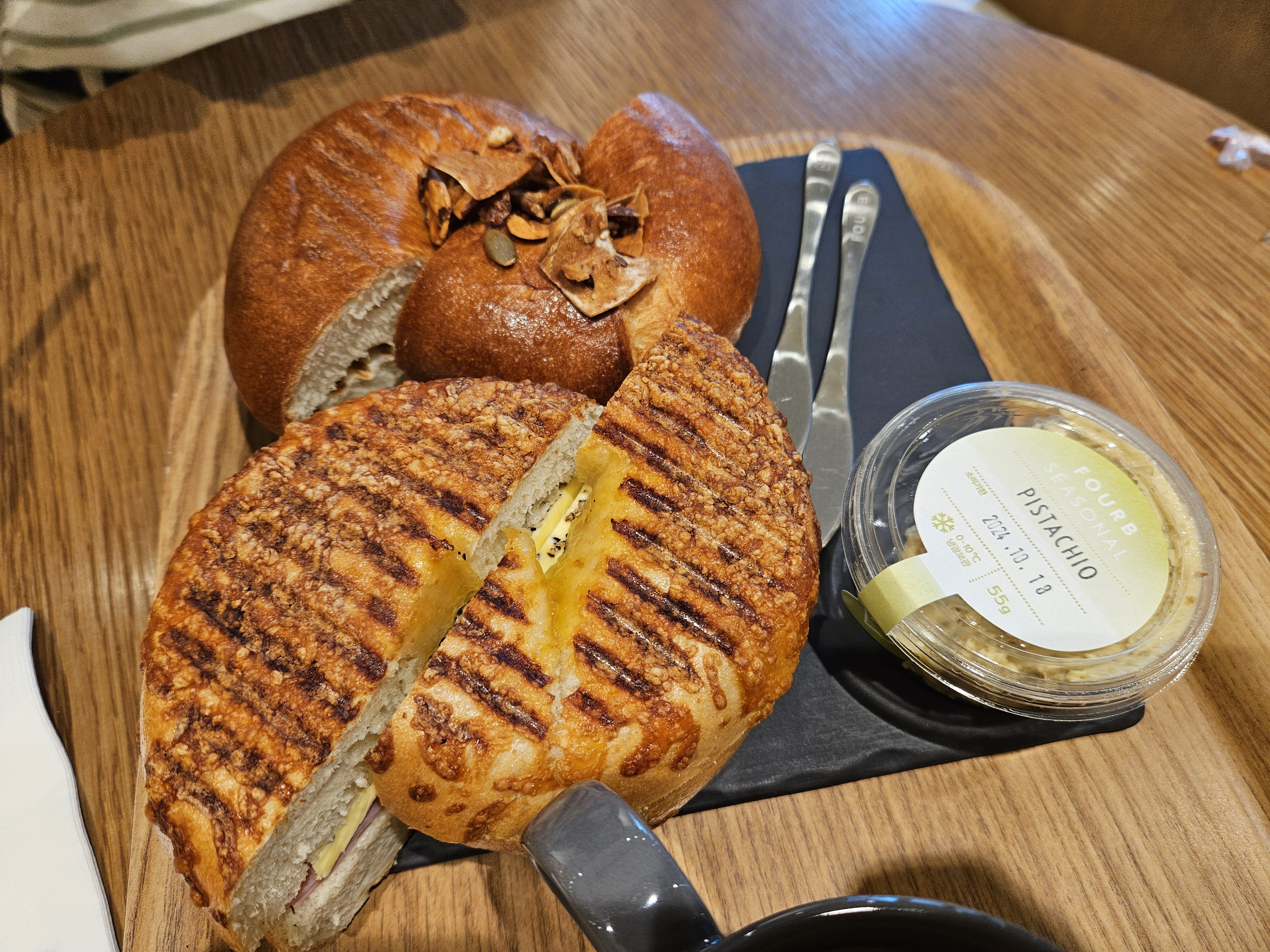 친구와 제가 주문한 메뉴는 포비 잠봉뵈르 샌드위치, 허니밀크 베이글, 피스타치오 스프레드입니다.