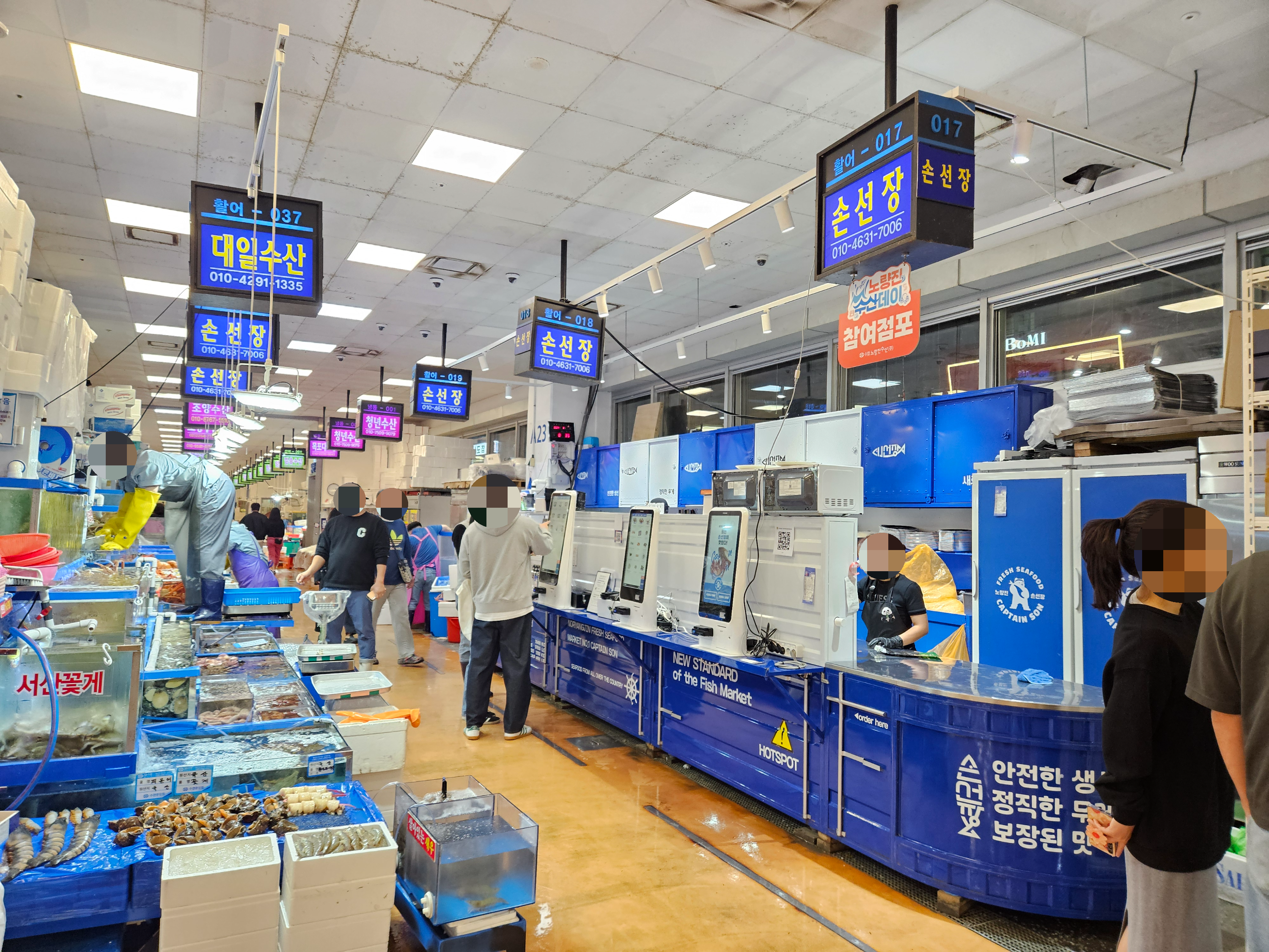 노량진까지 가게 된 계기는 상당히 즉흥적이었지만, 가기 전에 사전 검색을 통해 노량진 수산시장에서 손선장이 유명하는 정보를 입수했습니다. 노량진시장 손선장은 노량진수산시장 남3문으로 들어가면 바로 보여요. 활어 17부터 19까지 손선장인데, 맞은편 38부터 39도 손선장입니다. 그리고 신기하게도 키오스크가 있었어요. 노량진 수산시장에서 유일무이하게 보이는 최첨단 기기랄까요.