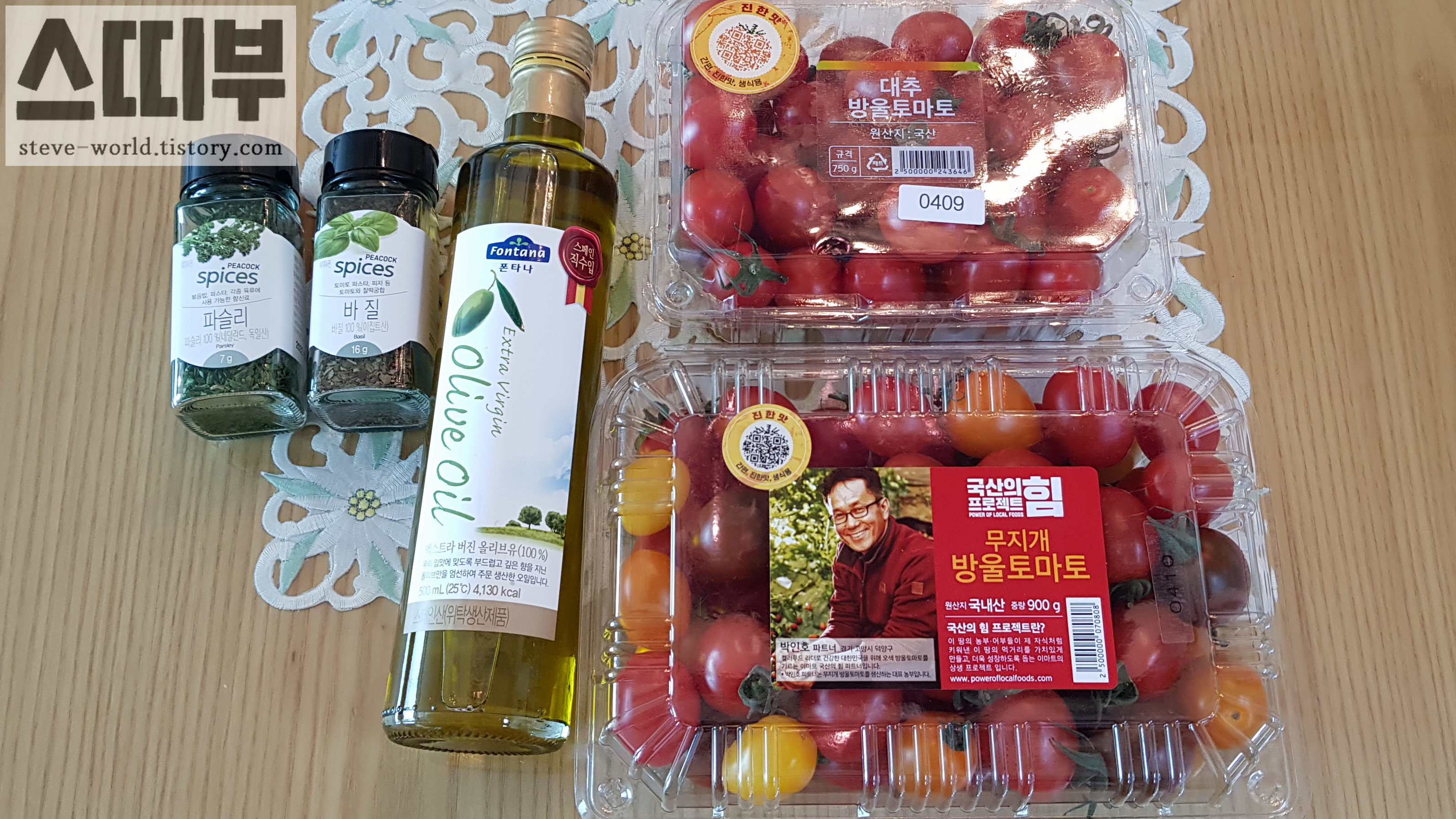 붉은색 방울토마토, 올리브 오일, 통후추, 바질, 편마늘로 차곡차곡 쌓았어요.