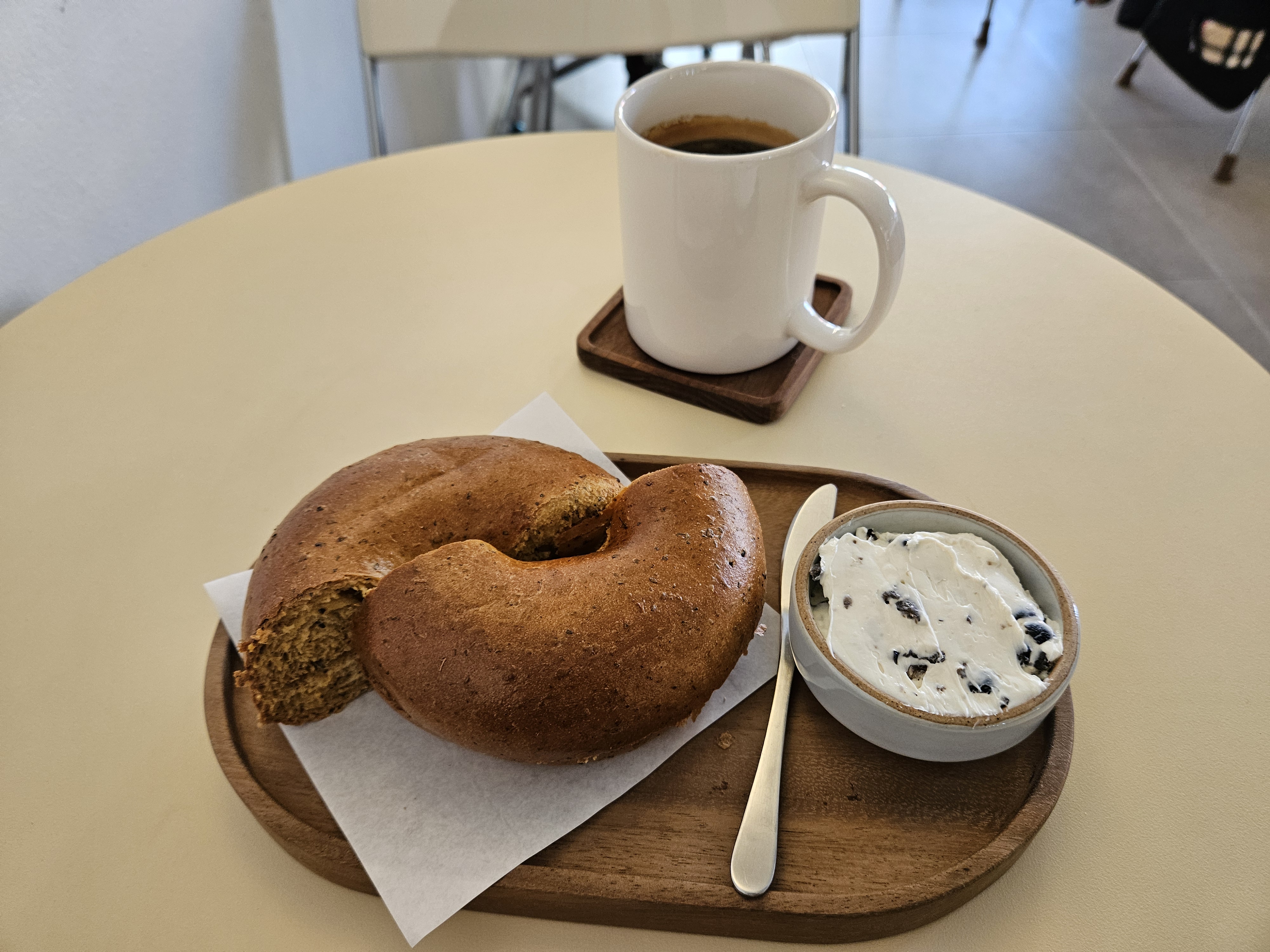 저는 따뜻한 아메리카노, 바질 토마토 베이글, 블랙 올리브 크림치즈를 주문했습니다. 식사용이라 달콤한 조합을 제외하고 주문해봤습니다.