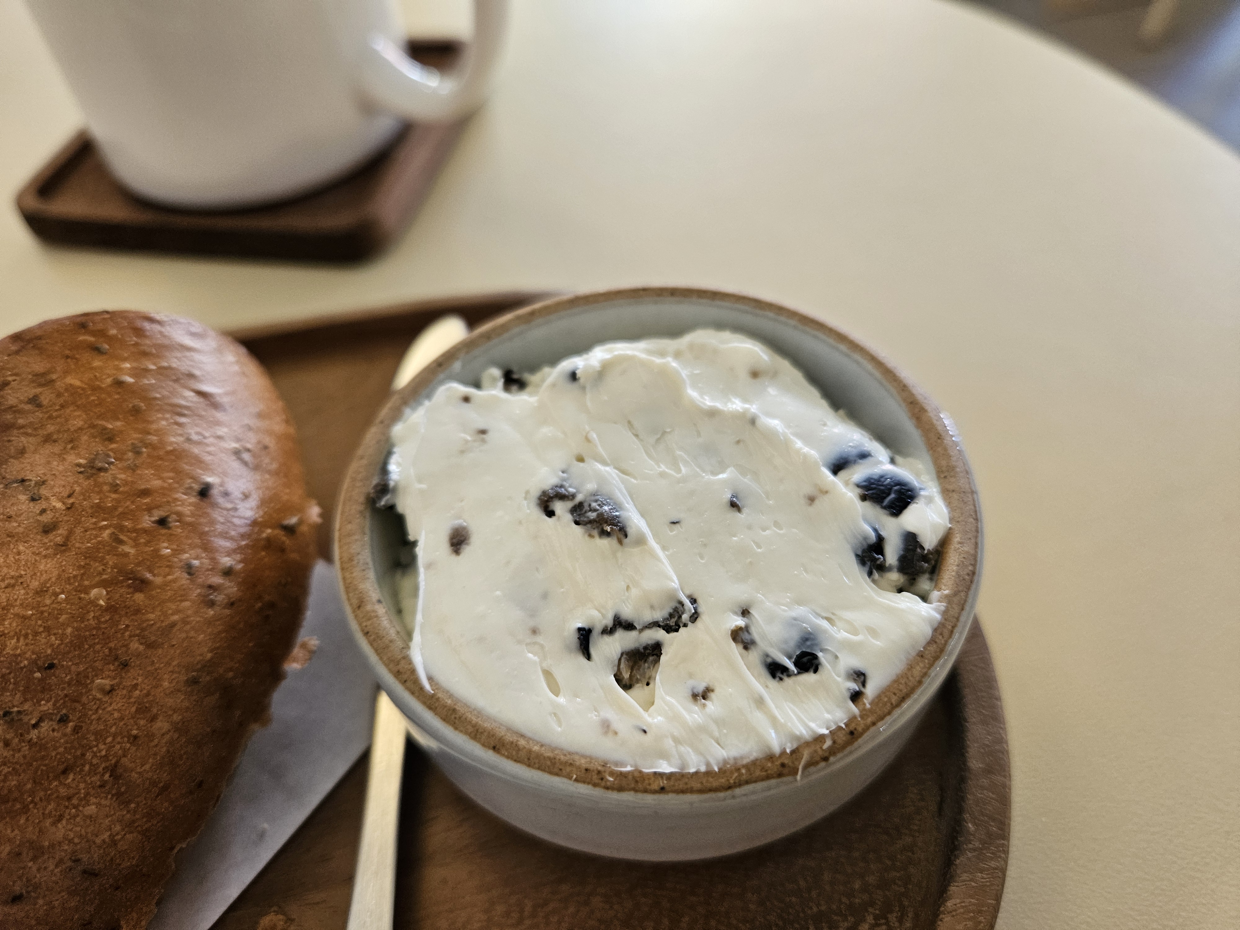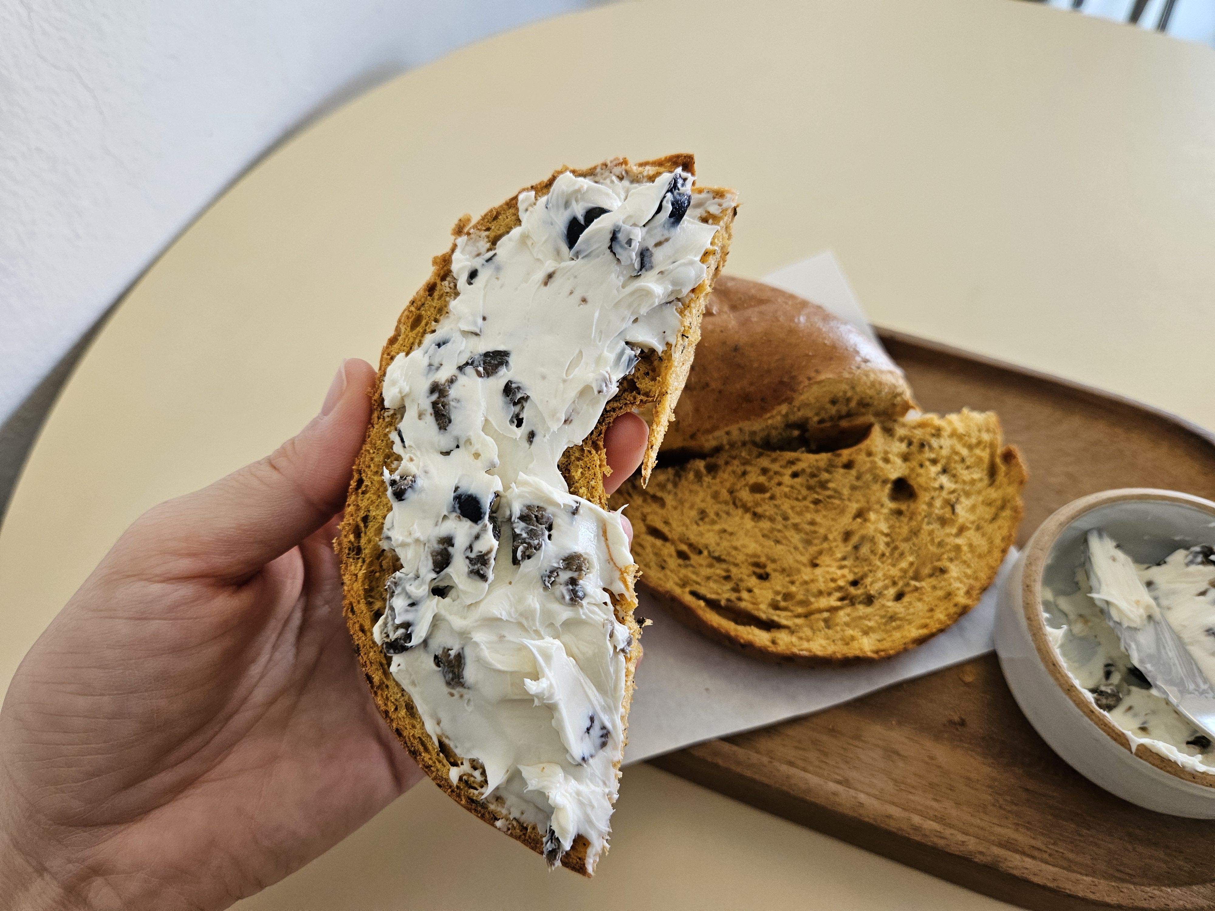 블랙 올리브 크림치즈 절반을 도톰하게 바른 뒤, 베이글 반쪽을 얹어 와구와구 먹었습니다.