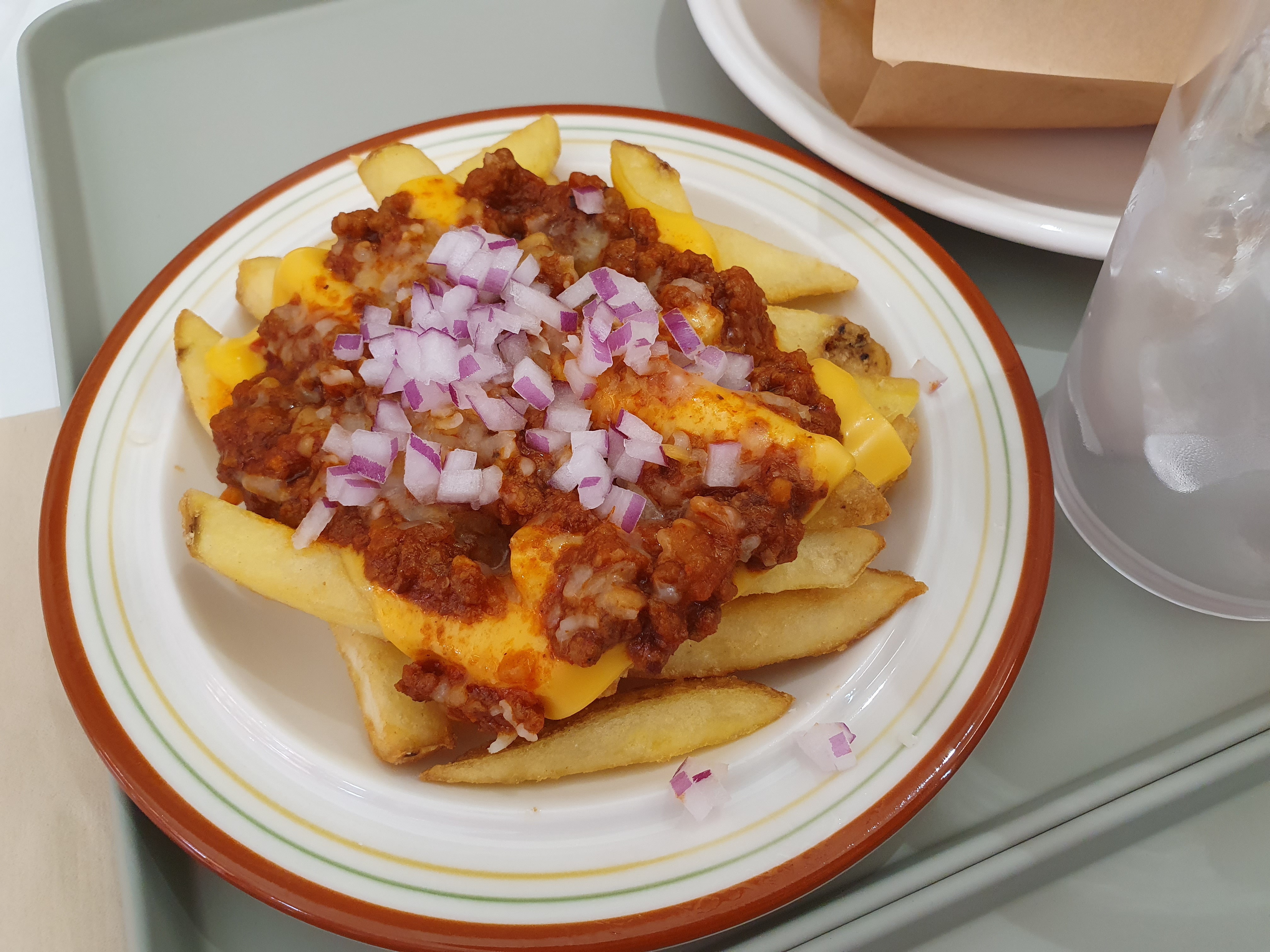 통통한 감자 위에 치즈, 칠리를 얹은 칠리치즈 감자입니다.