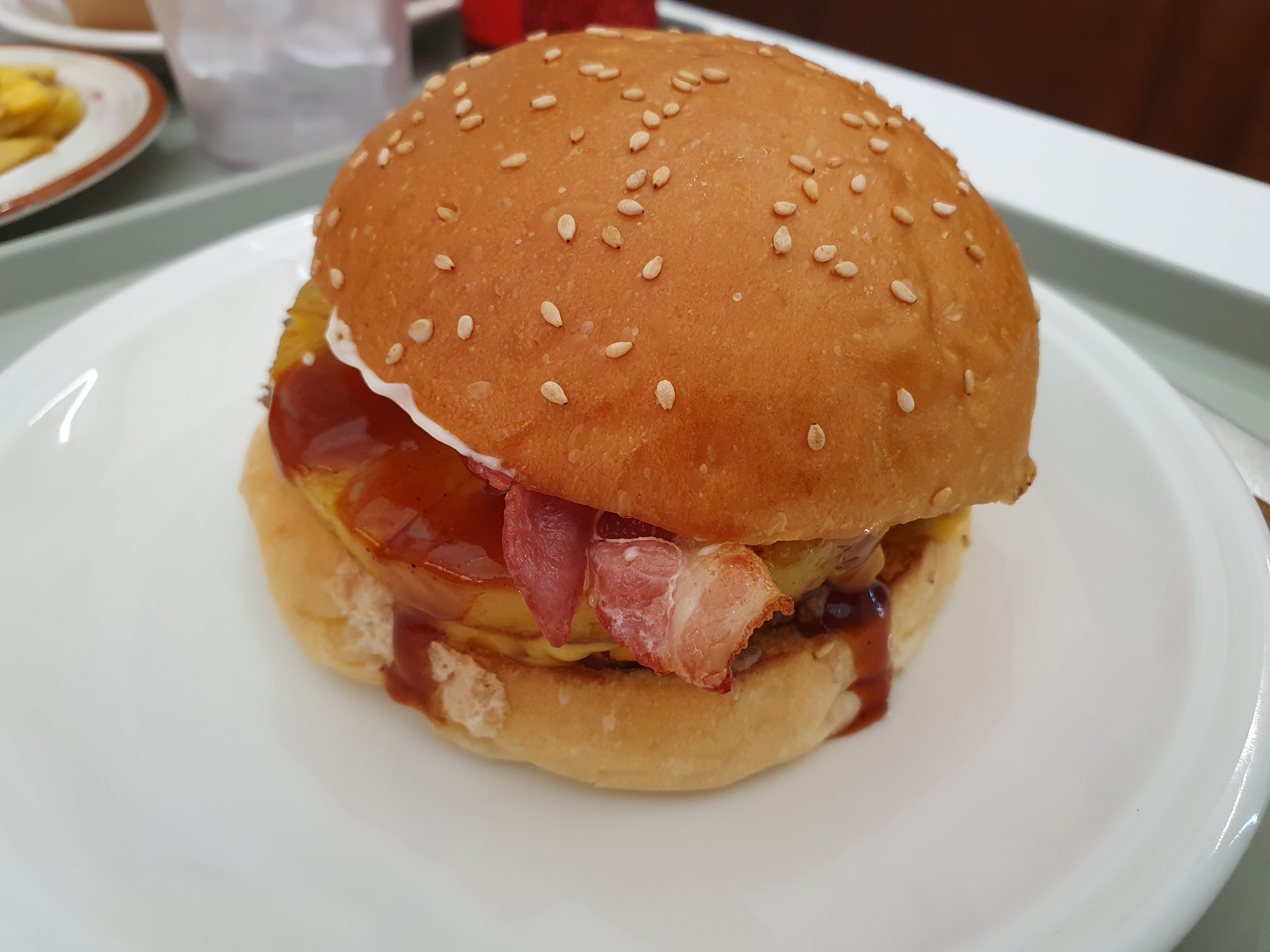 베이컨, 파인애플, 소고기 패티, 아메리칸치즈가 들어간 하와이안 버거입니다.