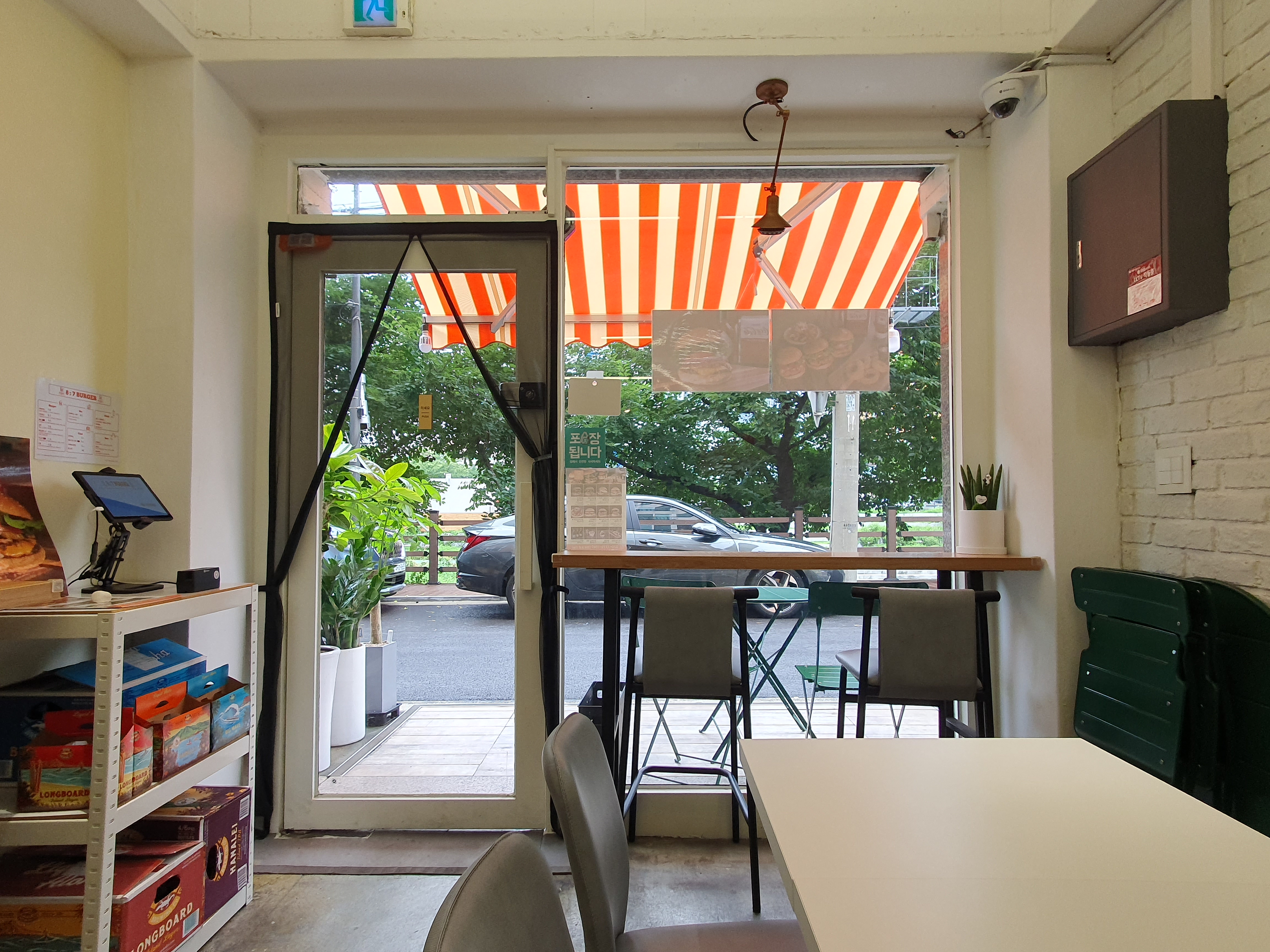 가게 내부입니다. 문을 열고 나서면 바로 불광천변이라 산책하다 들르기에도 무척 좋습니다. 빨간색 흰색 줄무늬의 차양막이 아주 멋있습니다. 붉은 색과의 조화가 가게 안을 더욱 따뜻하게 보여주는 것 같아요.