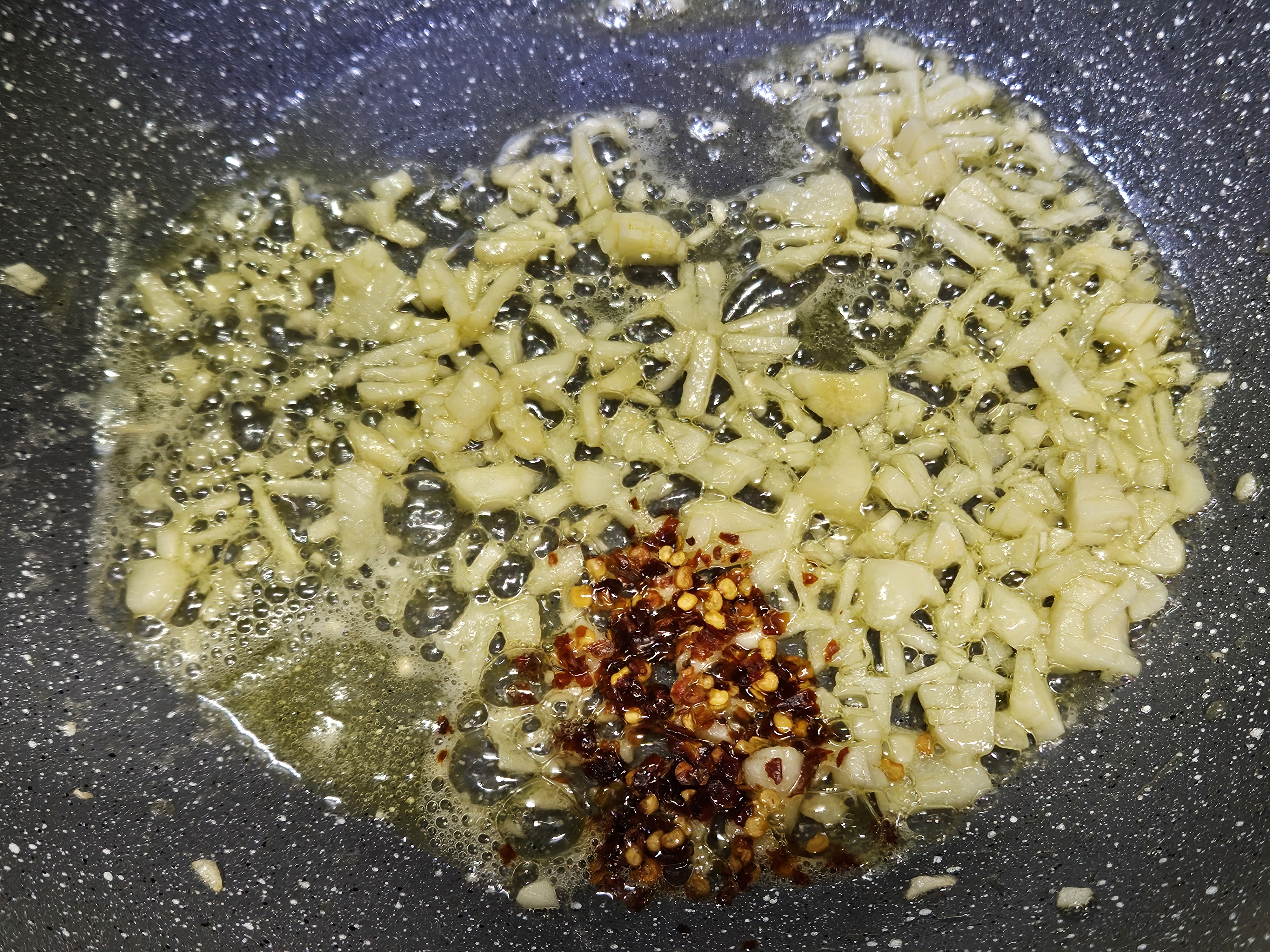 마늘이 황금색일 떄, 페퍼론치노를 넣고 함께 볶아줍니다. 저는 매콤한 것을 좋아해서 페퍼론치노를 꼭 넣는 편인데, 고소하게 드시고 싶으시다면 꼭 넣지 않으셔도 됩니다.