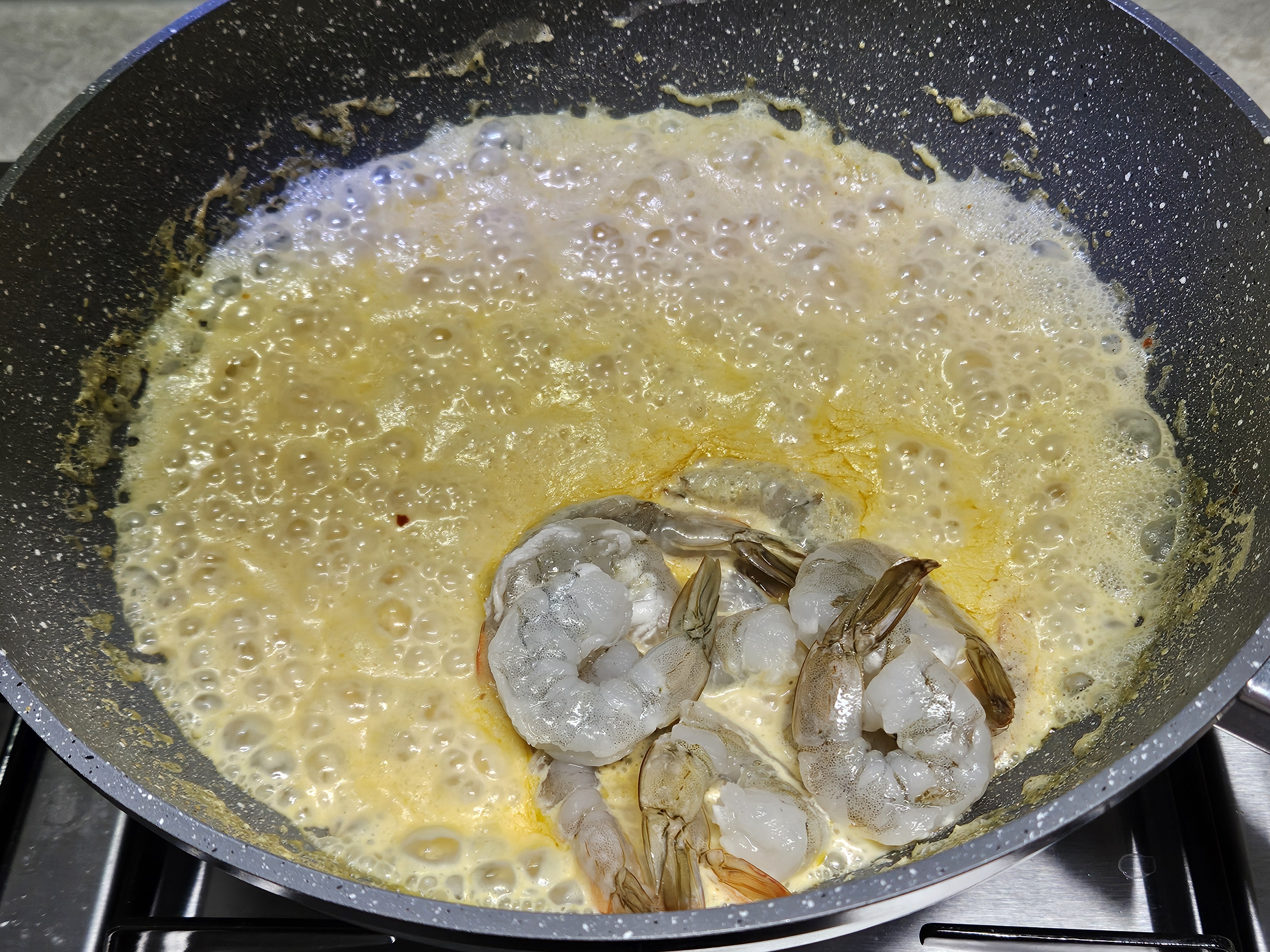 우유도 좀 줄고, 바글바글 잘 끓여졌다 싶으면, 준비해둔 새우로 넣고 볶아줍니다.