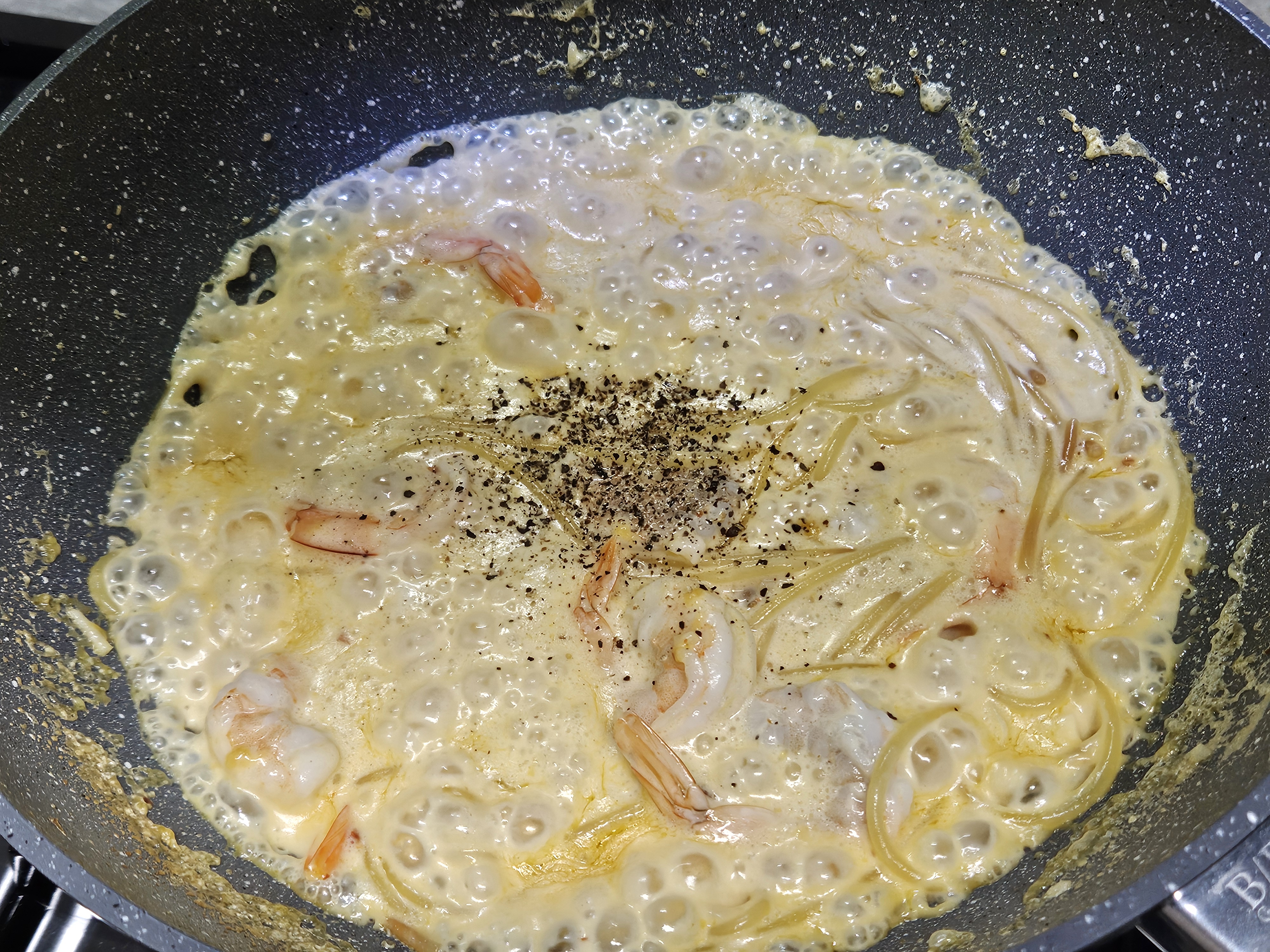 크림파스타에서 없으면 안될 후추를 넣고, 조금 더 볶아줍니다.