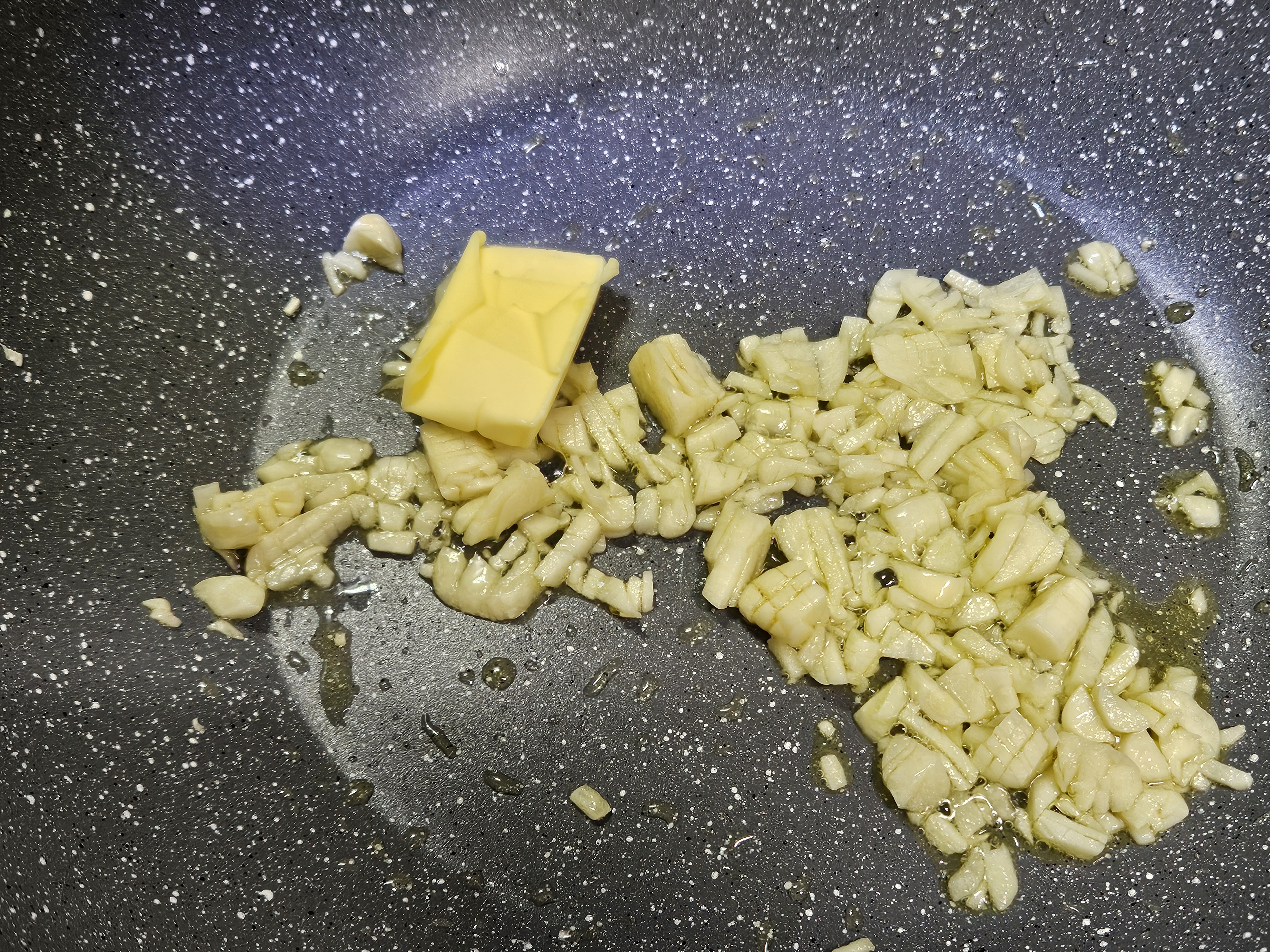 마늘이 좀 볶였다 싶으면 버터를 넣어 함께 볶습니다.