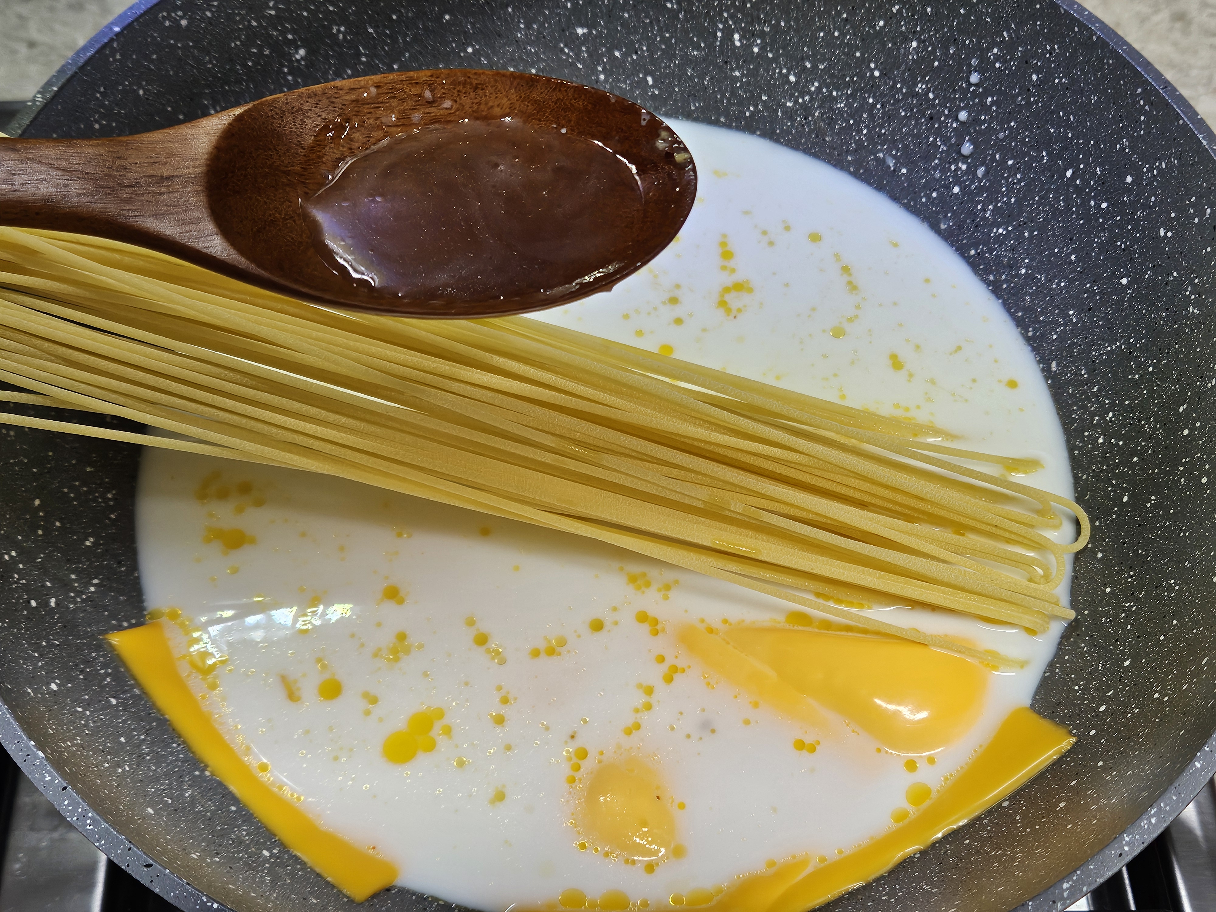 2) 마늘이 갈색으로 변하기 시작하면, 우유 300ml + 체다치즈 2장 + 스파게티 면 + 참치액젓 1스푼 넣고 중강불에서 끓입니다.