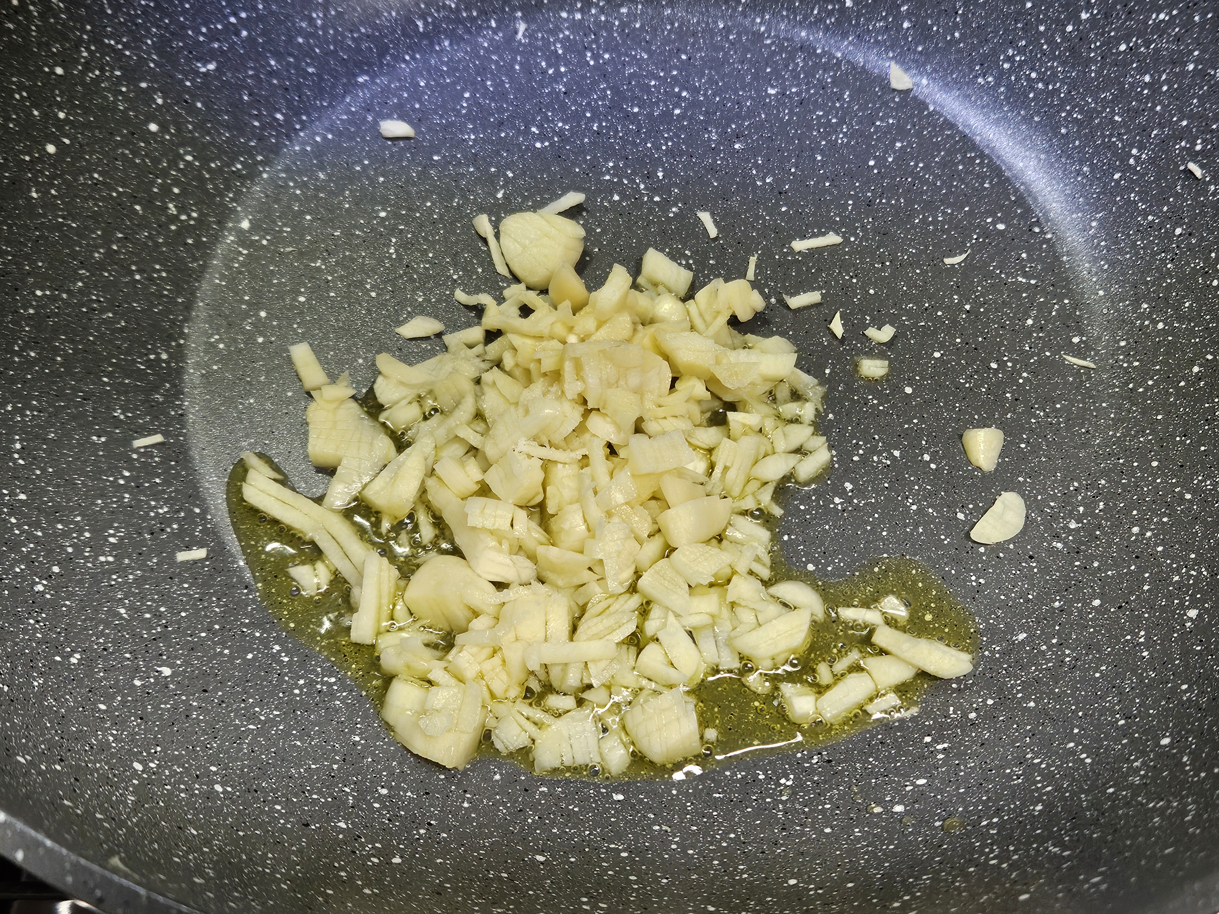 1) 약불에서 올리브유 + 마늘 + 소금 한꼬집 넣고 볶다가 버터 + 페퍼론치노 넣고 함께 볶습니다.