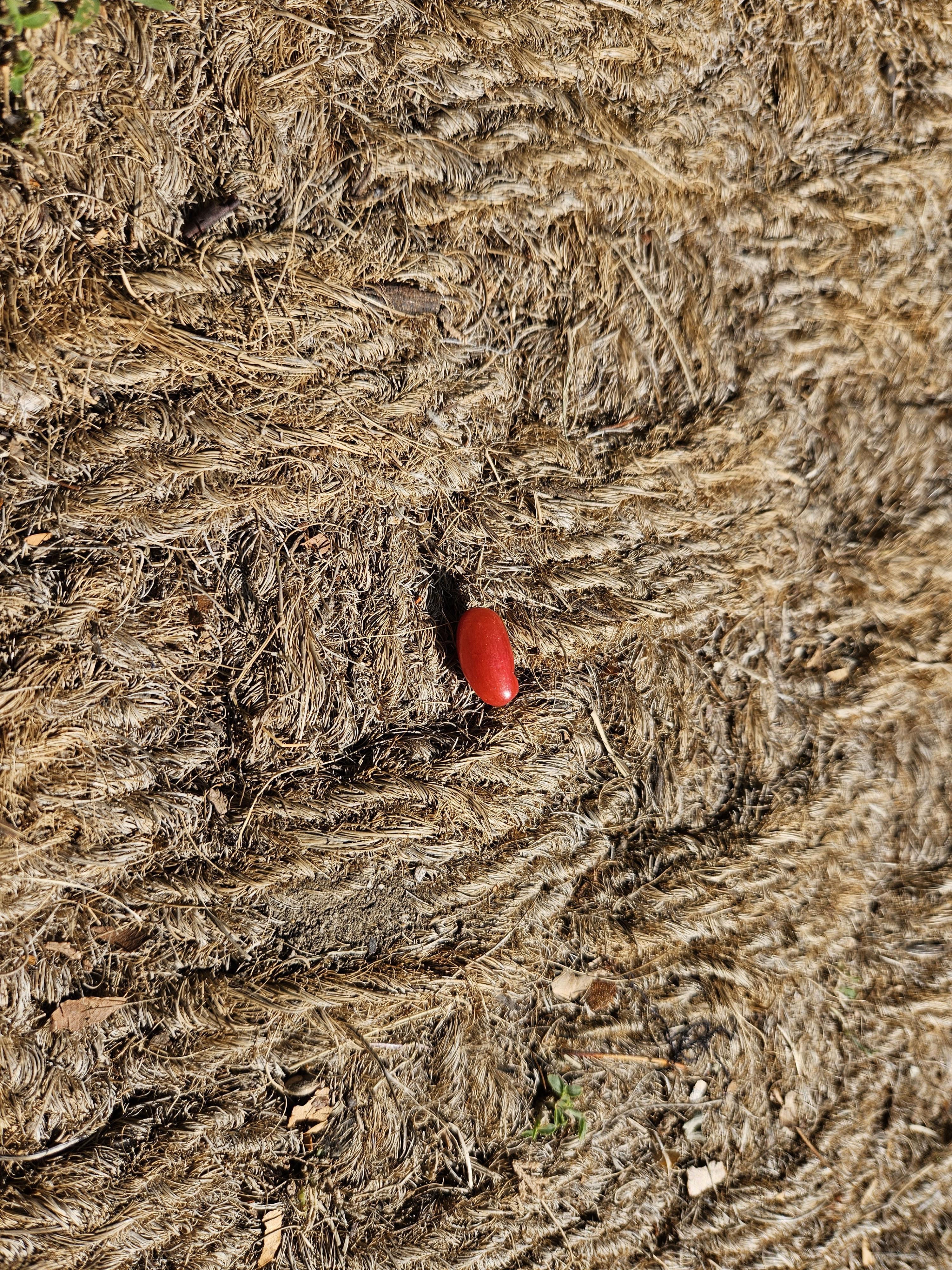탐스럽게 익은 산수유 열매가 바닥에 여러개 떨어져 있었어요.