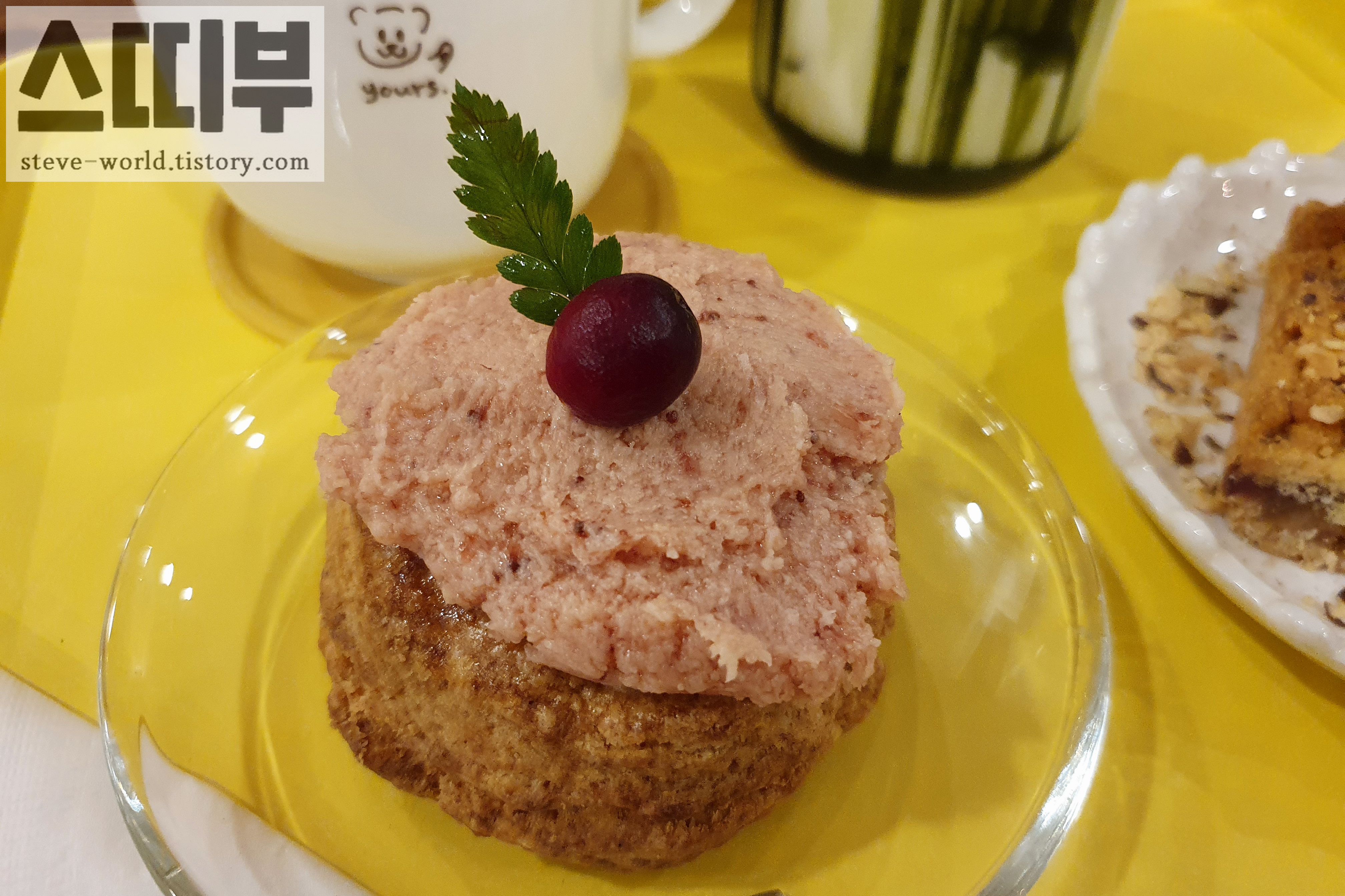 딸기 크림이 올라간 스트로베리 스콘, 딸기 크림이 인위적인 단맛이 아니고 새콤 달콤한 딸기의 맛이 느껴져서 맛있었습니다.