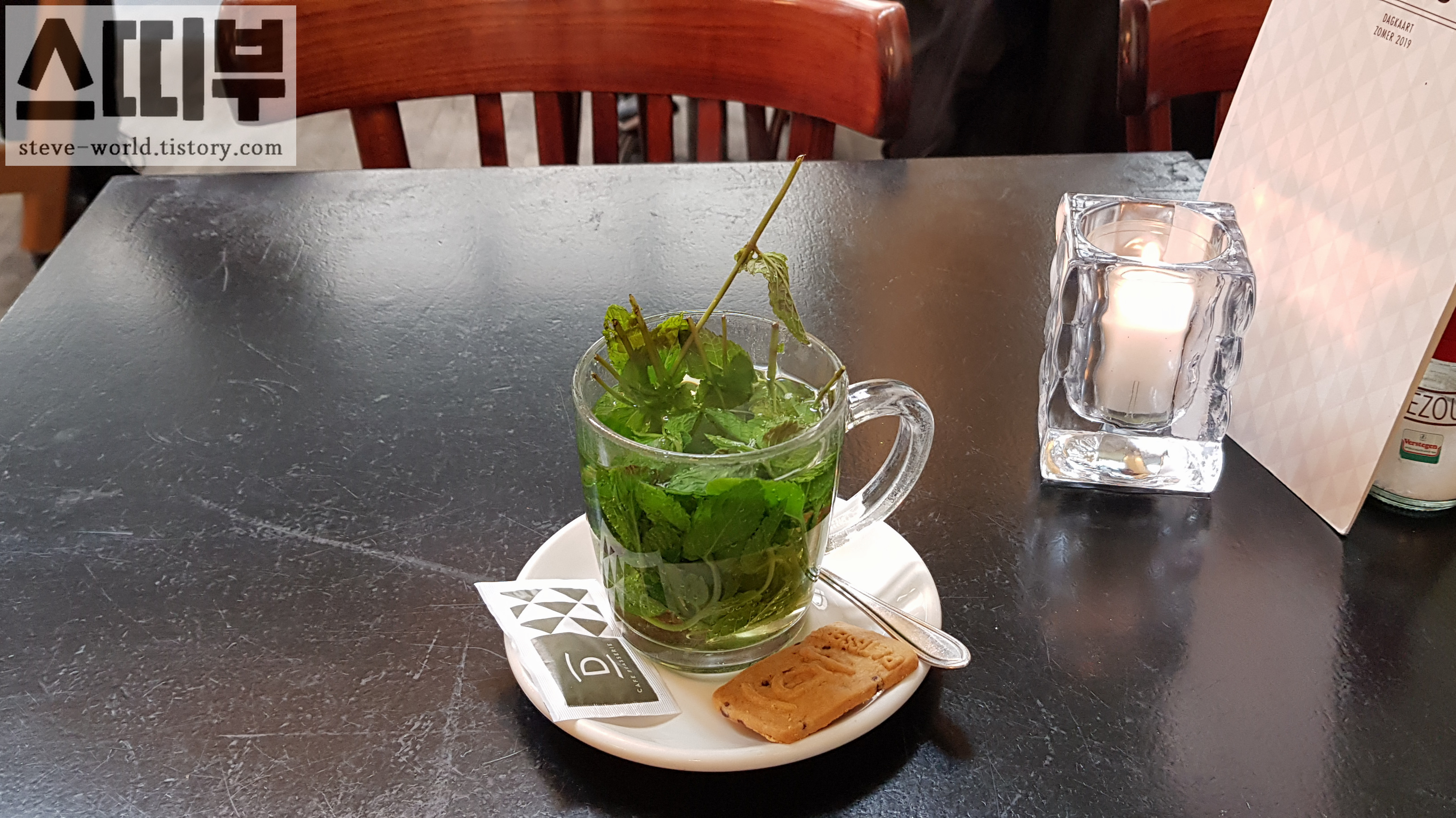 민트의 생잎을 넣은 민트티입니다. 일반 티백으로 마시는 민트티 보다 진하진 않지만 생잎 특유의 은은한 향이 참 좋습니다. 티백처럼 과하게 우러나오지 않아, 우려낸 시간이 길어도 일정한 향과 맛을 유지할 수 있었습니다. 투명한 유리잔에 가득한 민트 생잎은 비주얼도 좋고, 향도 좋습니다. 초록 초록한 색이 돋보입니다.